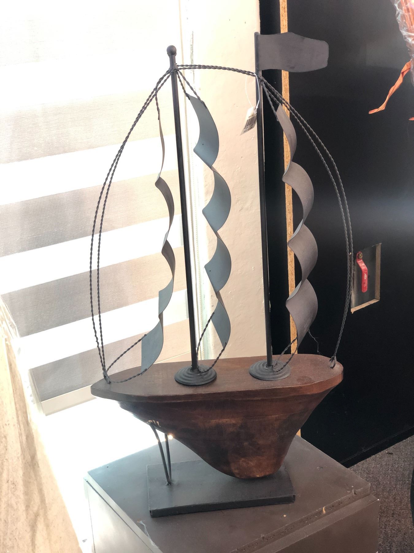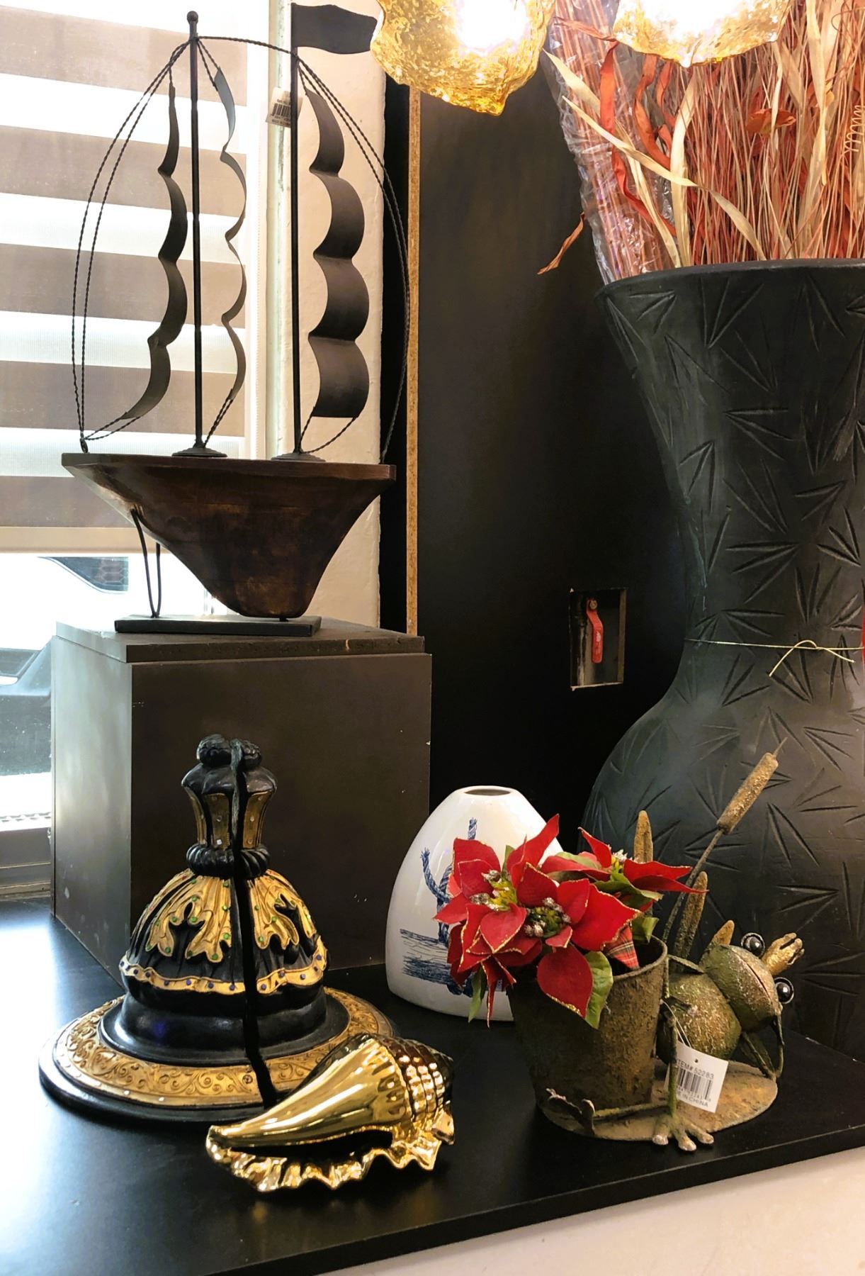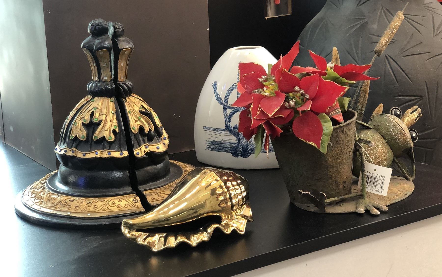 Group of assorted decorative items - includes wood and metal ship/vase/etc.