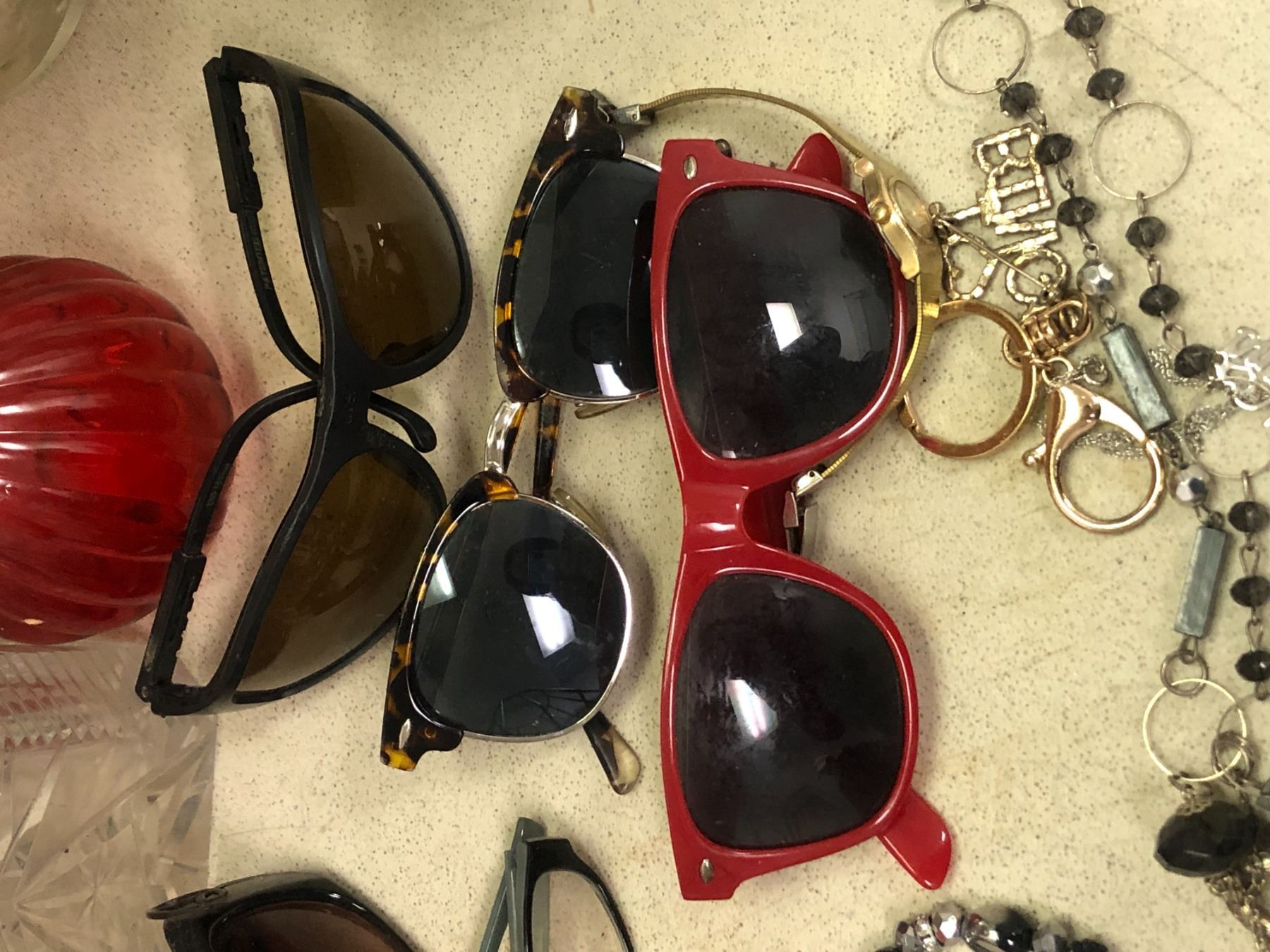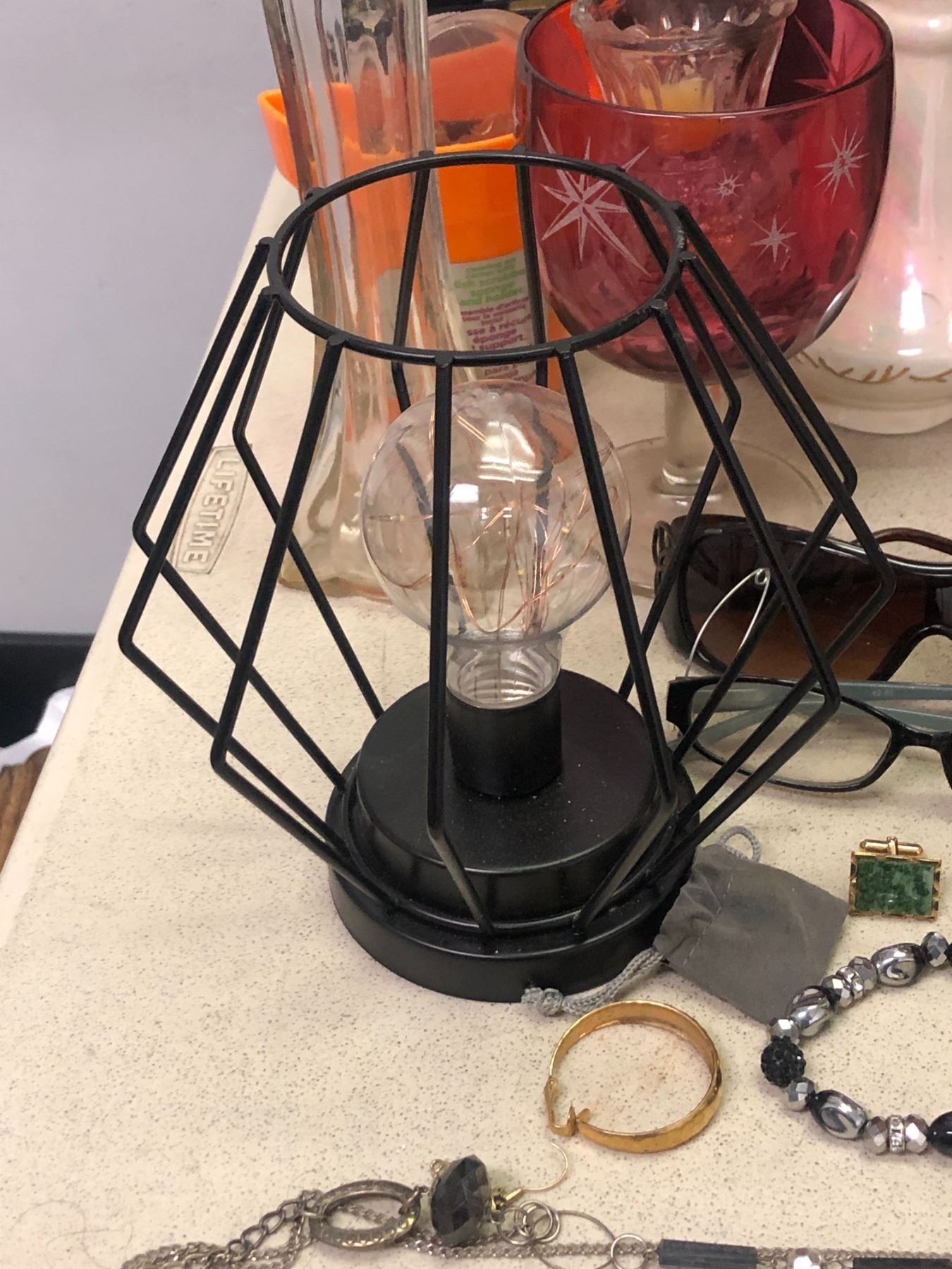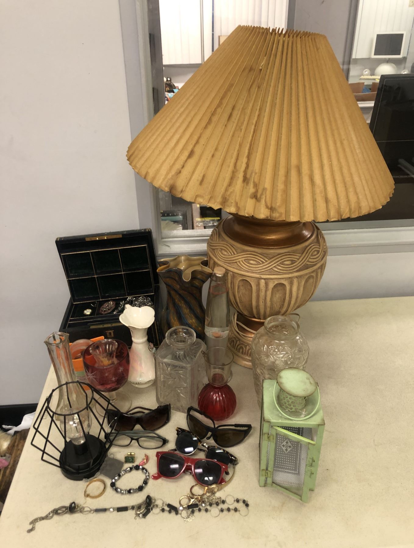 Group of assorted decorative items - includes wood carved table lamp / vases / sunglasses etc