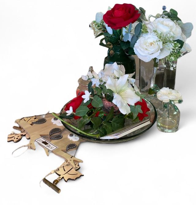 Group of assorted decorative vases with artificial plants etc.