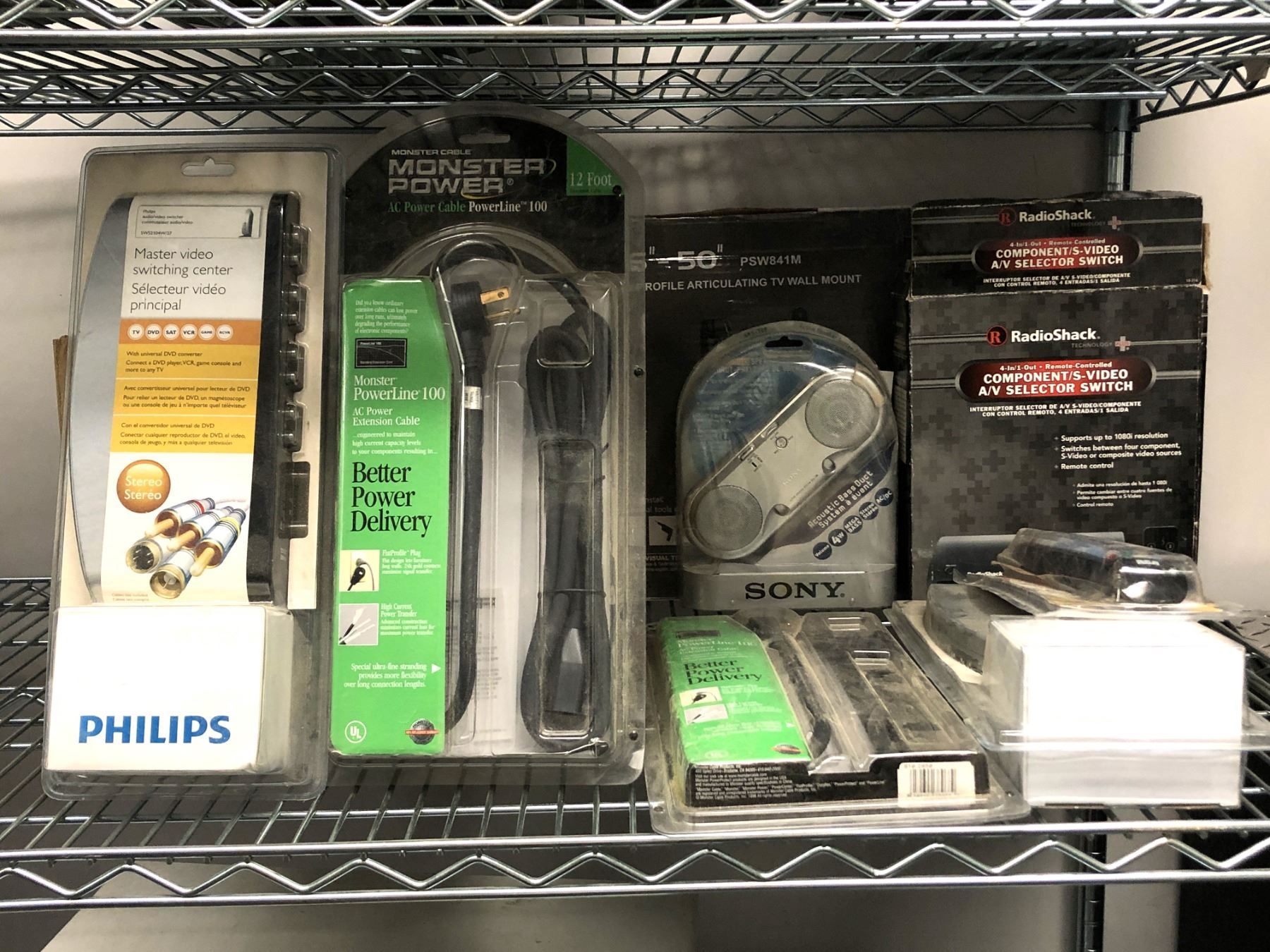 Group of assorted electronic items - includes Phillips master video switching center / Low profile articulating TV wall mount / RCA universal TV remote etc