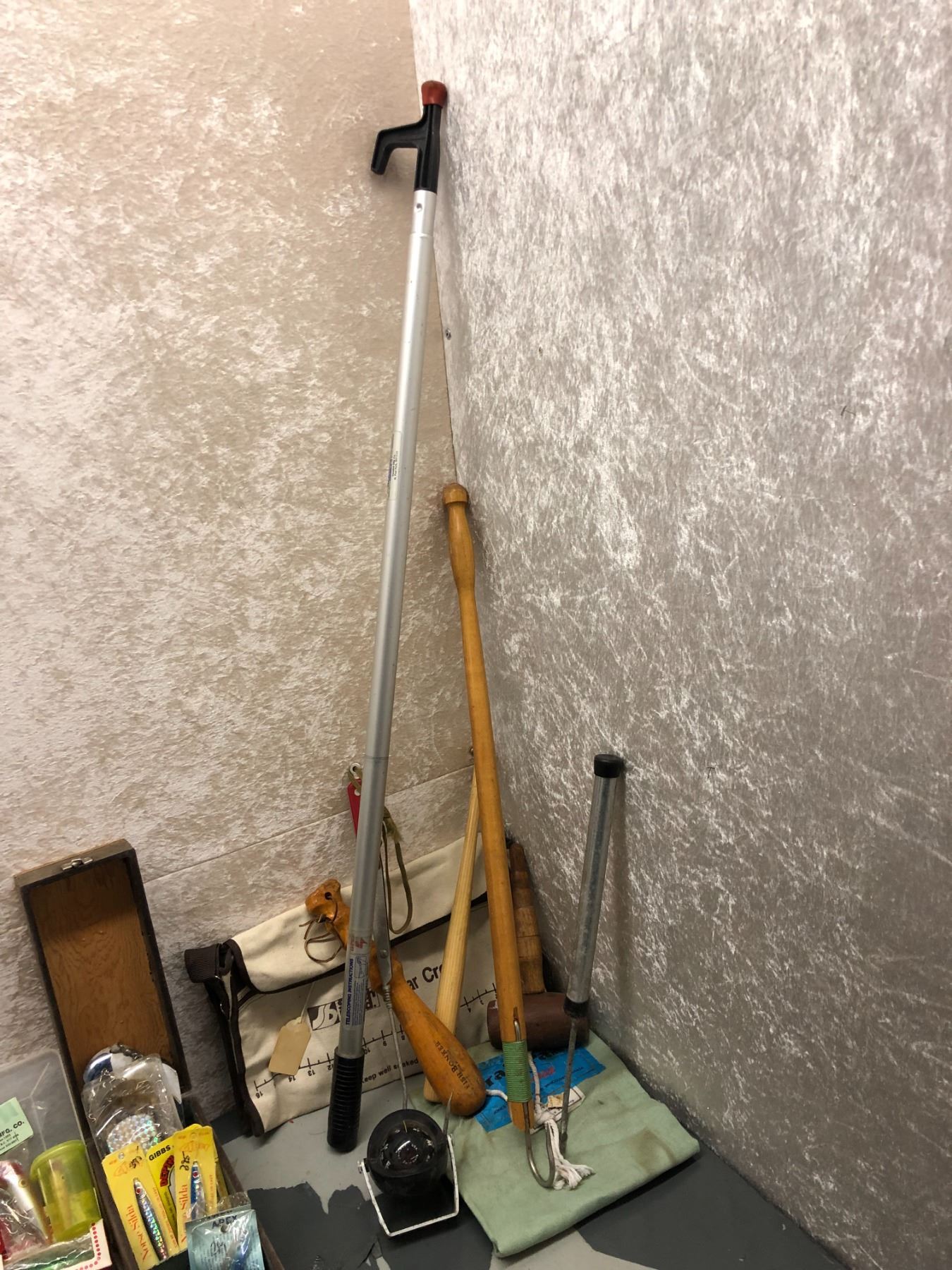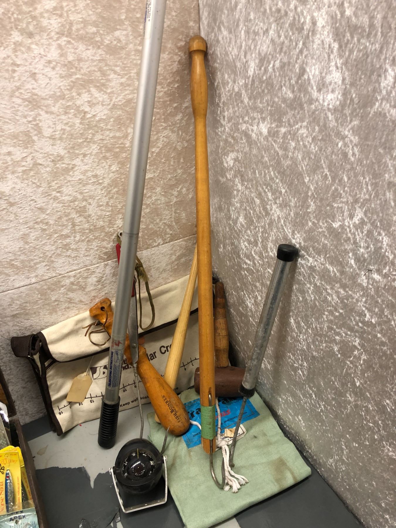 Group of assorted fishing related items - gaffs/ fish bonkers/ compass etc.