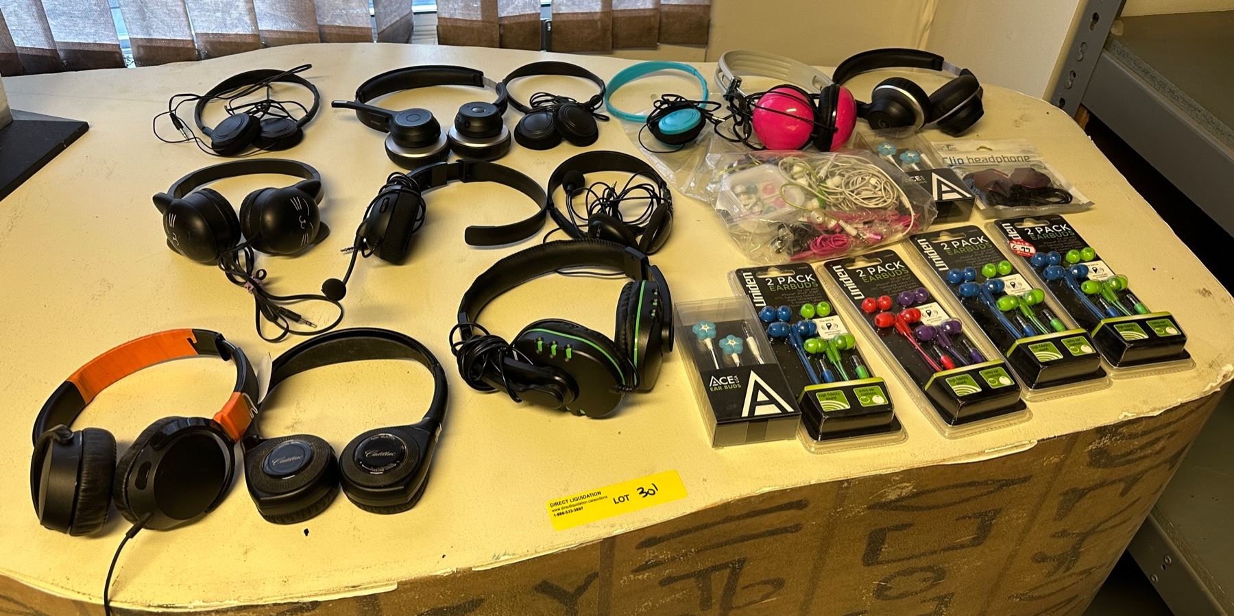 Group of assorted headsets & earbuds - includes on-ear gaming headsets / Uniden 2 pack earbuds etc