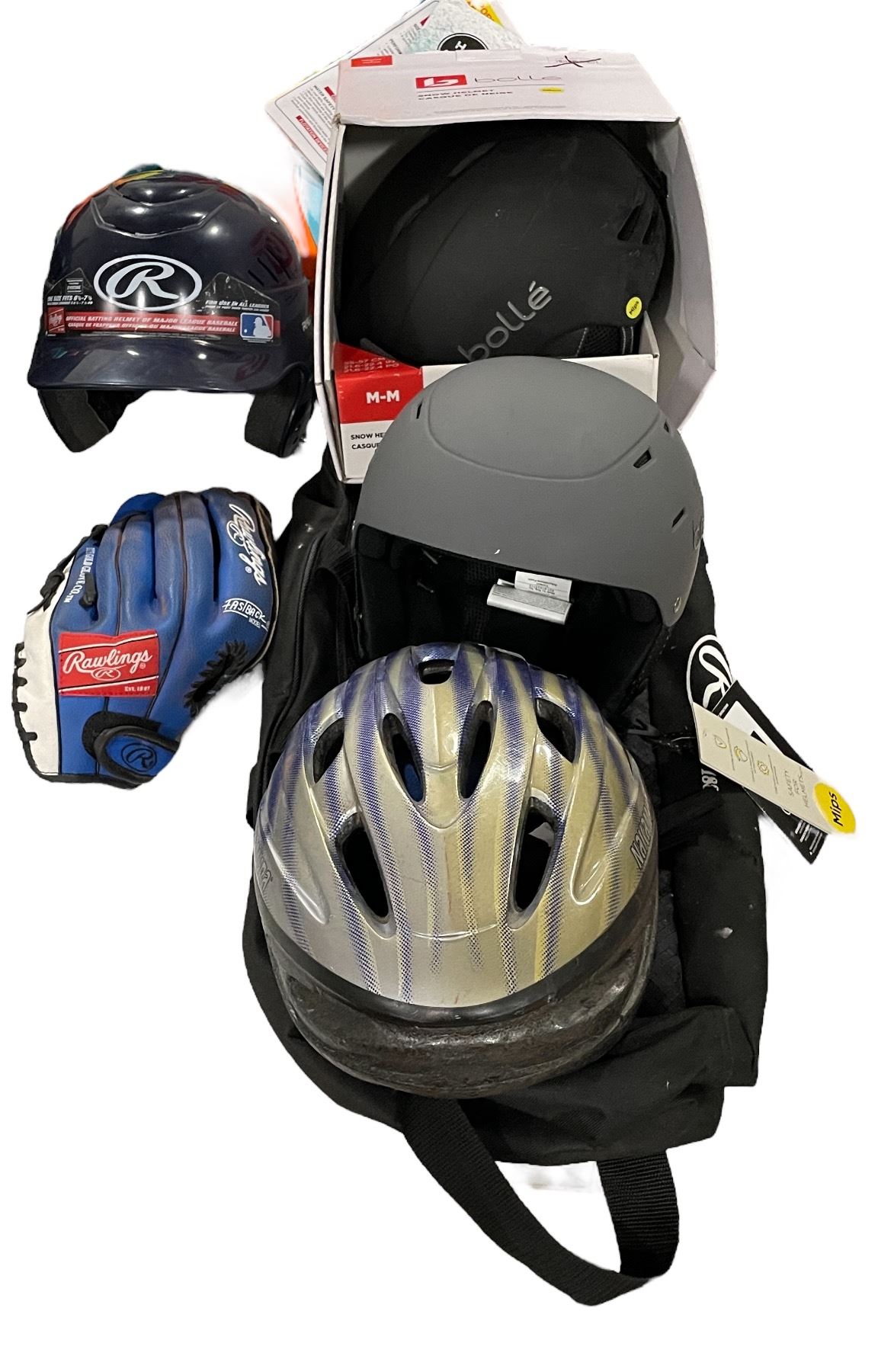 Group of assorted helmets & Rawlings Baseball batting helmet & glove