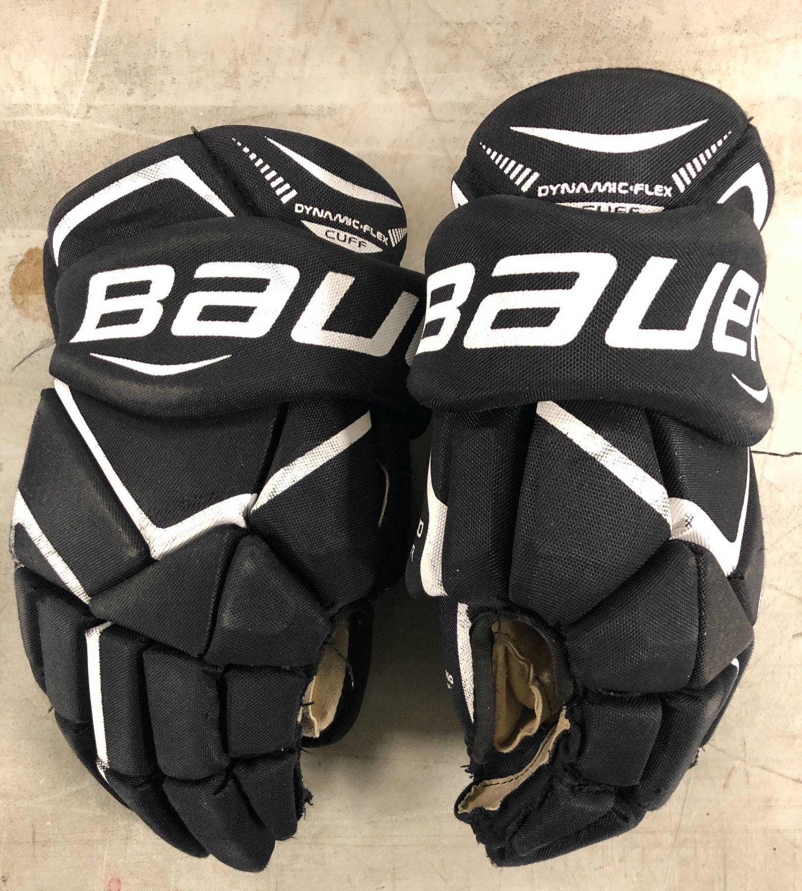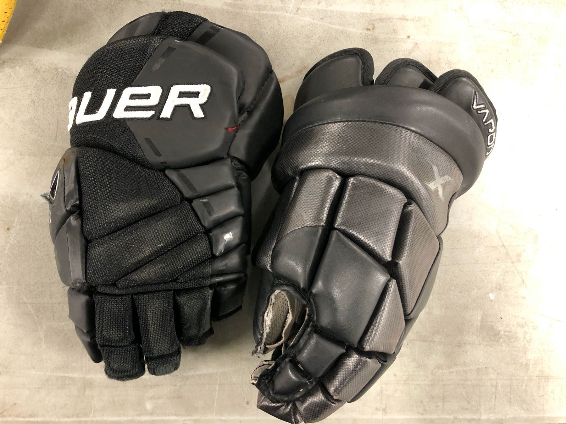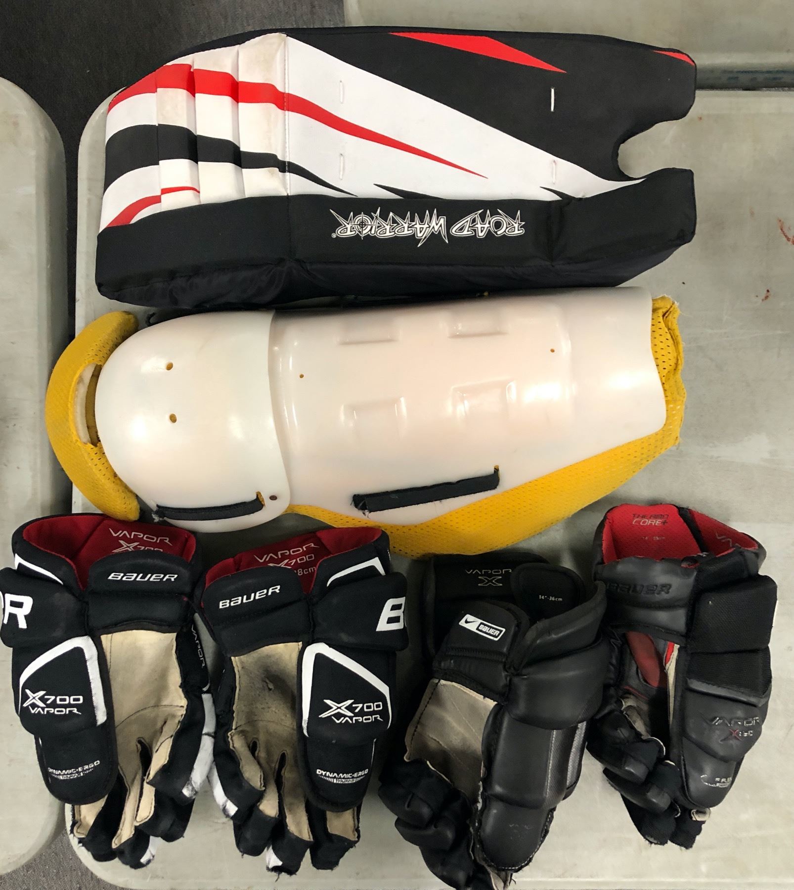 Group of assorted hockey items - includes Bauer 15" & 14" ice hockey gloves/ 1 shin pad/ 1 Road Warrior pad