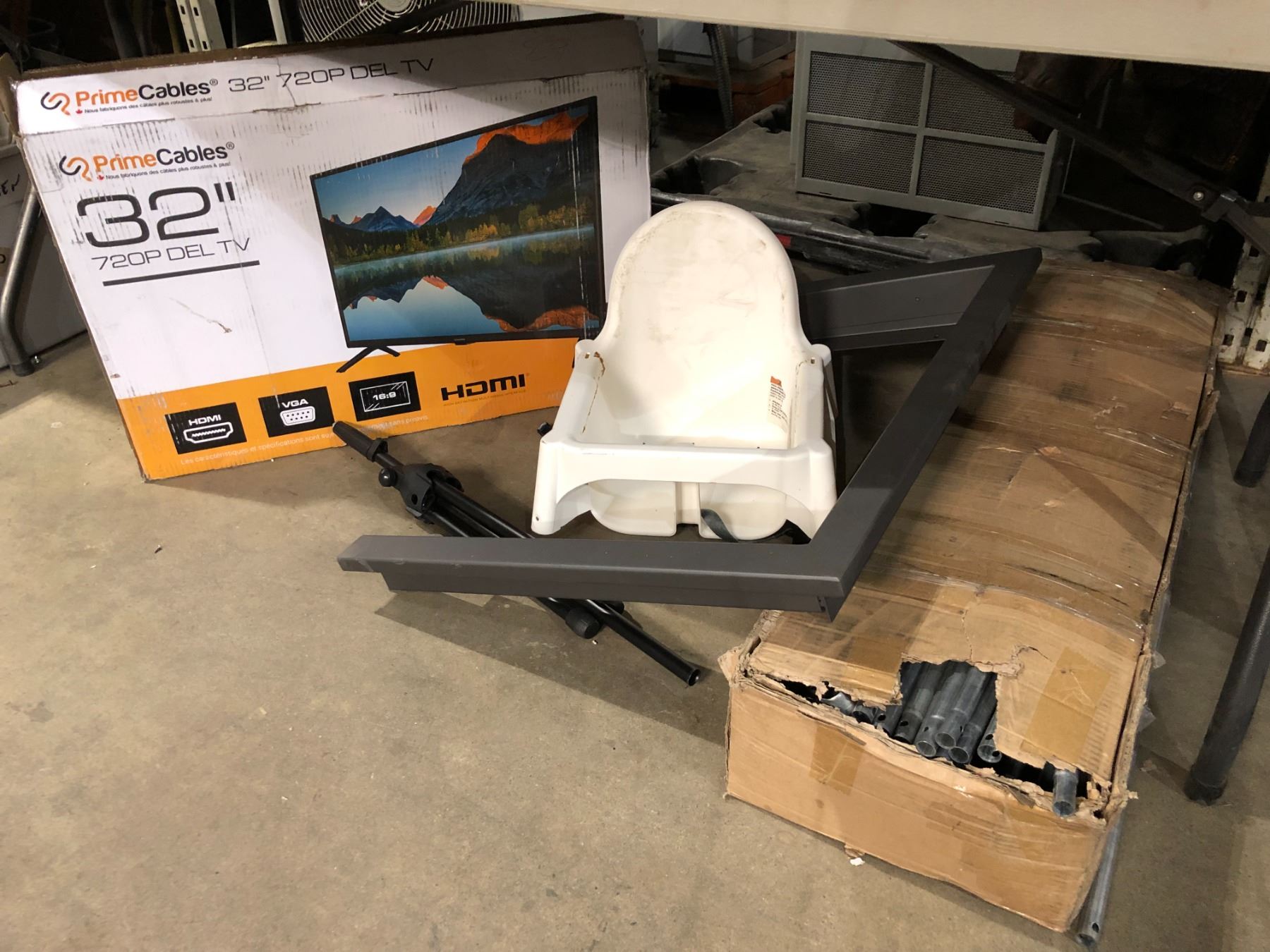 Group of assorted items 32" TV (not working)/child's booster seat & misc. metal poles (new store returned item)