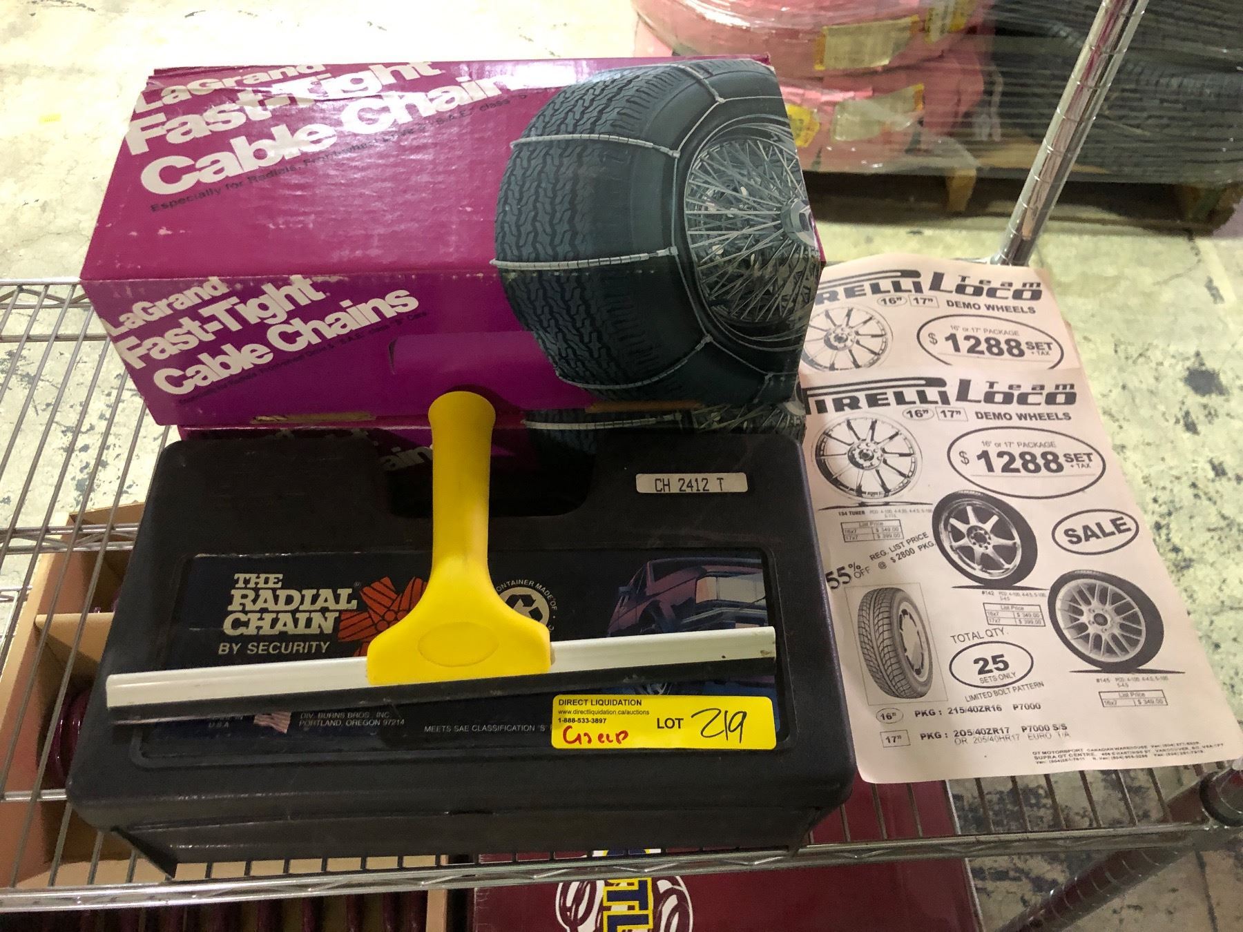 Group of assorted items - The Radial Chain tire chain/ LaGrand Fast-Tight cable chains x 2 boxes & vintage tires flyers/price list