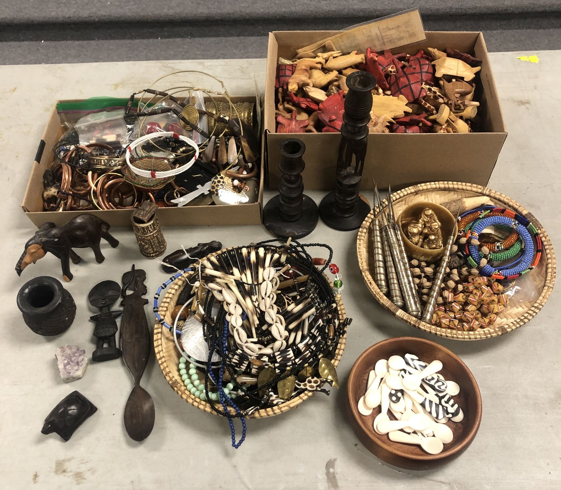 Group of assorted items - includes African beaded necklaces / striped boned spoons / glass bead bracelets / hand carved mini animal sculptures / bracelets etc