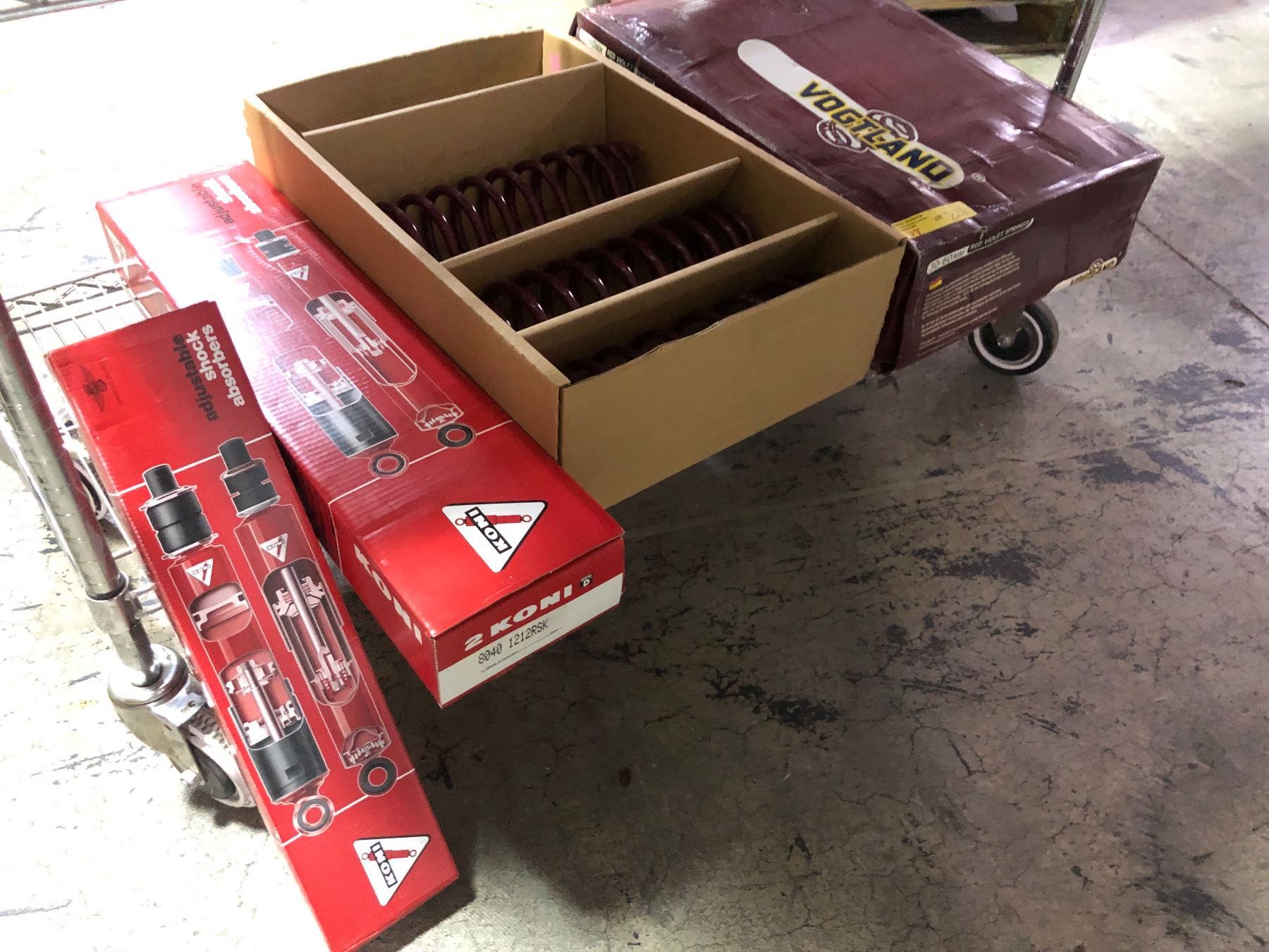 Group of assorted items - includes Koni adjustable shock absorbers (new in boxes)/ Vogtland 30-60mm red violet springs (new old stock with box)