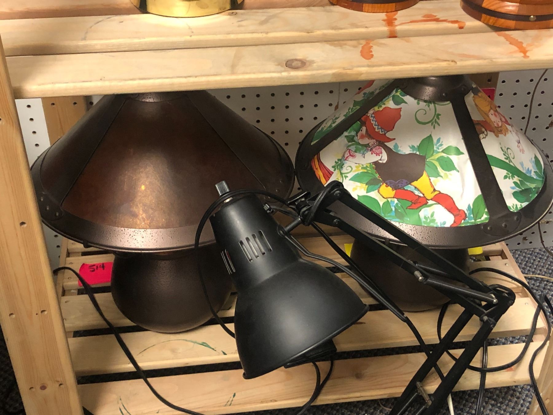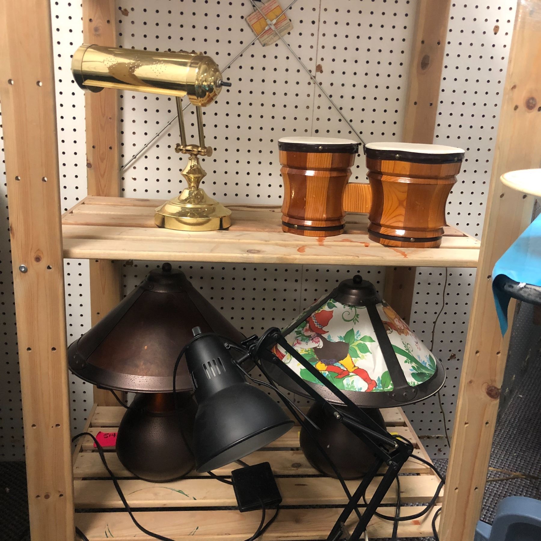 Group of assorted items - includes table lamps / bongo drum / brass banker lamp etc