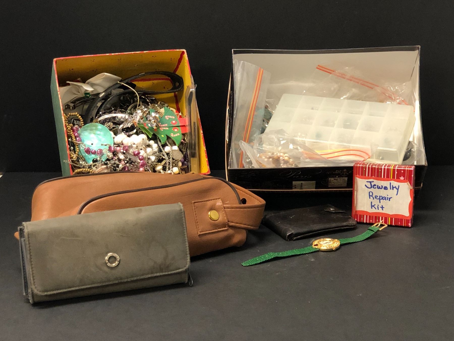 Group of assorted jewelry - includes bracelets / earrings / necklaces / repair kits / jewelry bags / wallets etc