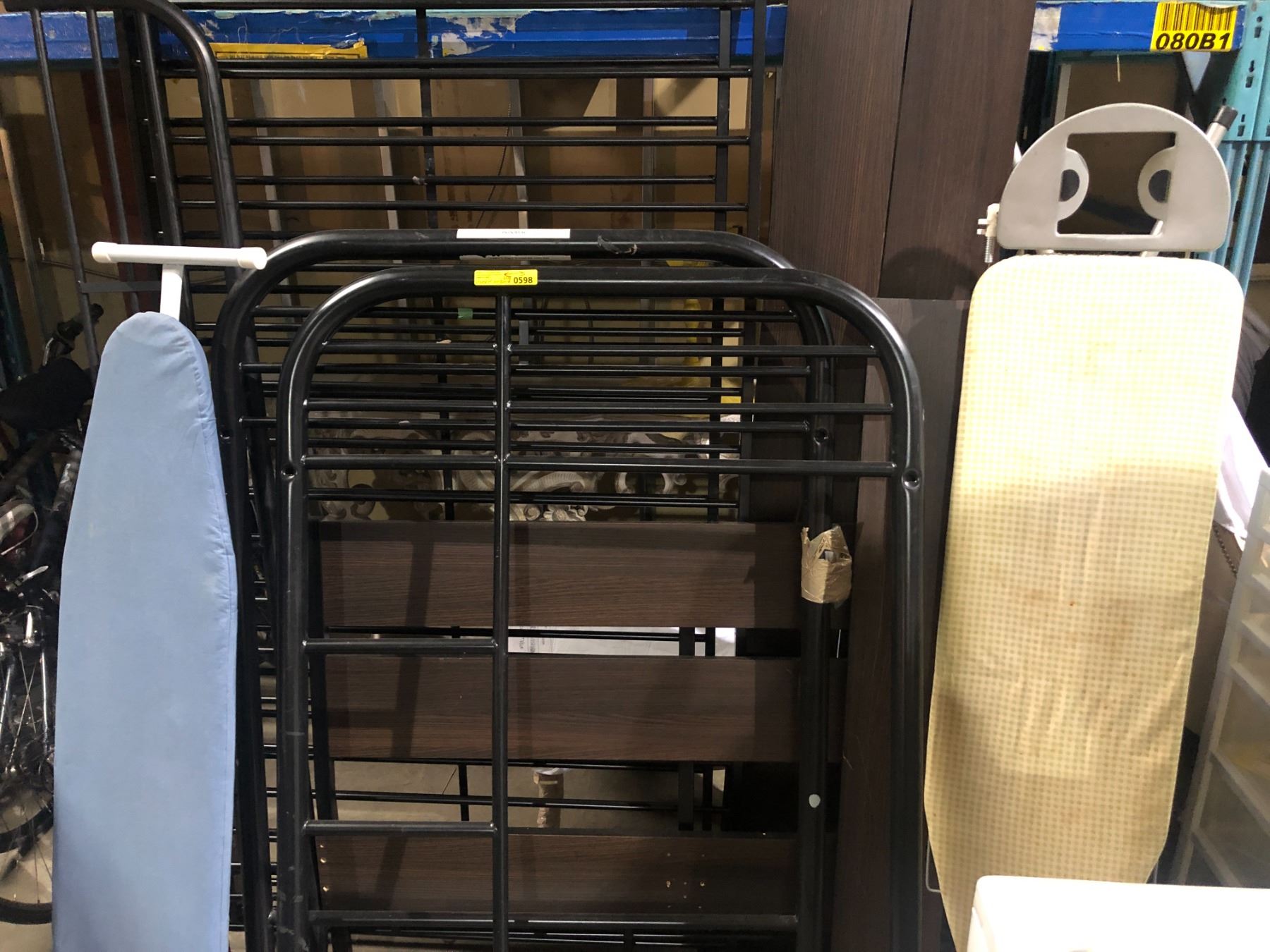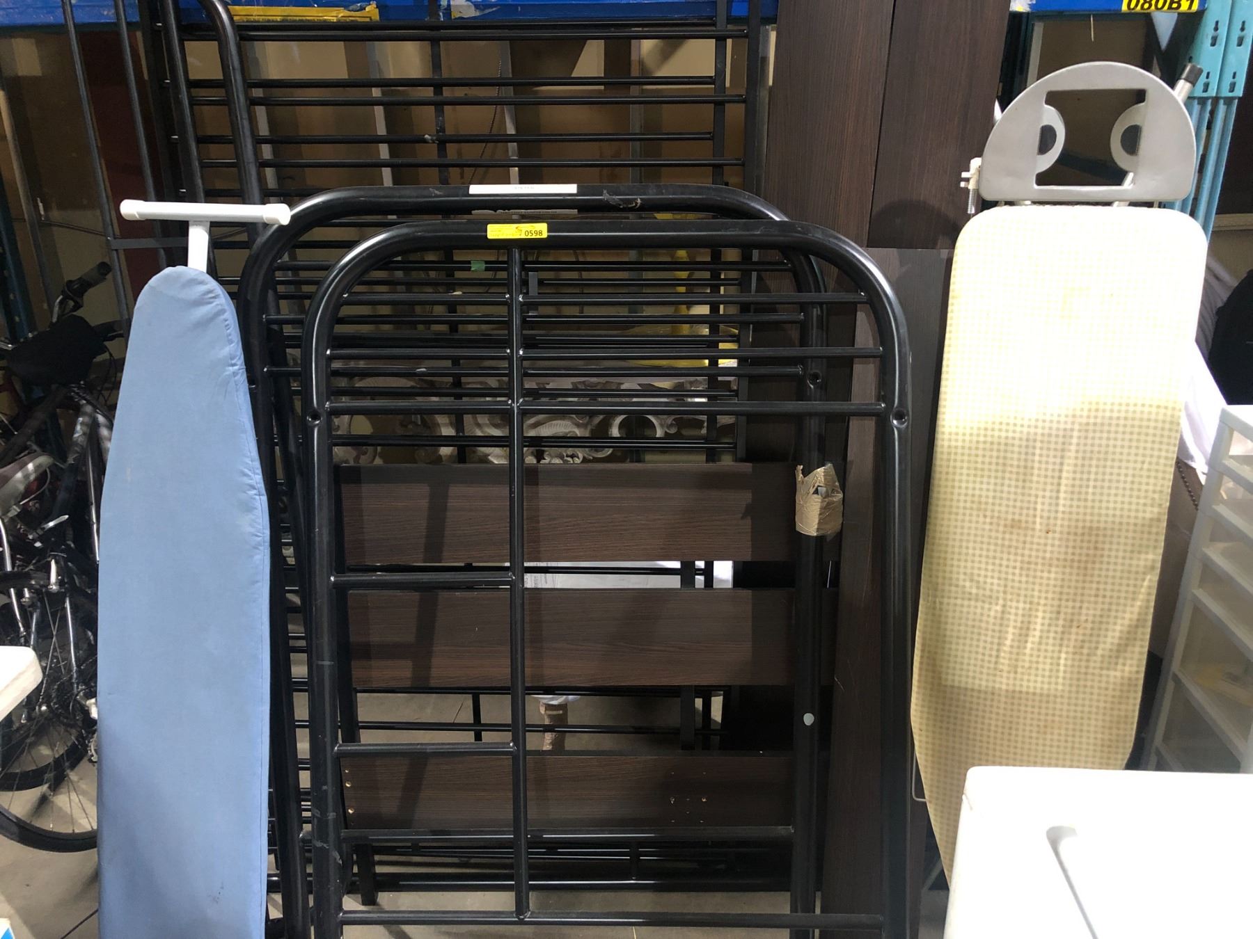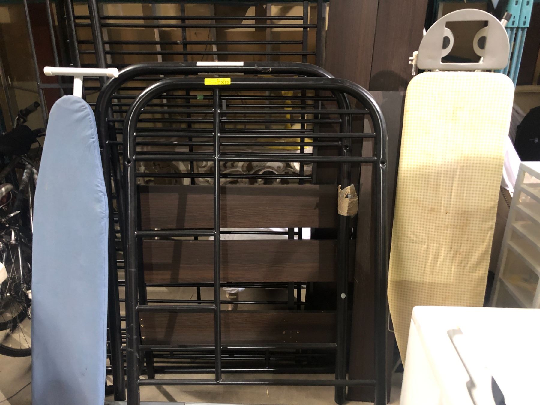 Group of assorted metal bed frame, wooden boards, ironing stand w/board, etc...