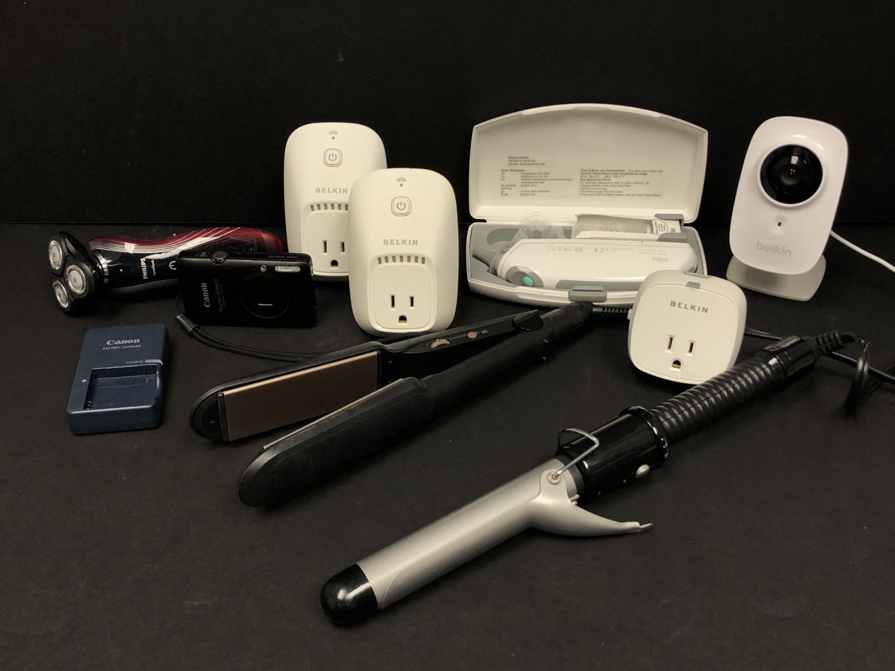 Group of assorted misc electronic items - includes Canon digital elph camera - SD940 IS / Braun ear thermoscanner / Conair hair straightener etc