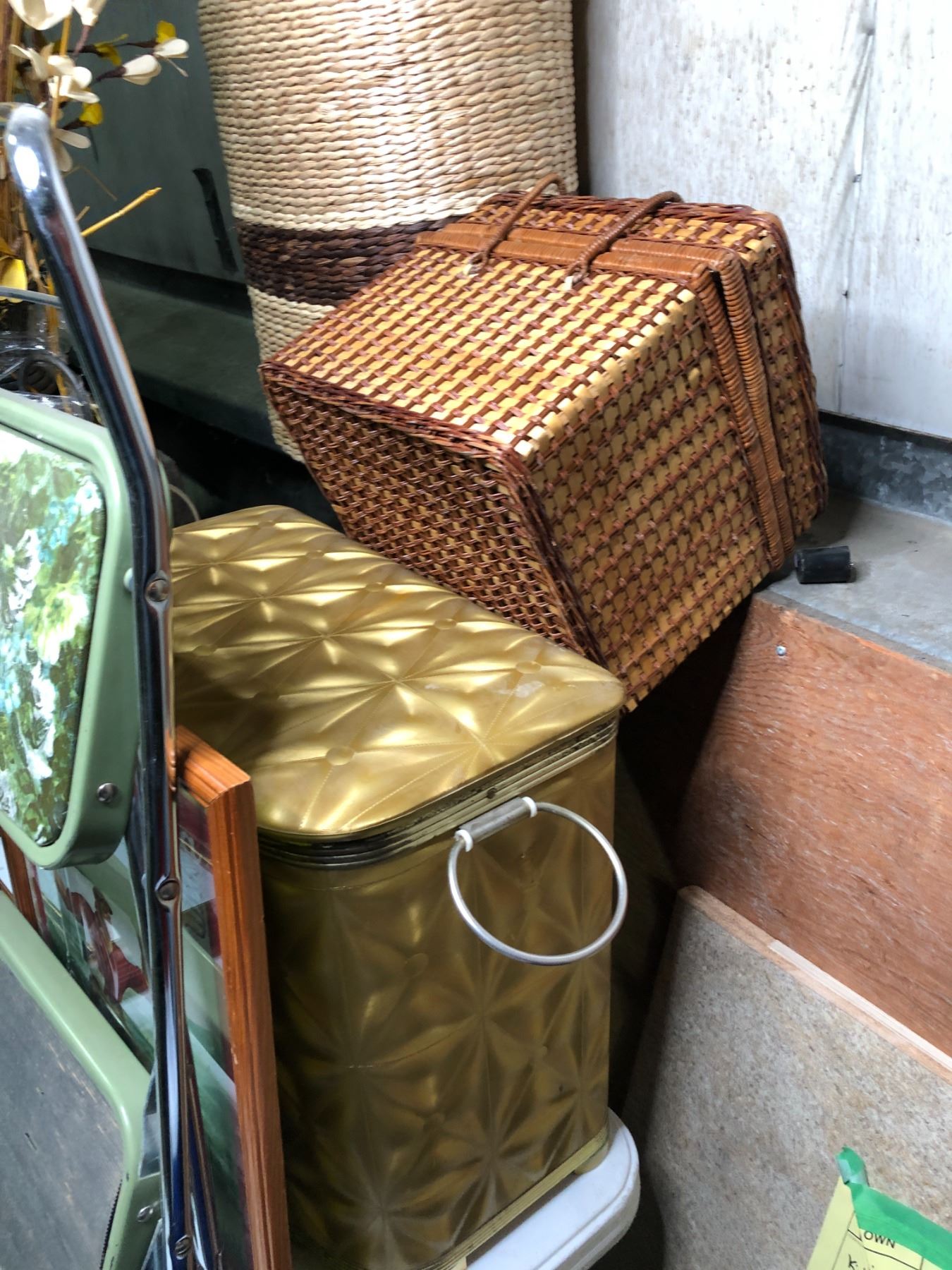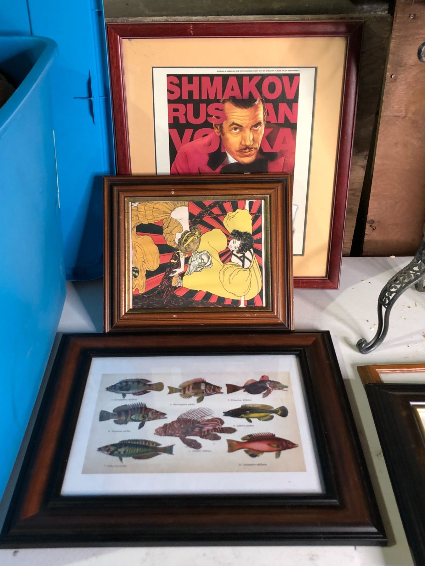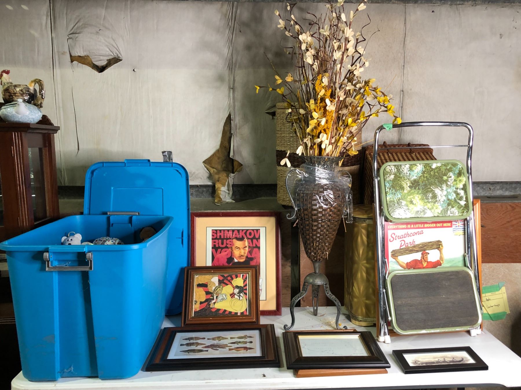 Group of assorted misc. set dec items - includes decorative framed wall hangings/ step ladder/ laundry baskets/ tote full of assorted stuffed toys etc.