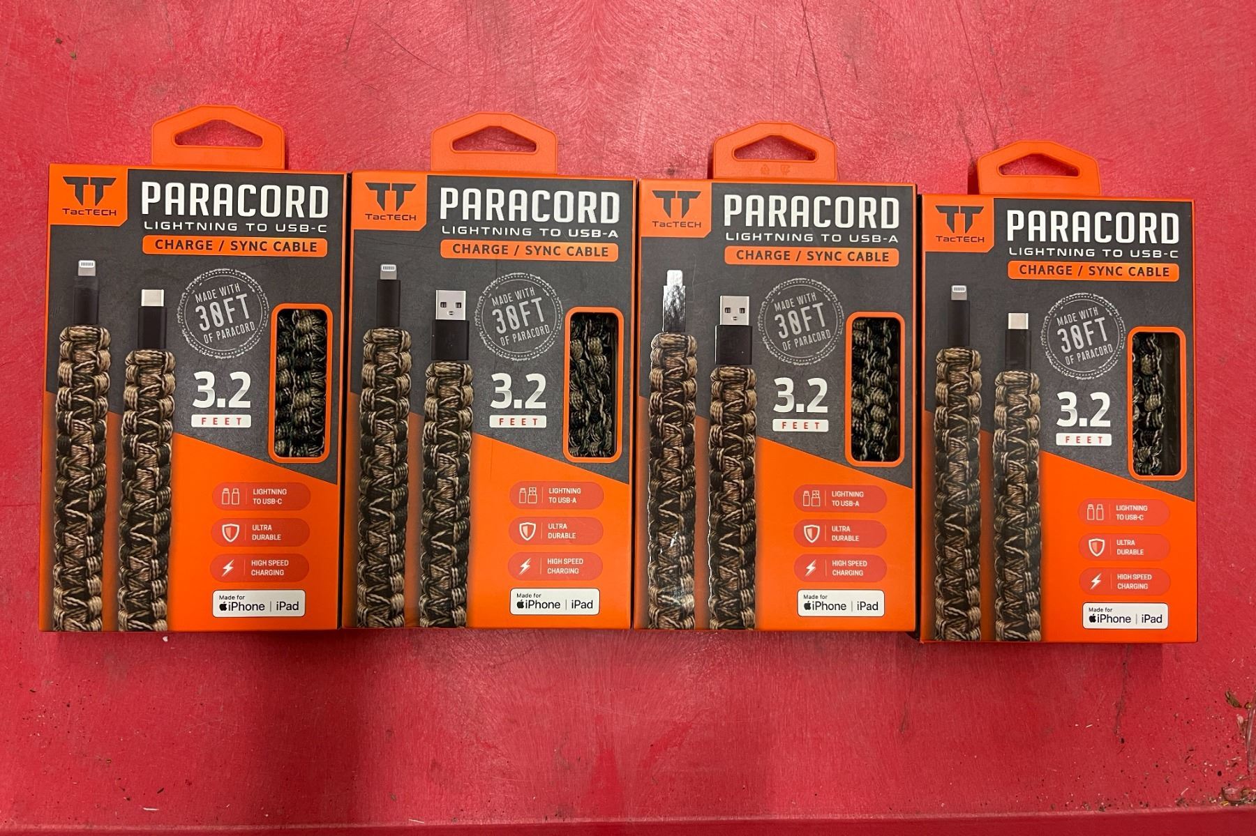 Group of assorted new TacTech phone cables - 2 Lightning to USB-C & 2 Lightning to USB-A cables