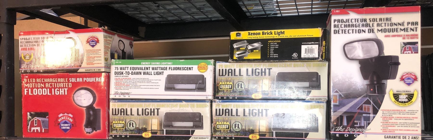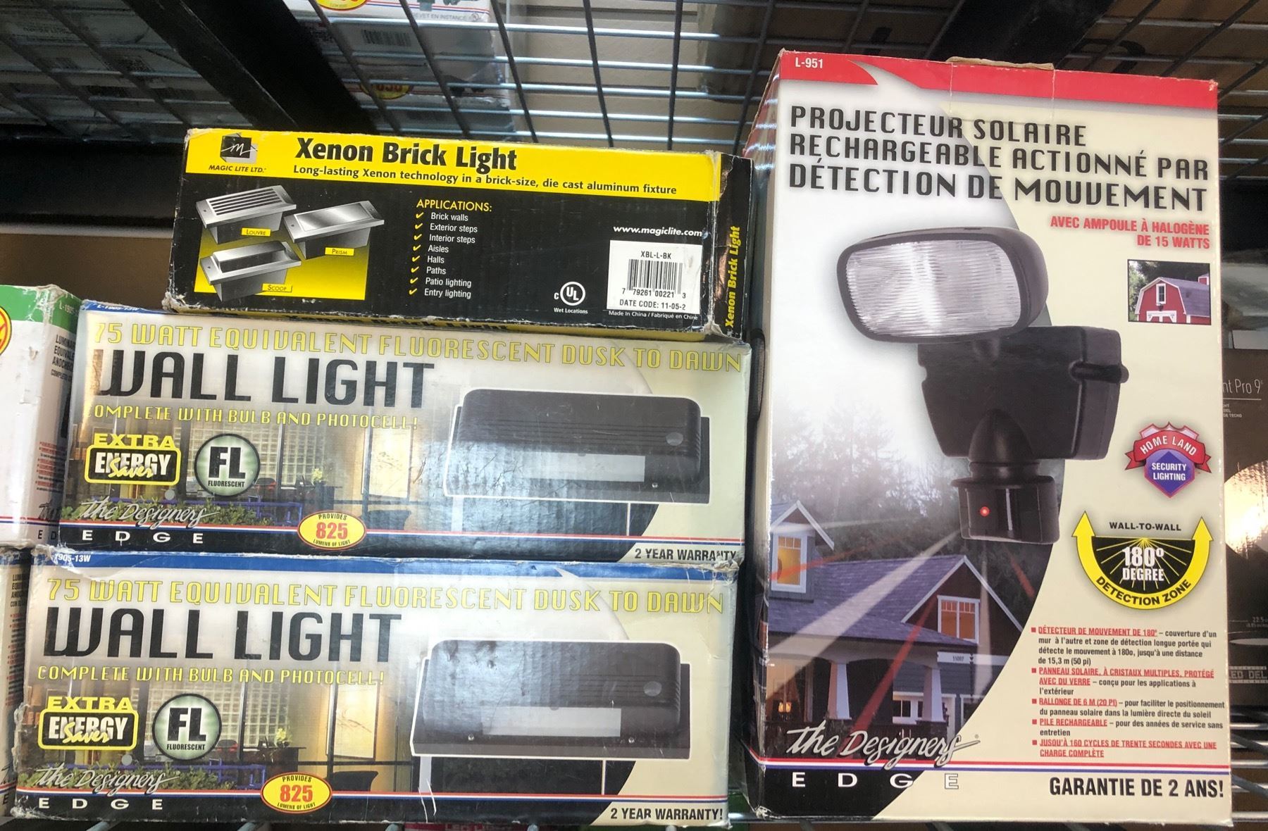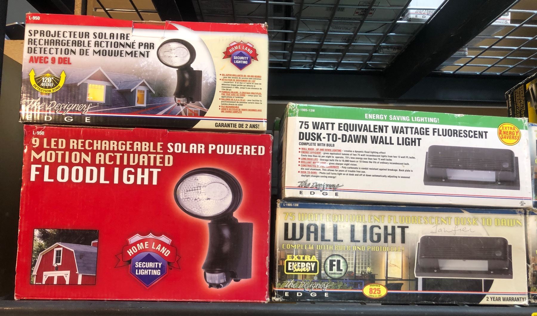 Group of assorted new lighting includes LED rechargeable solar power motion activated flood lights, wall lights, etc... (approx 12 pcs)