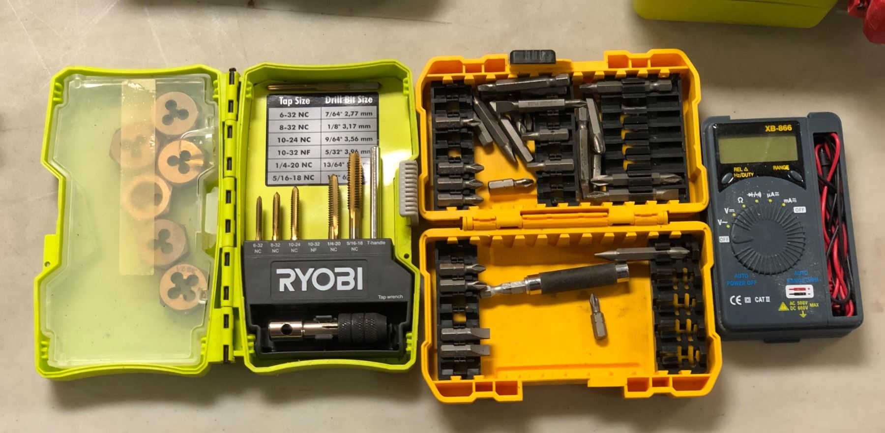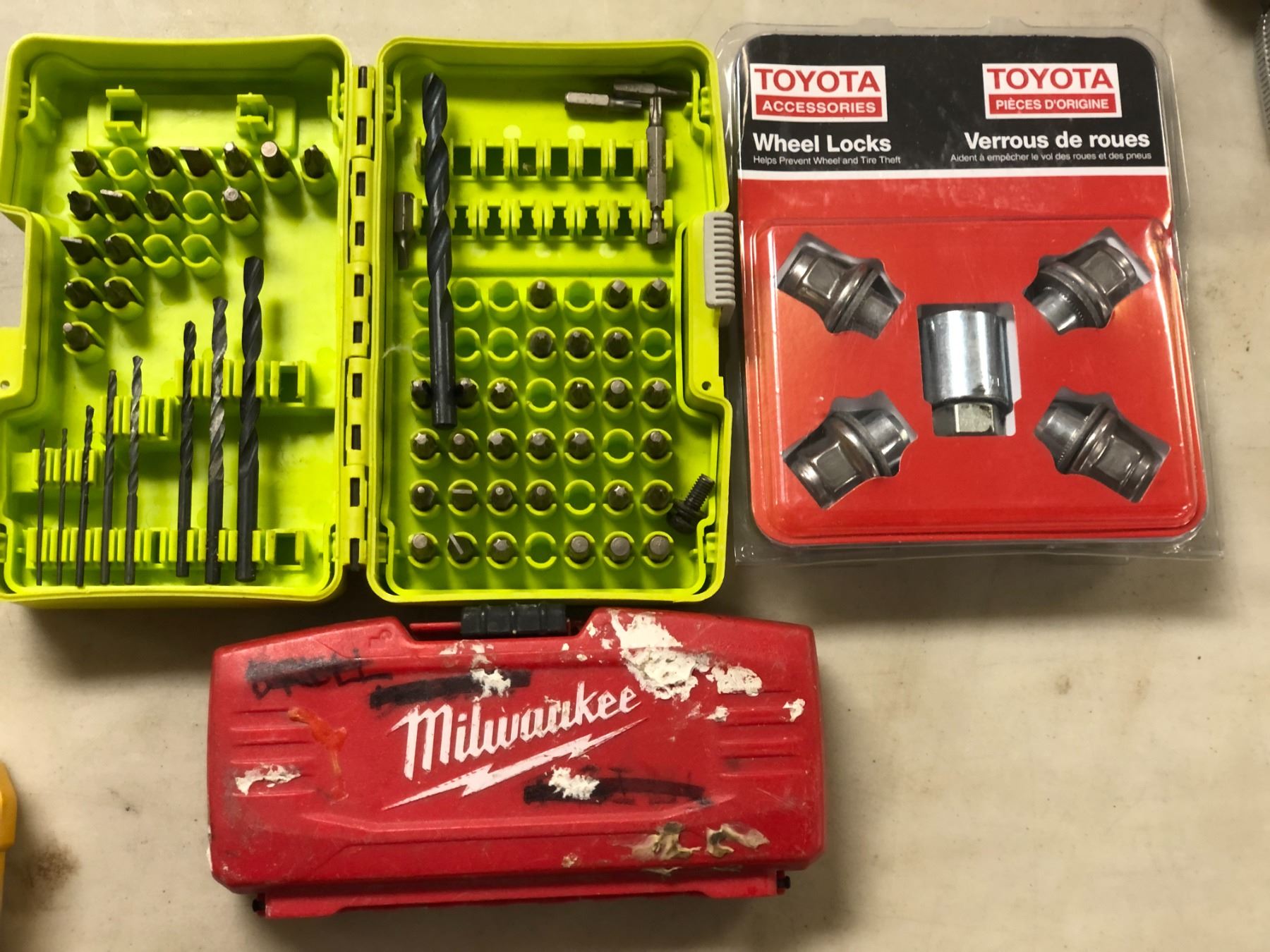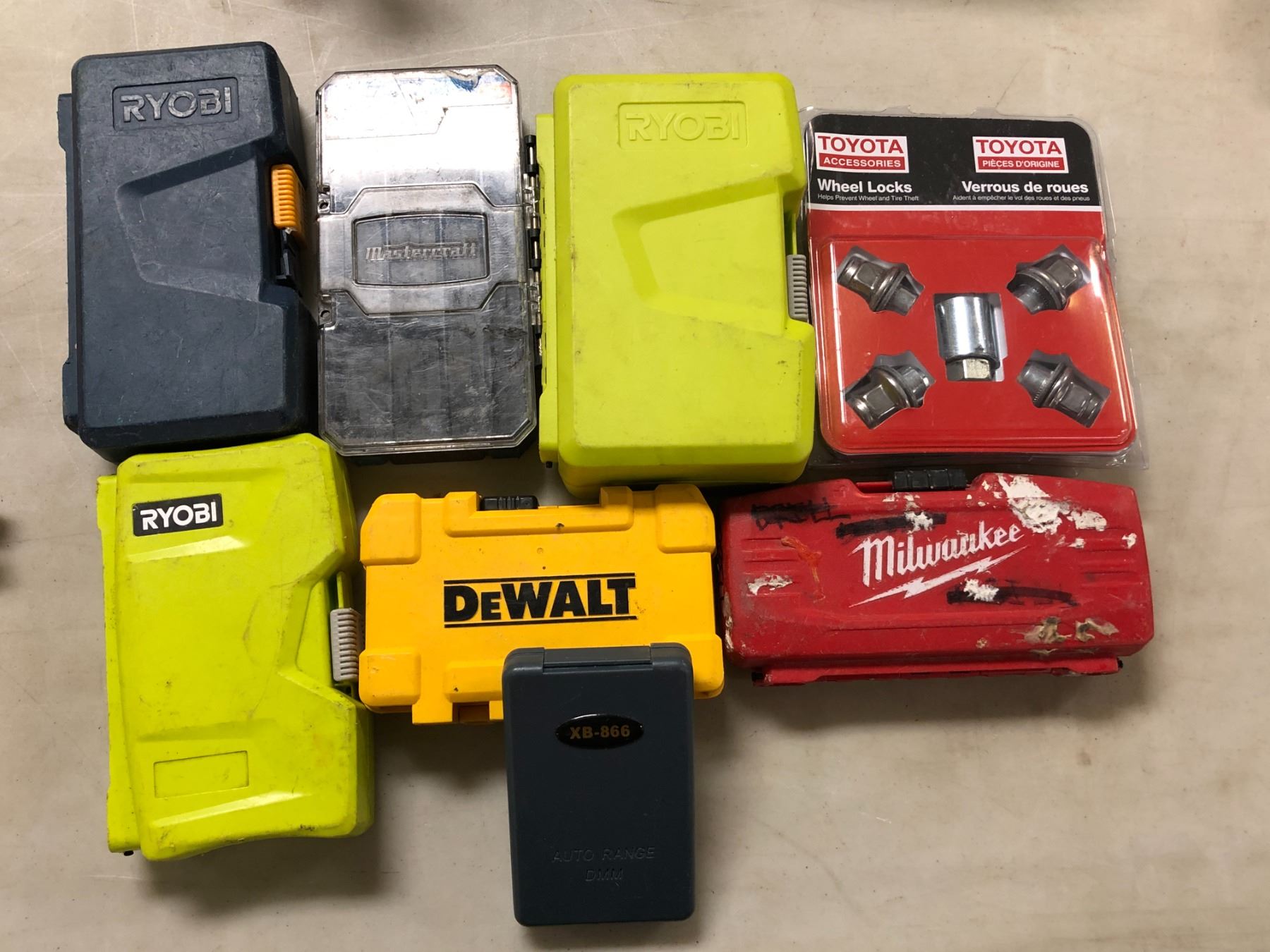 Group of assorted screwdriver sets, wheel locks & tool accessories - includes Dewalt set / Milwaukee set / Ryobi sets etc
