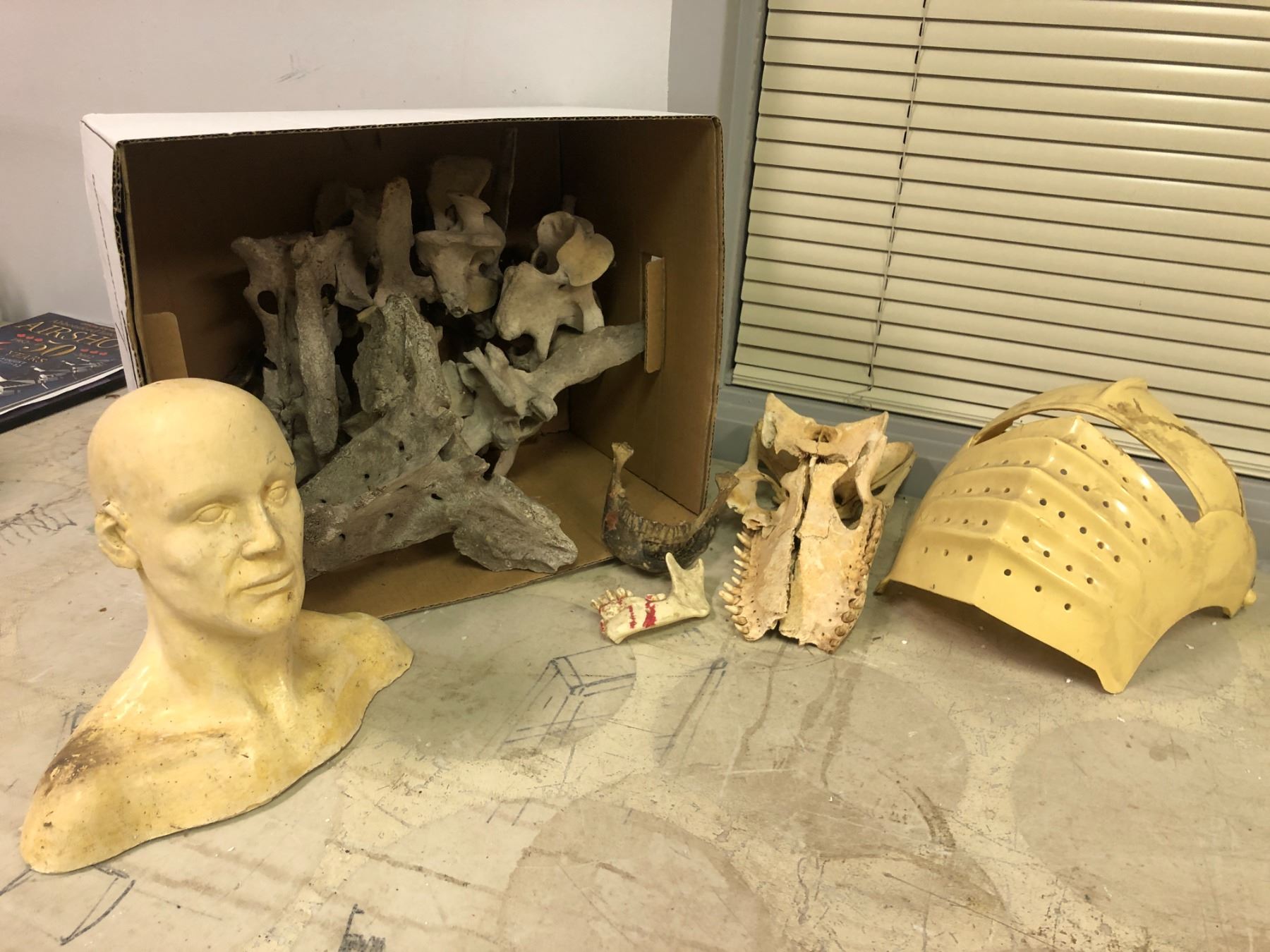 Group of assorted set dec props - includes assorted bones/plastic masks/human head sculpture etc.