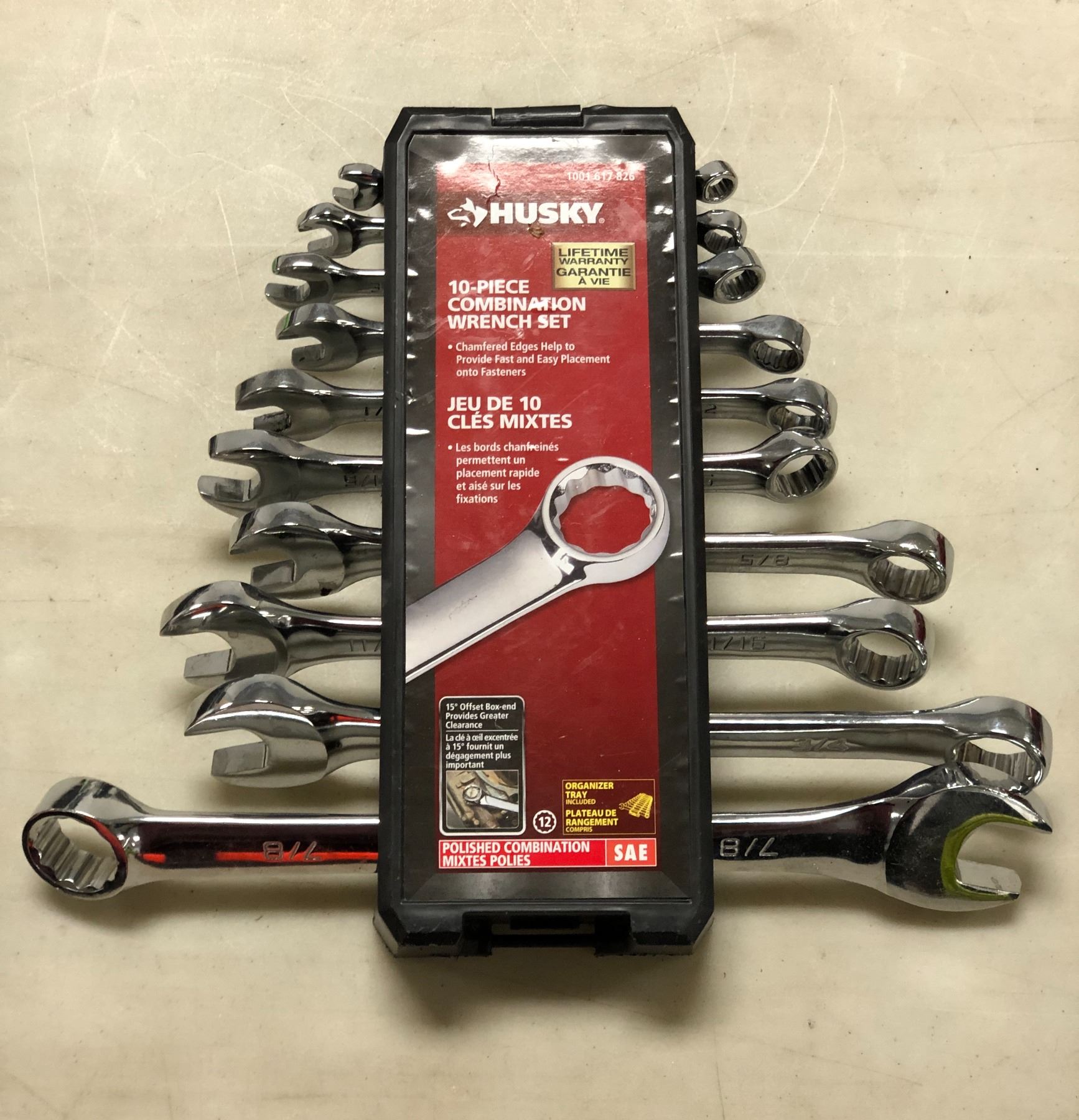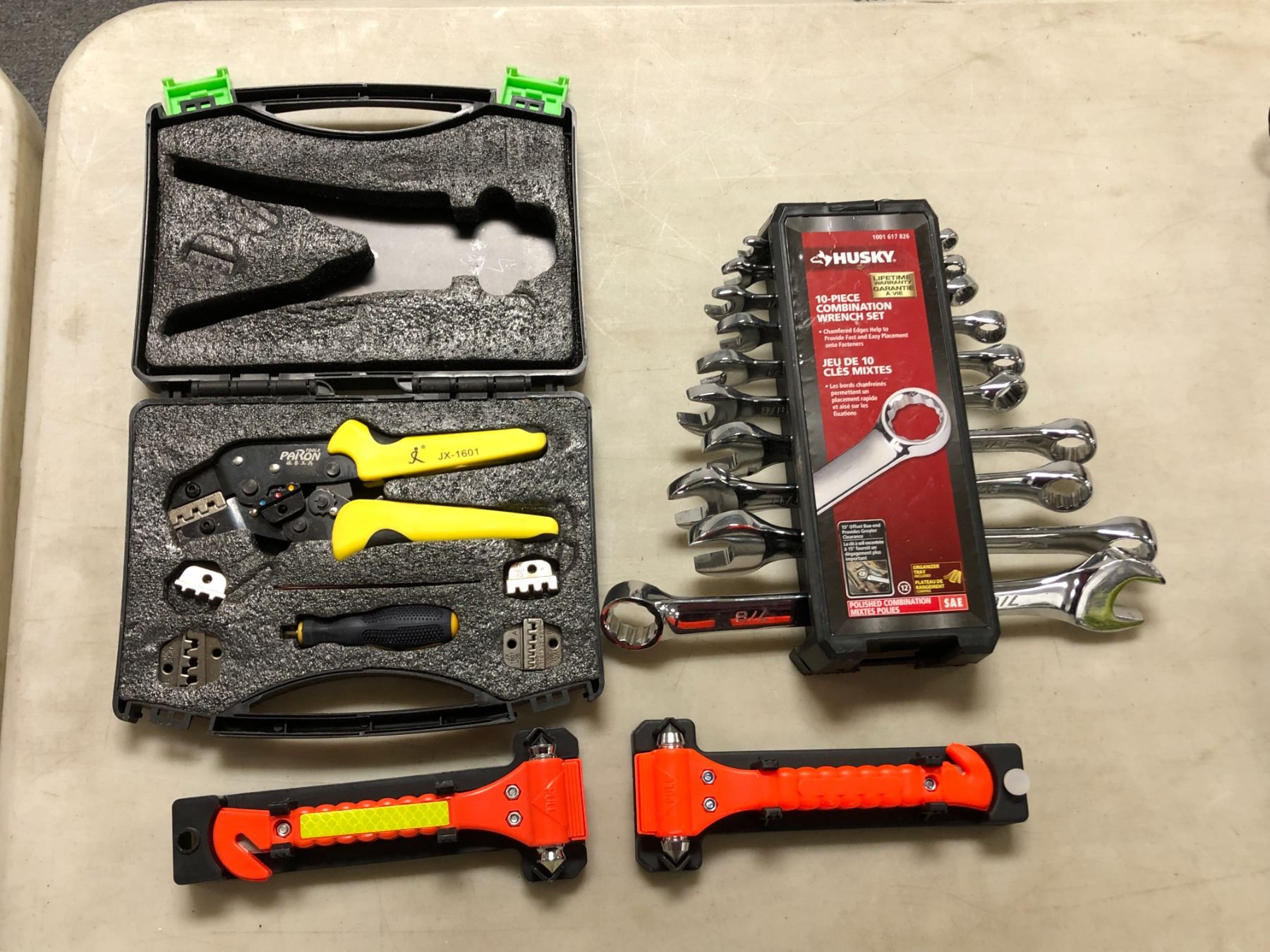 Group of assorted tool sets - includes NEW Husky 10-pc combination wrench set / Kriture car hammer escape tool & Paron tools set