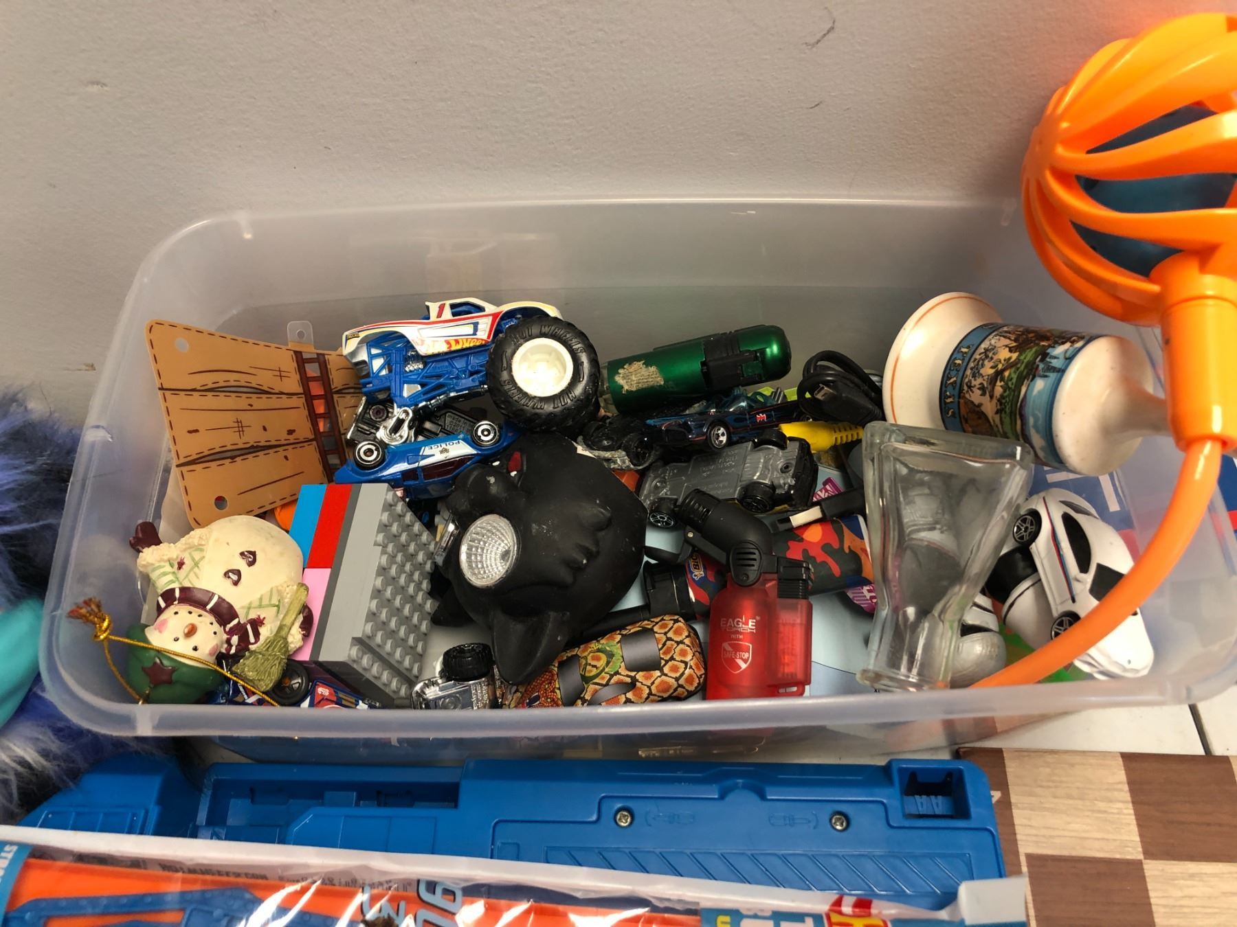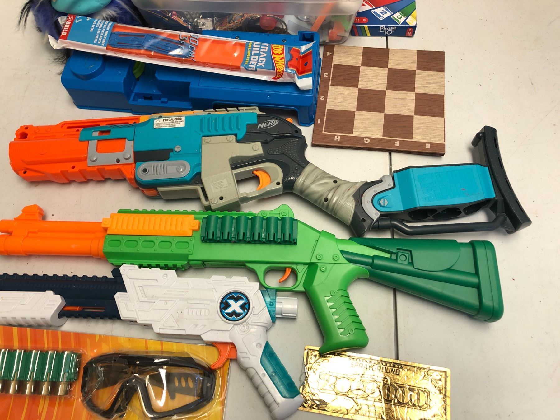 Group of assorted toys - includes Nerf guns w/ goggles & darts / SprayGround two million gold foil dollar bill / Hot Wheels etc