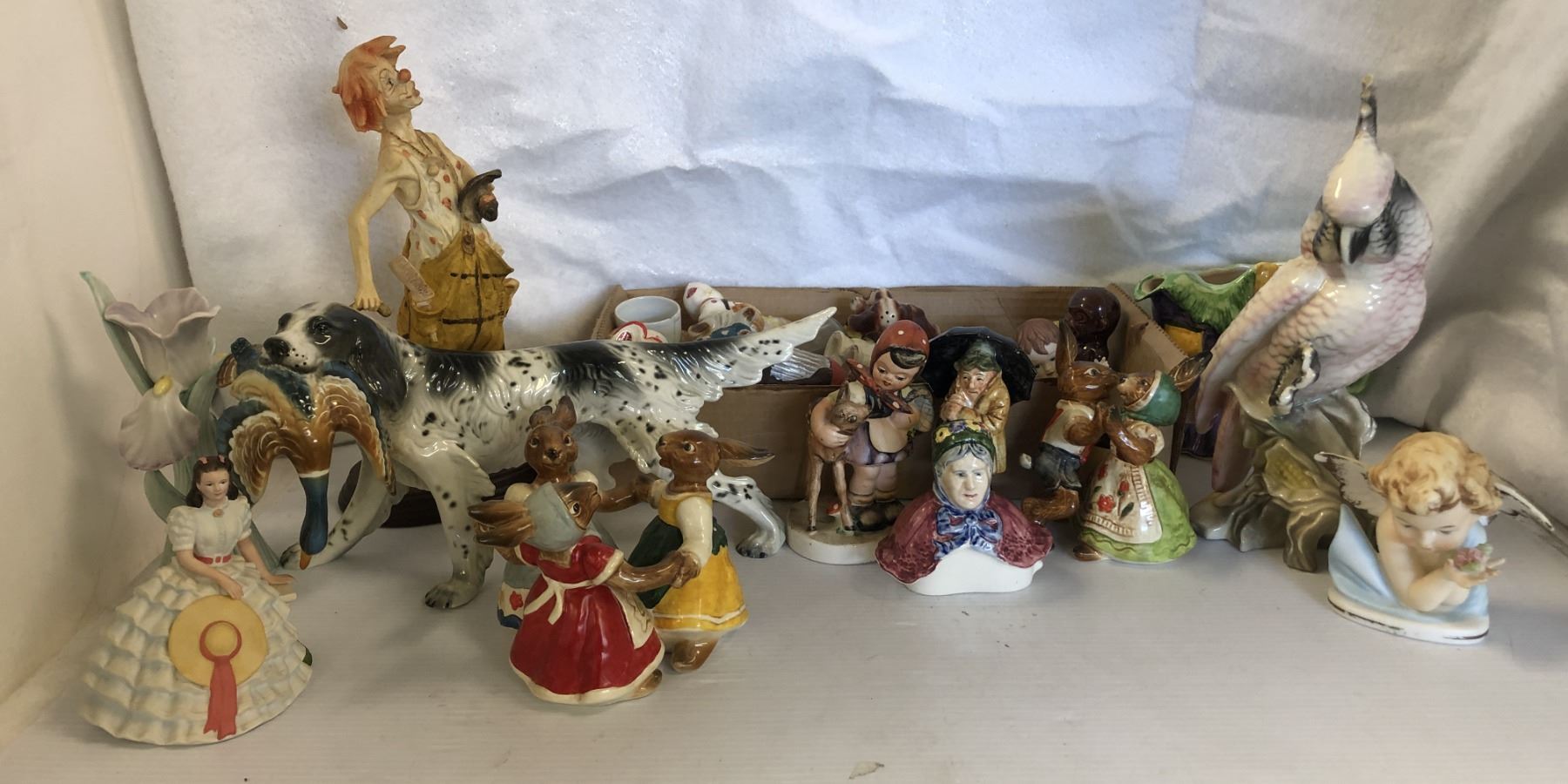 Group of assorted vintage estate ceramic decorative pcs and salt & pepper shakers - includes Pucci clown statue / English setter w/ bird in mouth / Goebel bunnies etc - approx 30 pcs