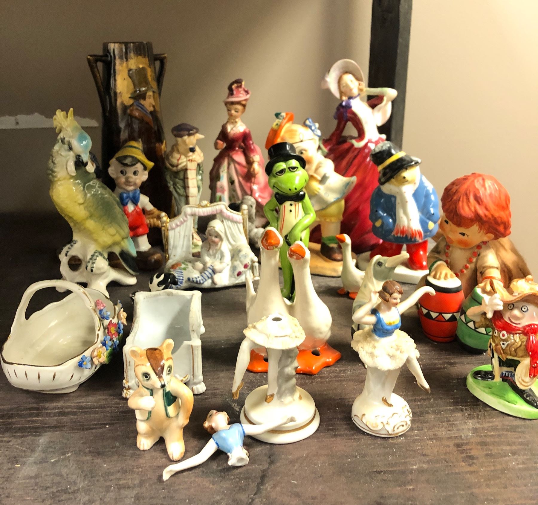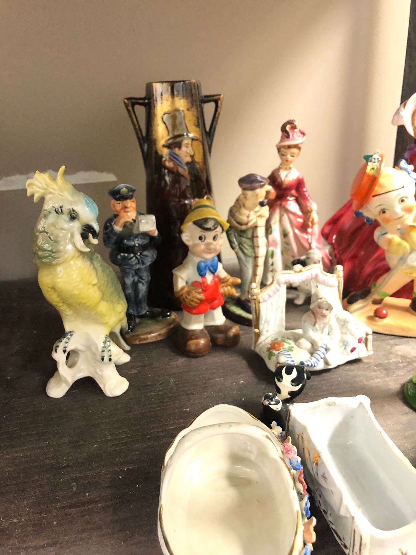 Group of assorted vintage estate ceramic figures - includes Pinocchio figures / Victorian lady etc