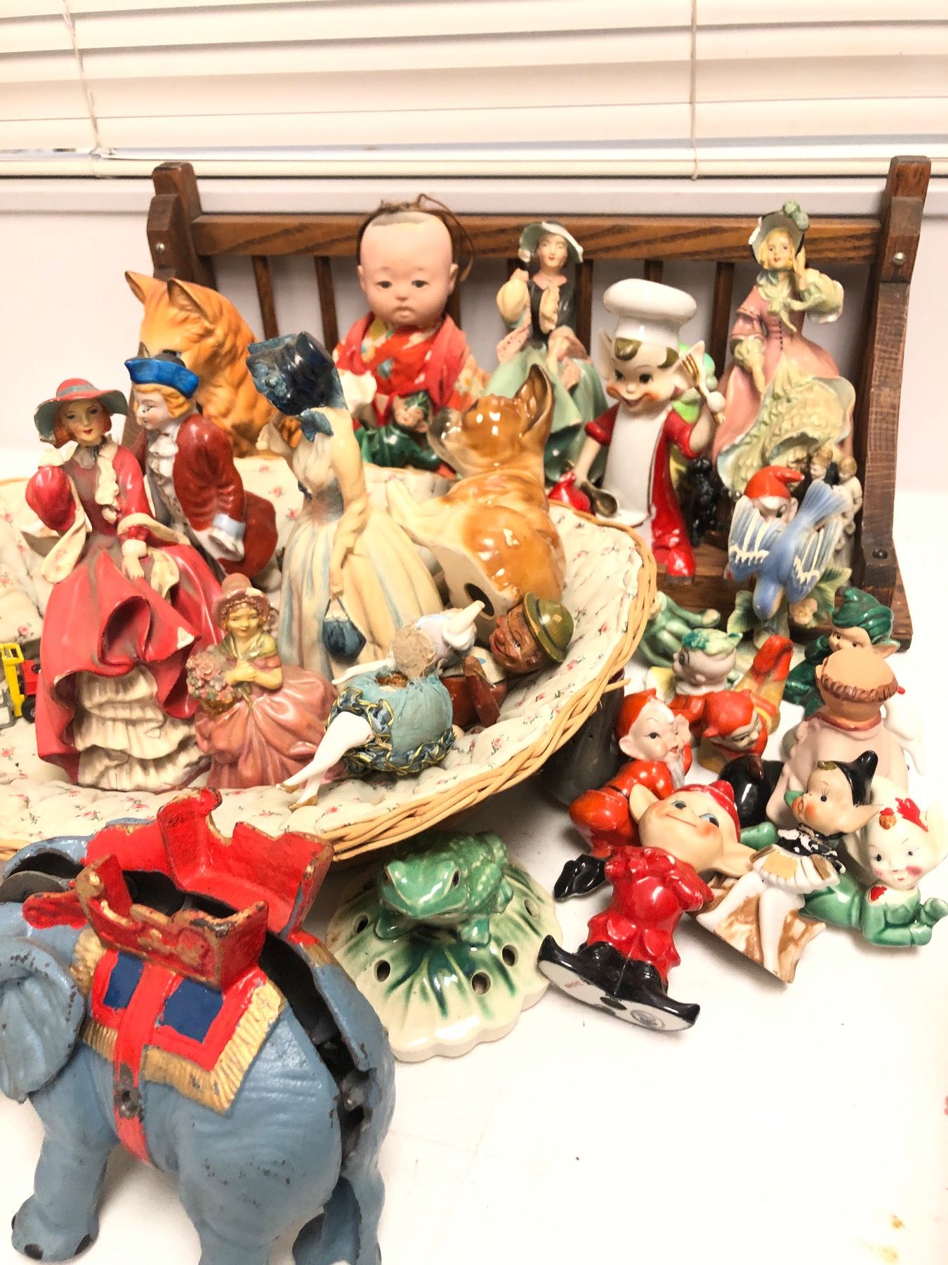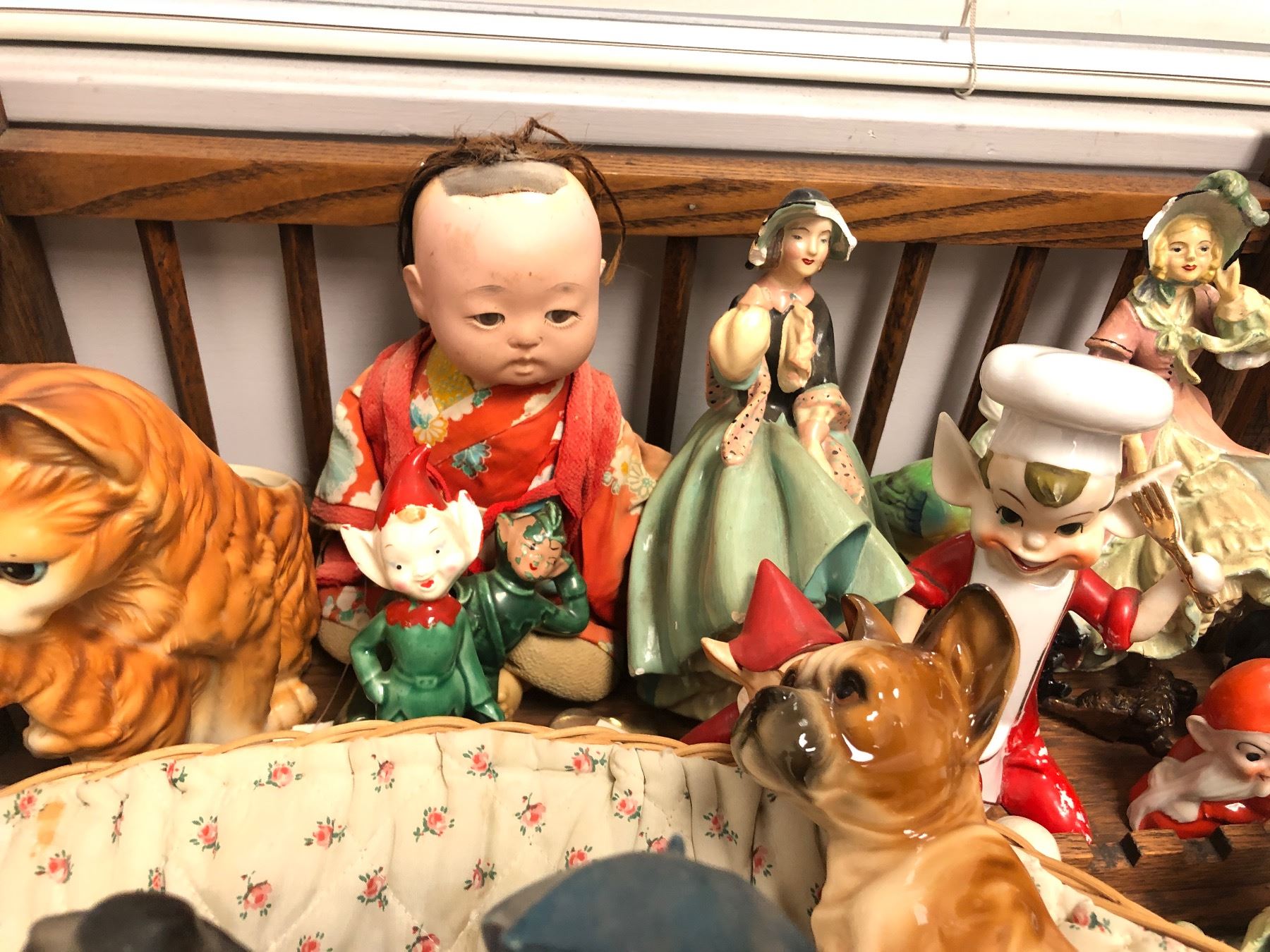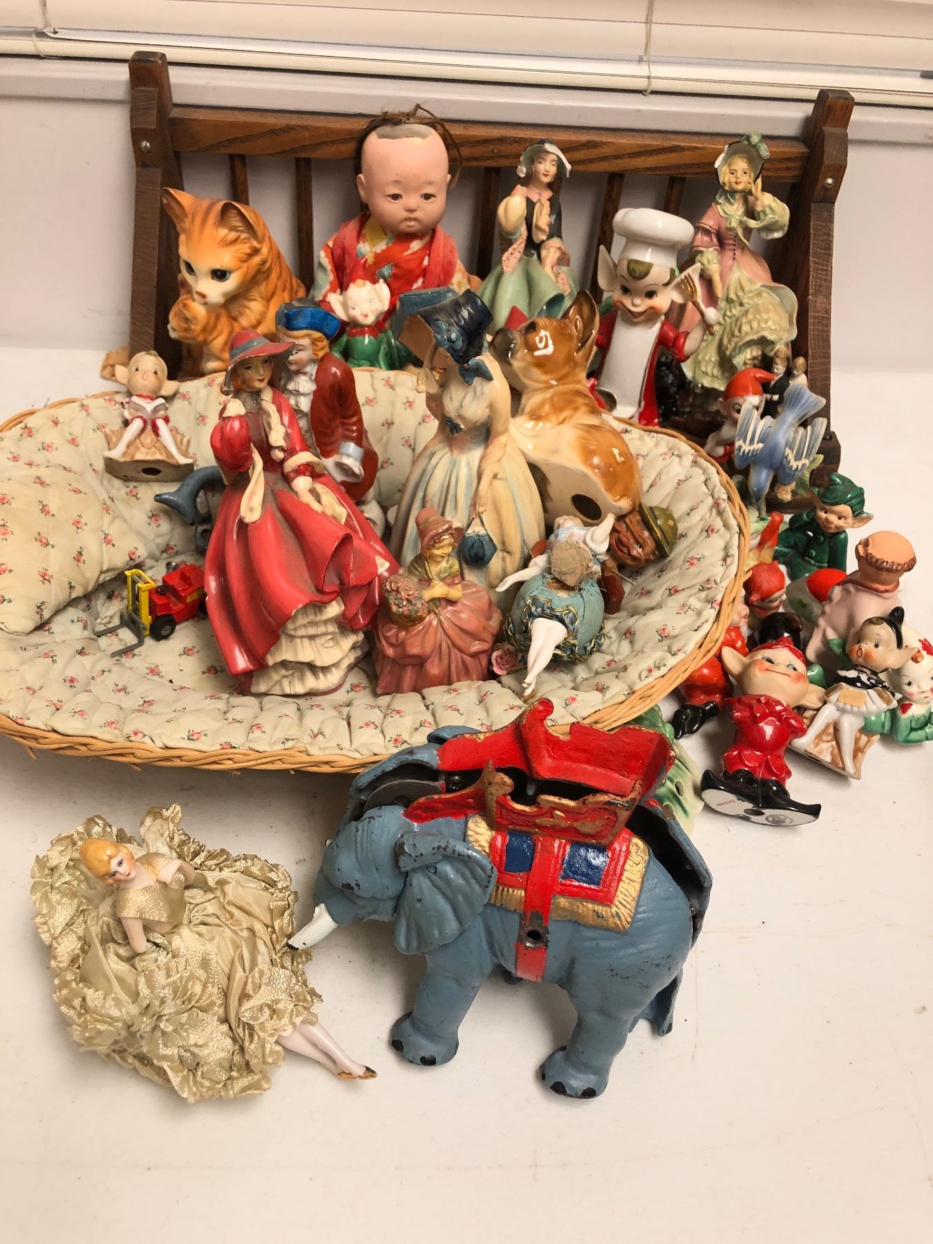 Group of assorted vintage estate figurines - includes pixie elf figurines / victorian lady figurine / 1950s pixie elf chef etc