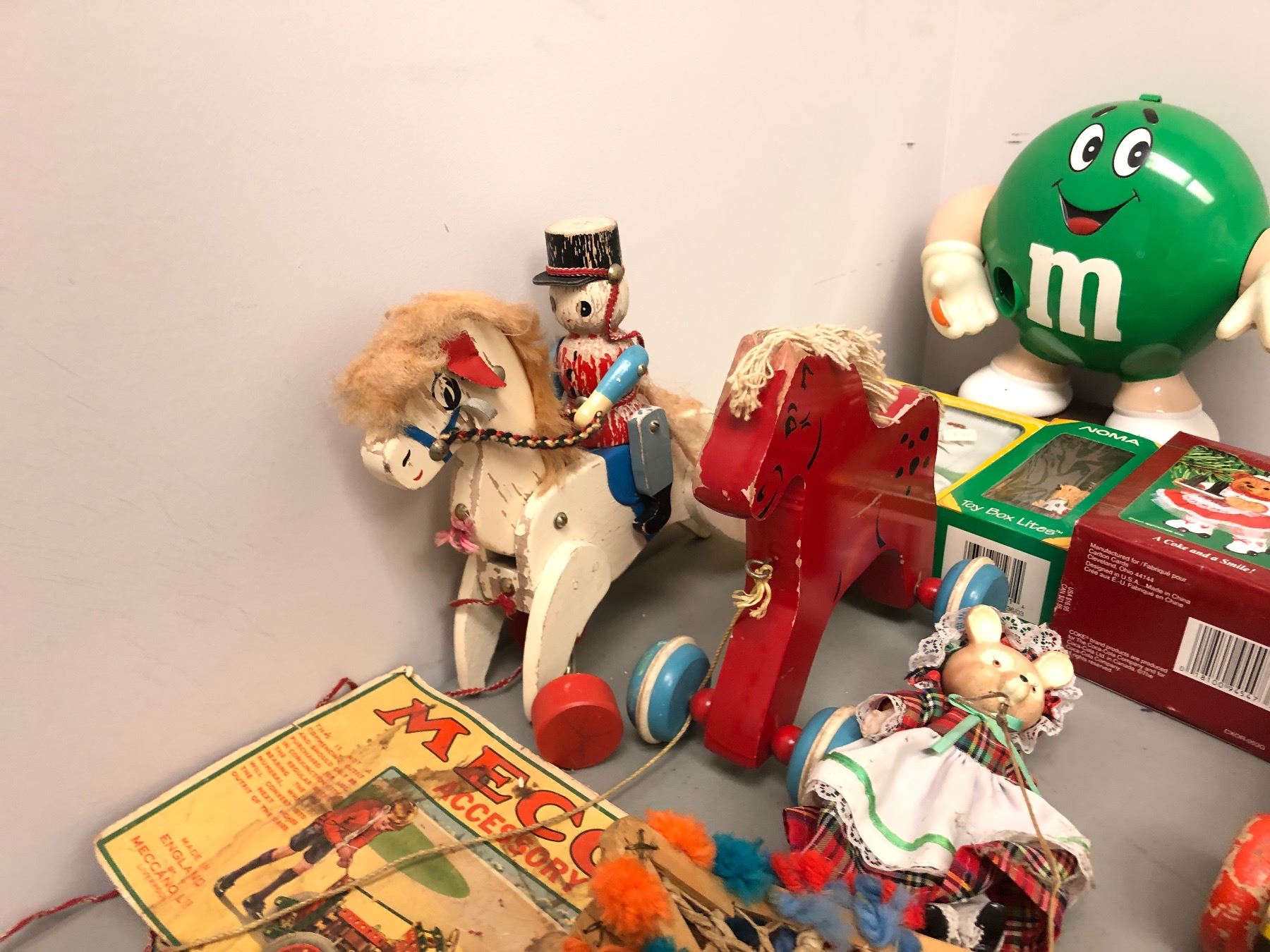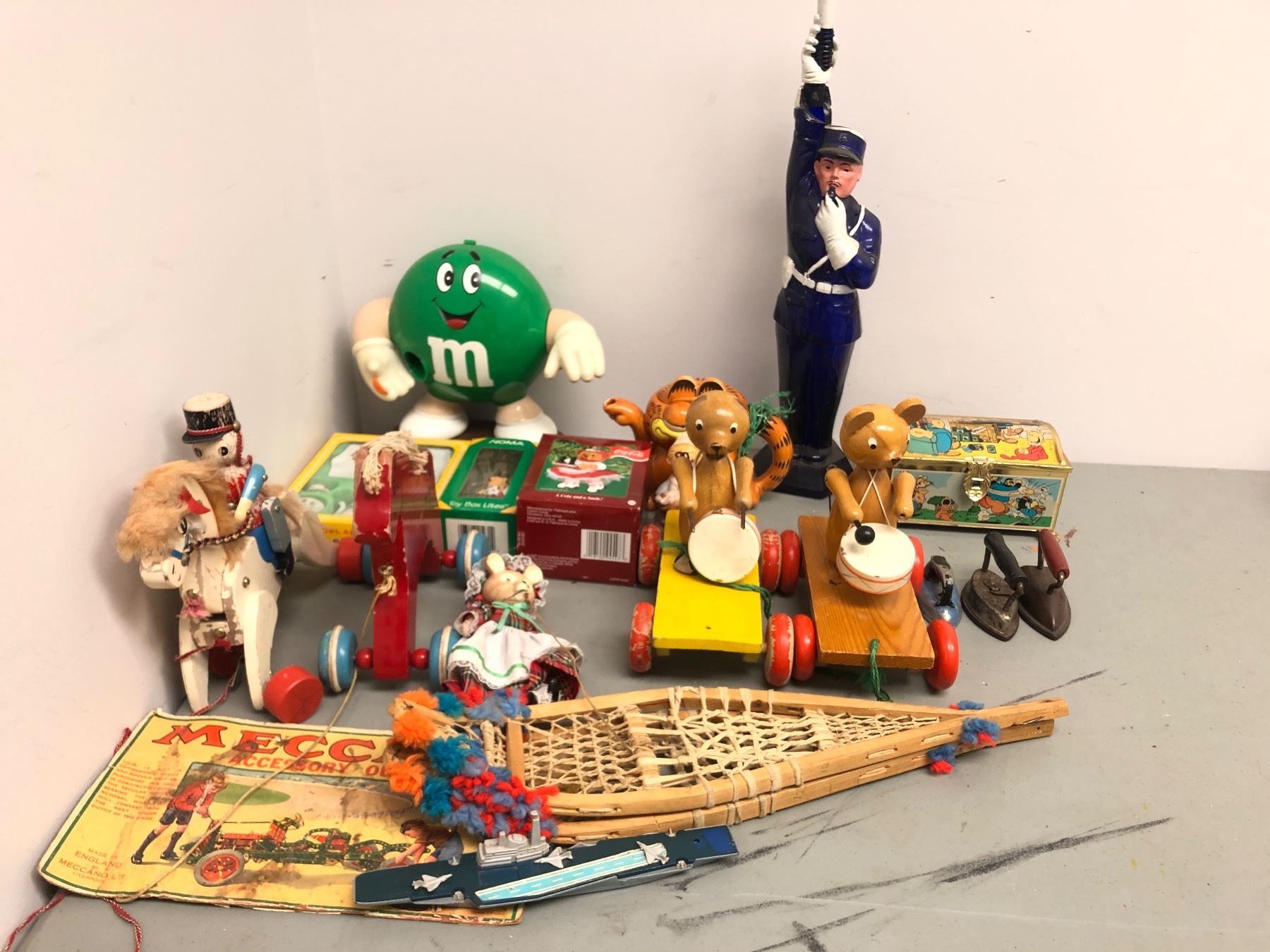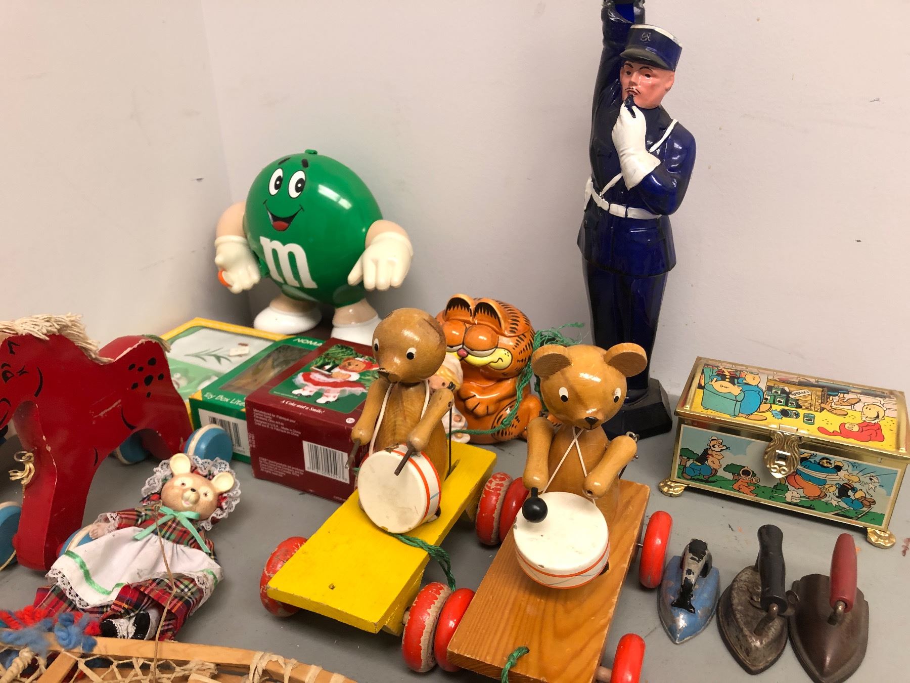 Group of assorted vintage estate items - includes Garfield tea pot / french policeman glass decanter / old pull-along wooden toy playing drums etc