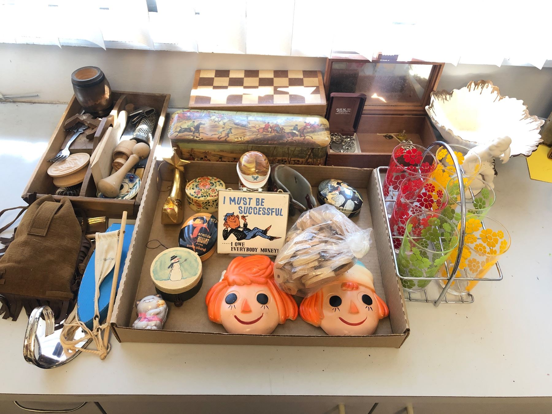 Group of assorted vintage estate items - includes Raggedy Ann & Andy faces wall decor hanging / Chess board / Tally-Ho tin box etc - approx 40 pcs