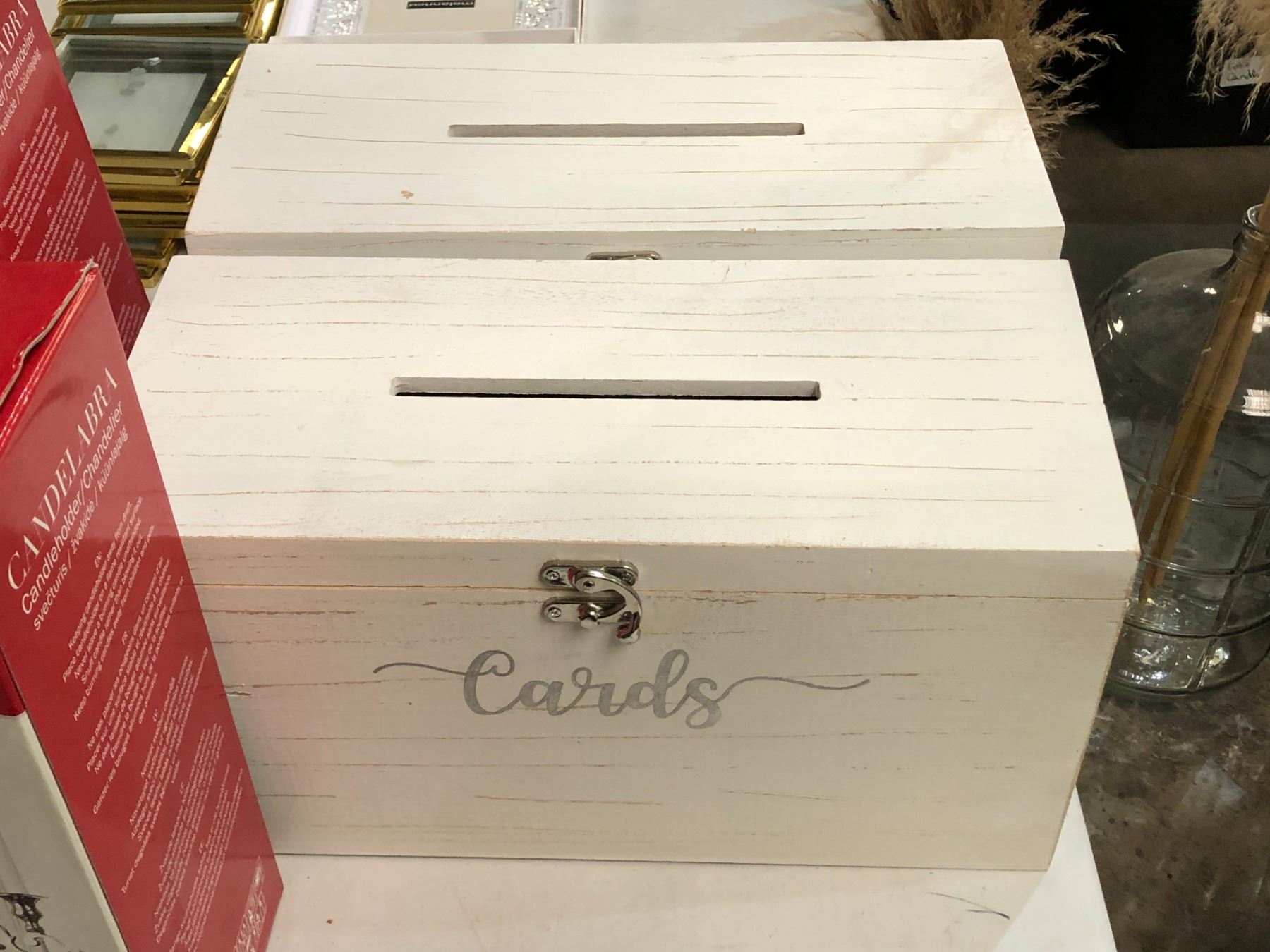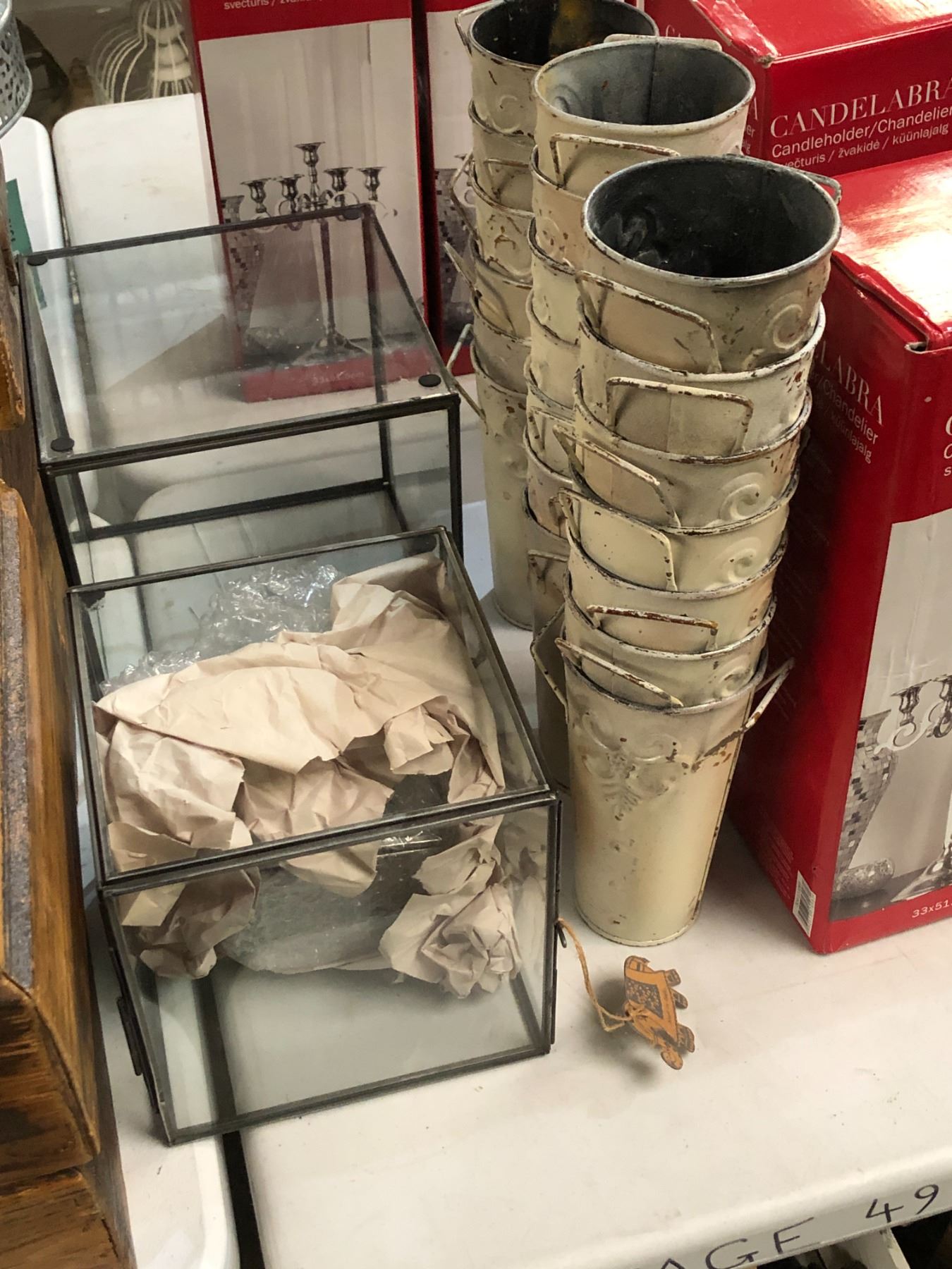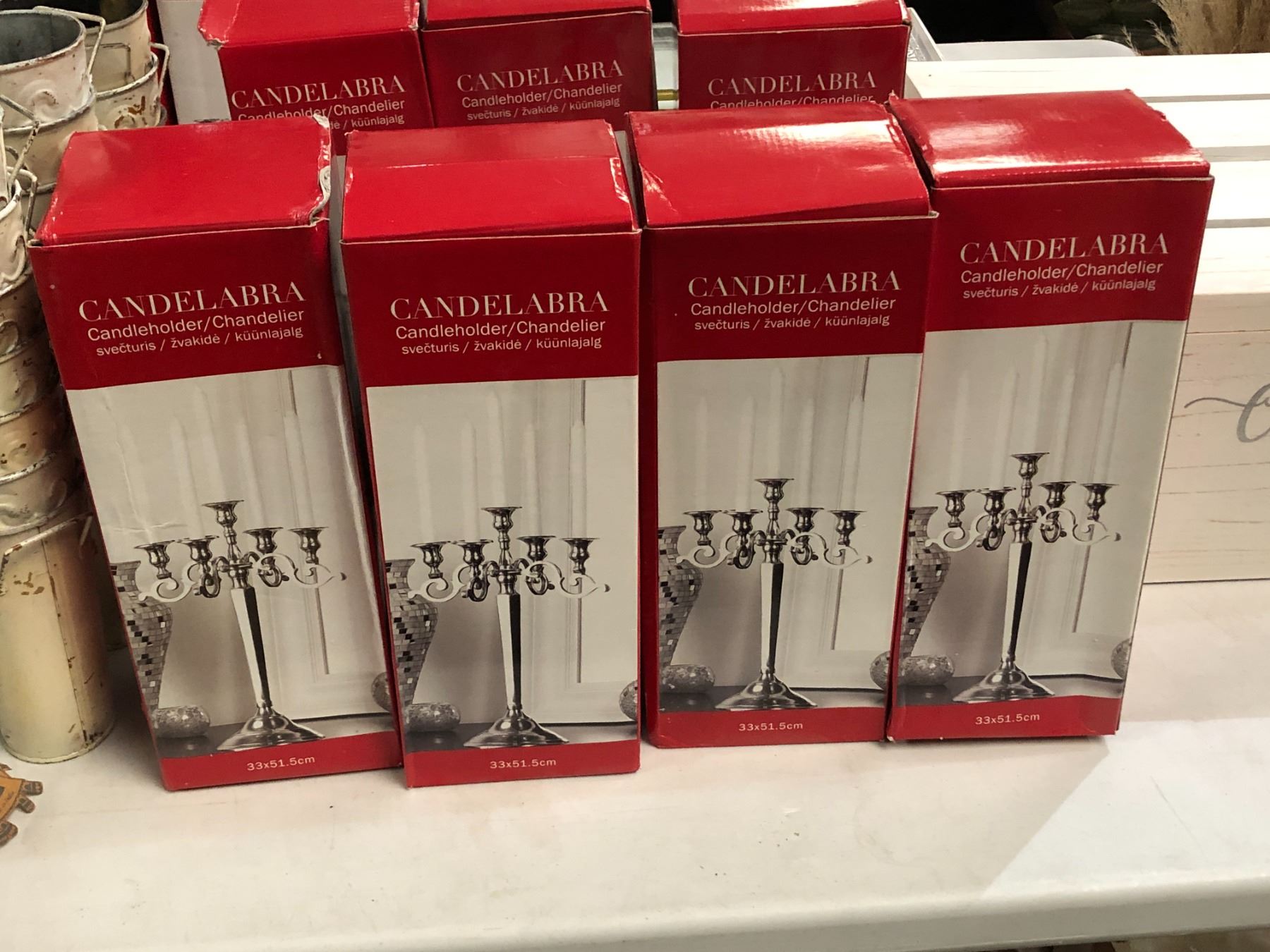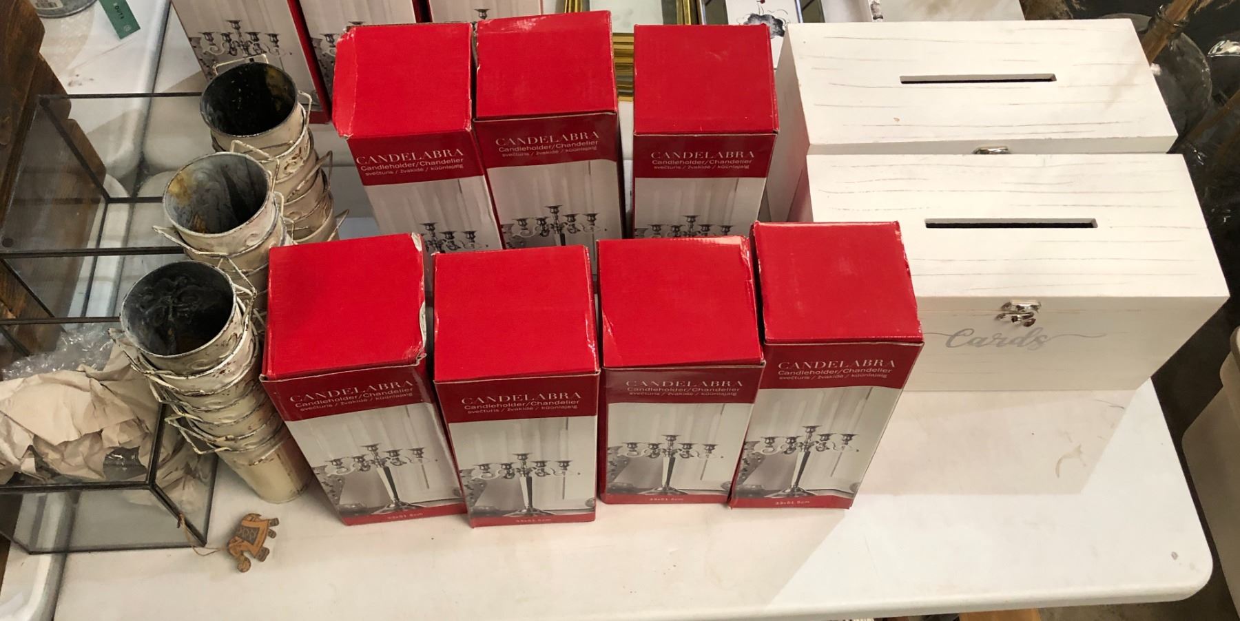 Group of assorted wedding/decor items including - approx. 7 Candelabra candle holders, 2 card boxes, flower pots, etc...