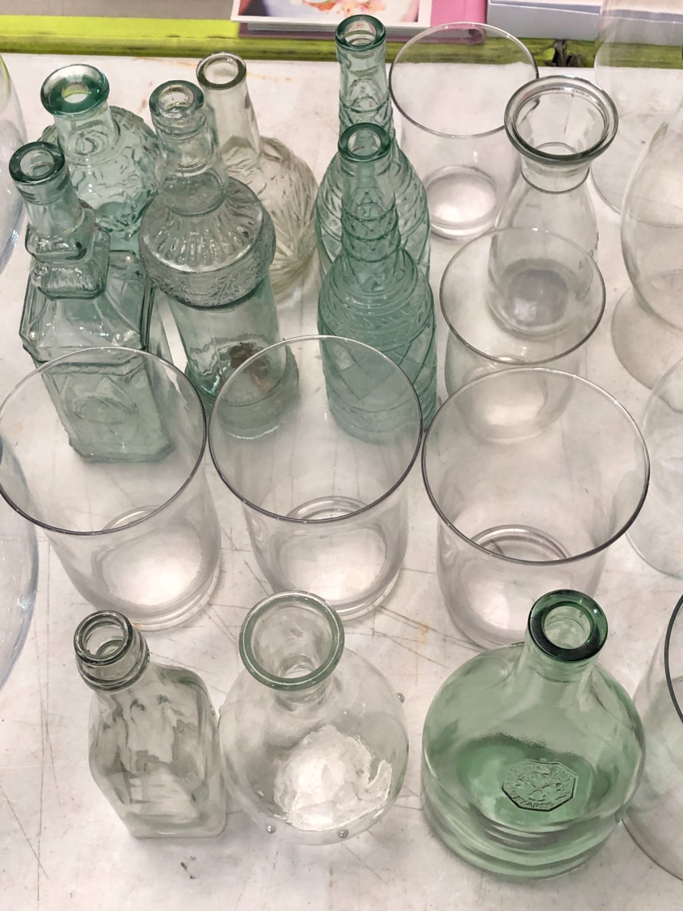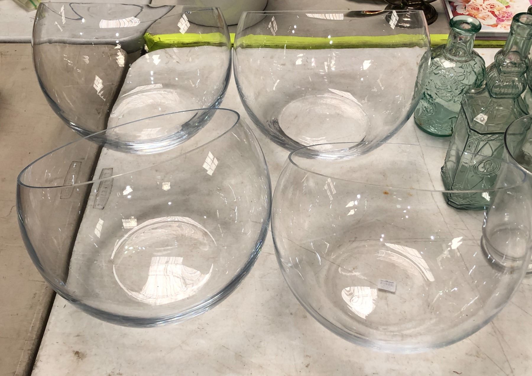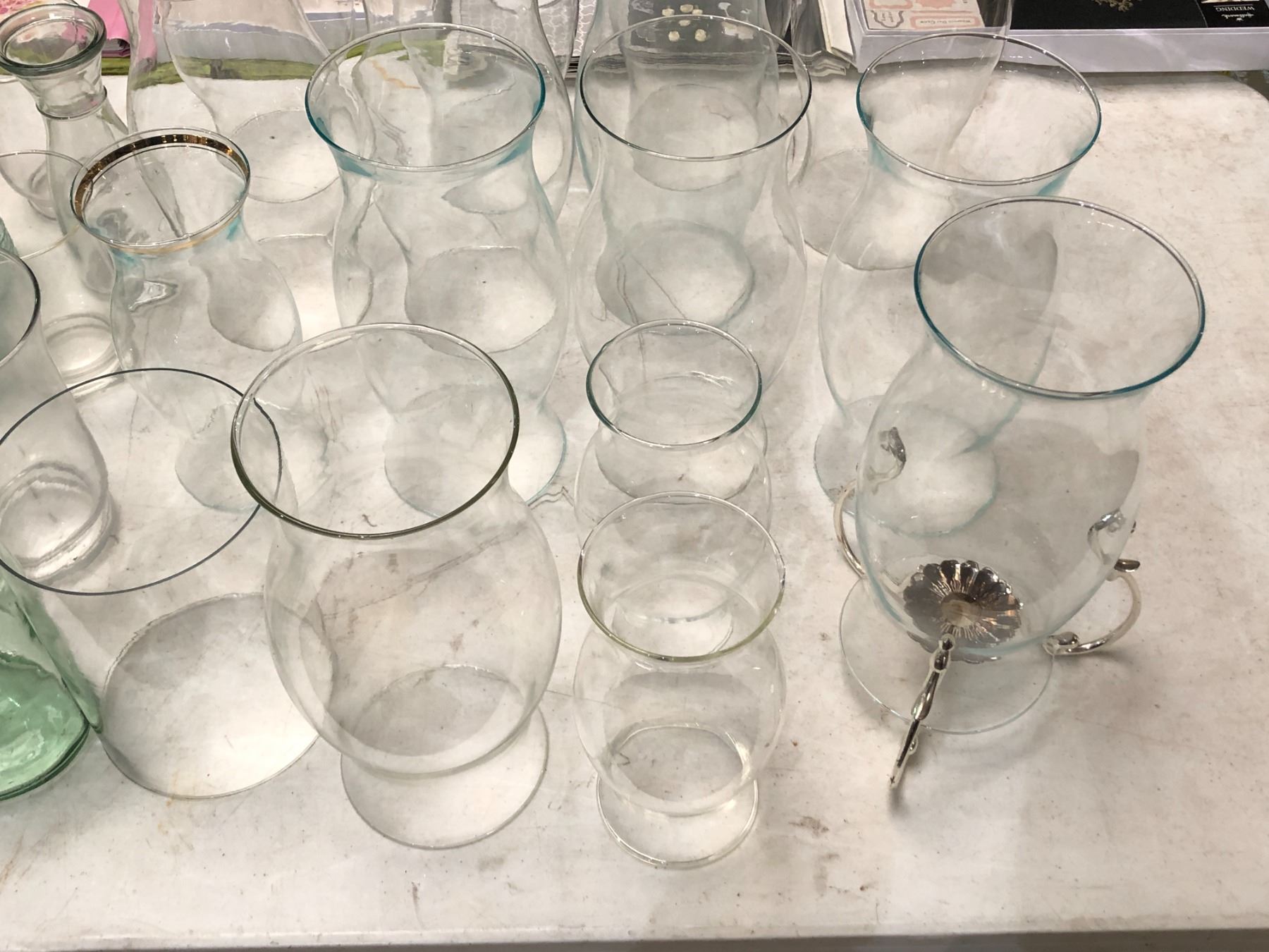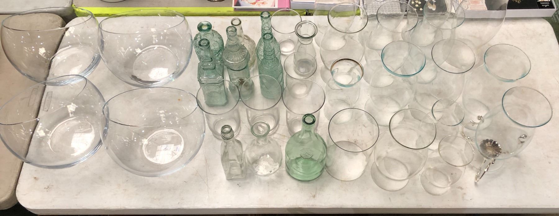 Group of assorted wedding/decor items including - kerosene lamps glass, glasses, glass bowls, glass vase, etc...
