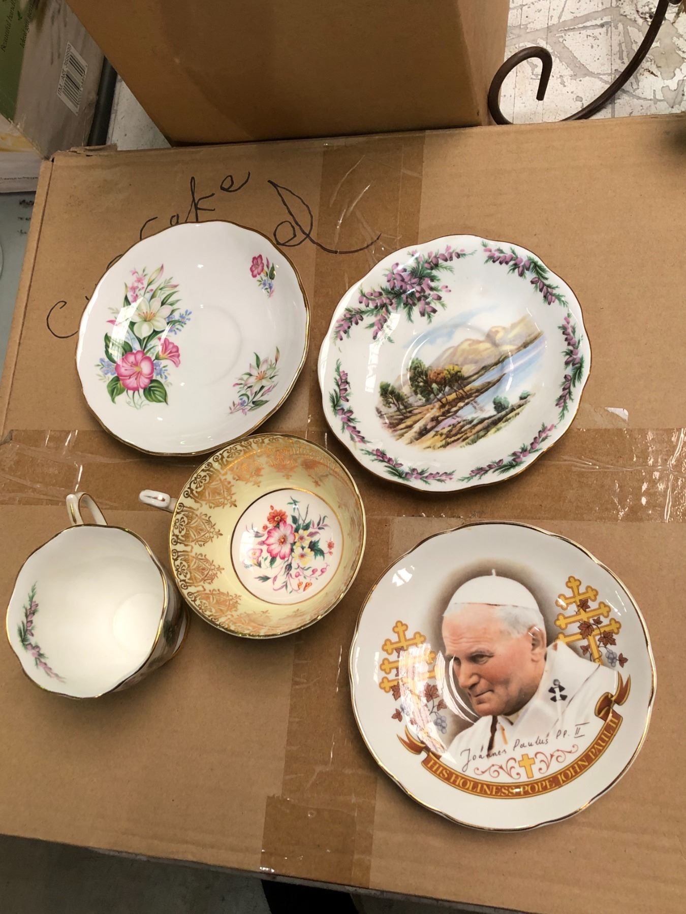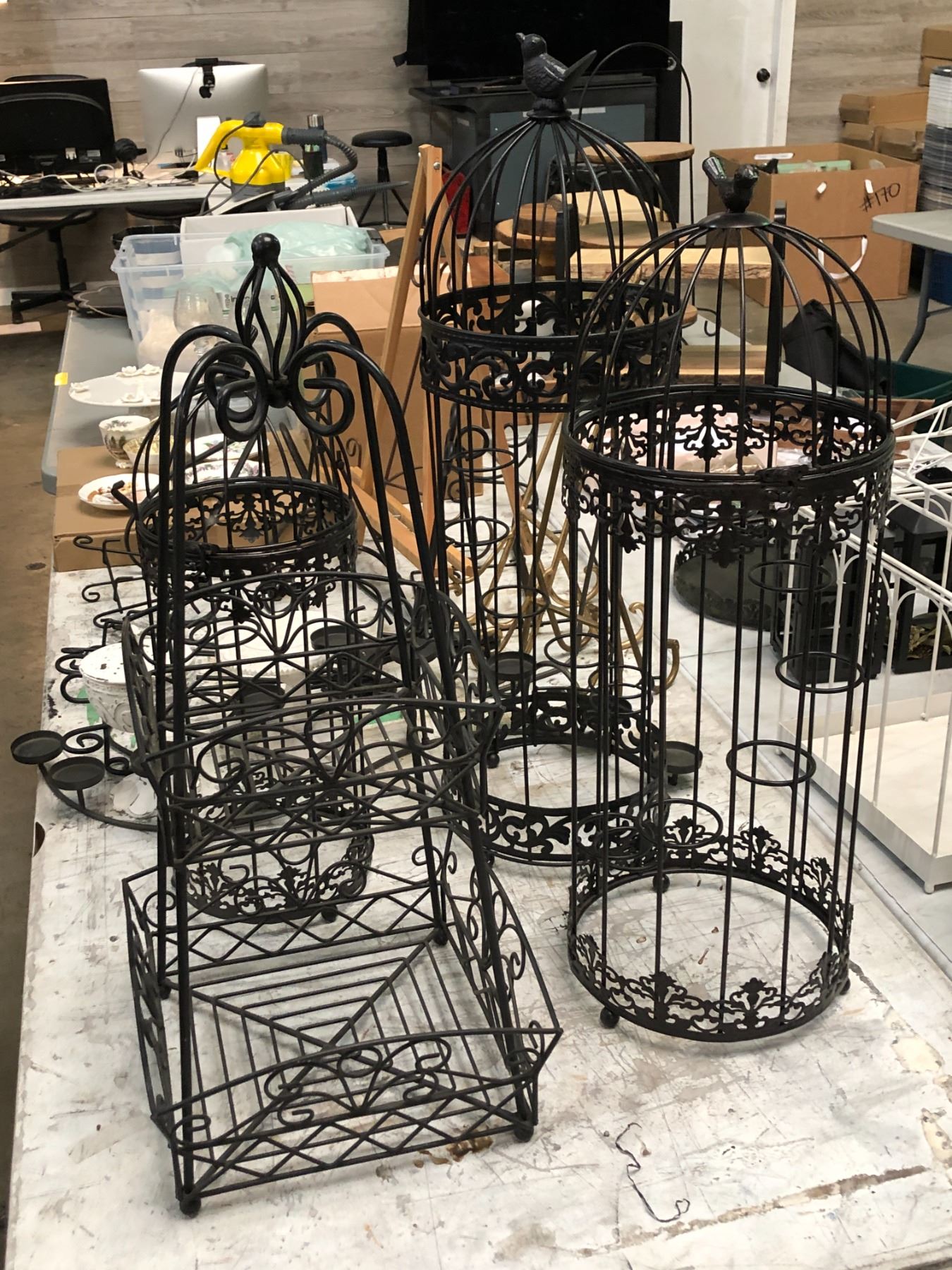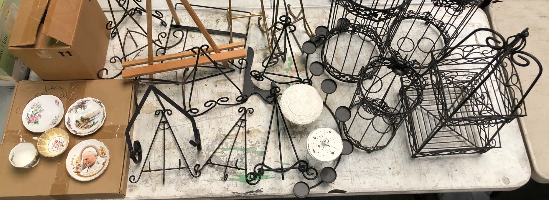 Group of assorted wedding/decor items including - tiered bird cage candle stick holders, easels, tea cups/plates,