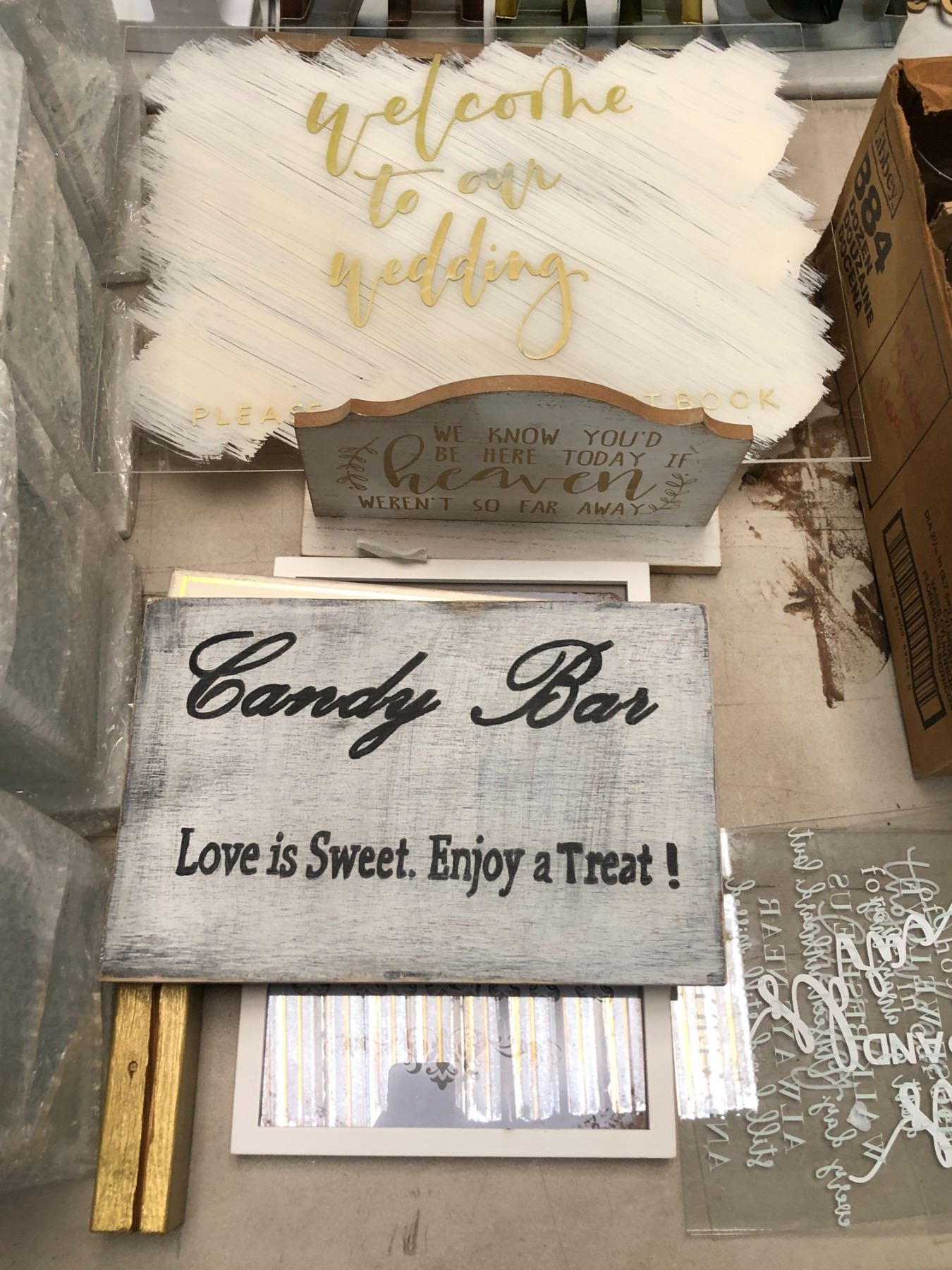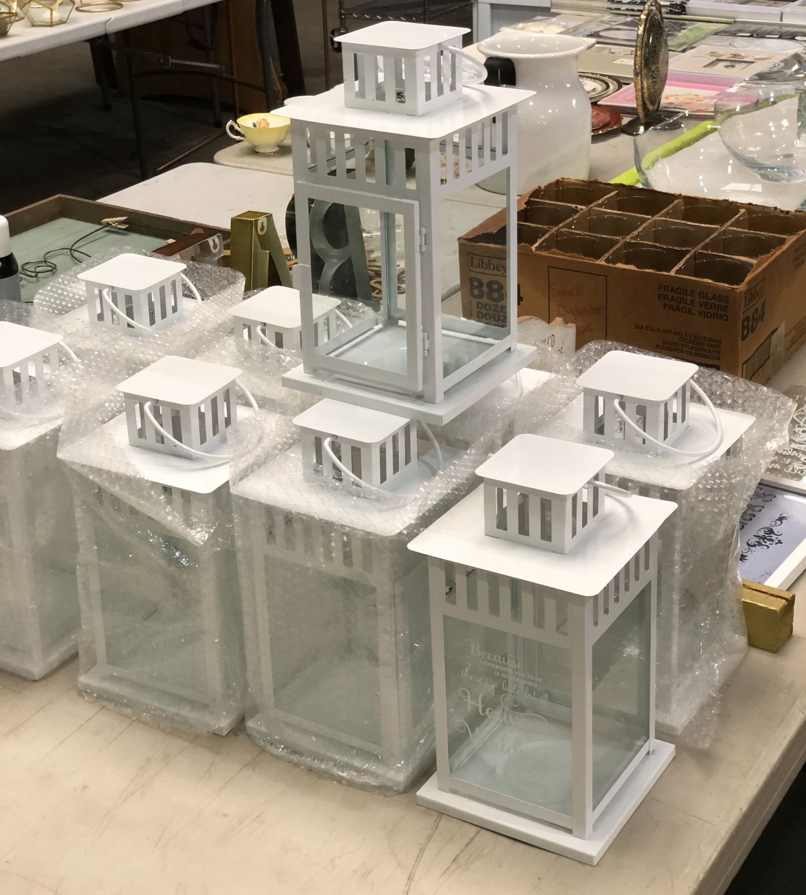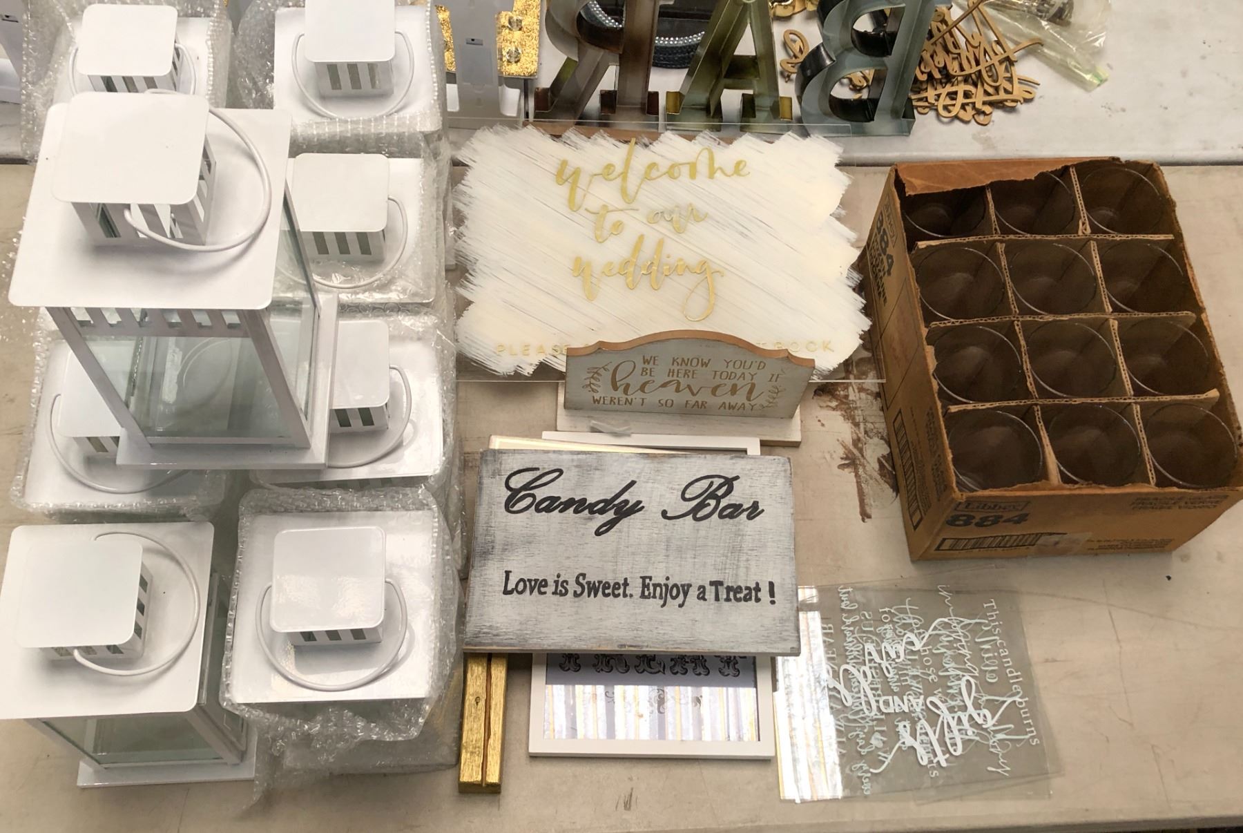 Group of assorted wedding/decor items including - wedding signs, glass vases, white lantern candle holder,