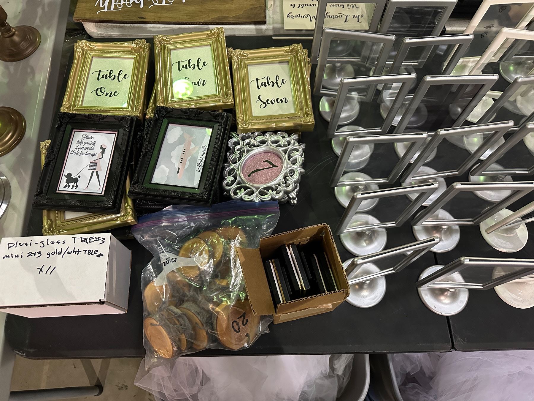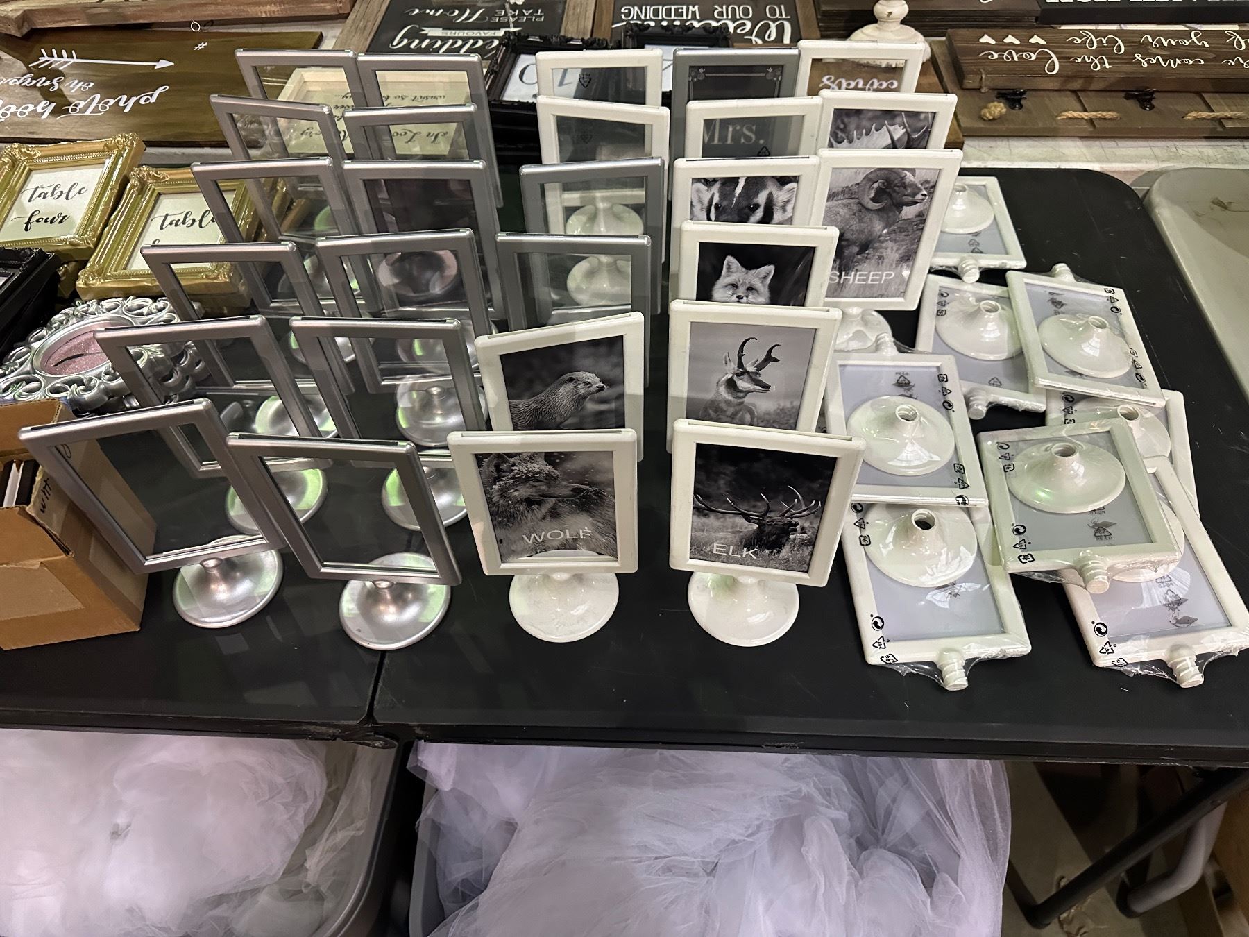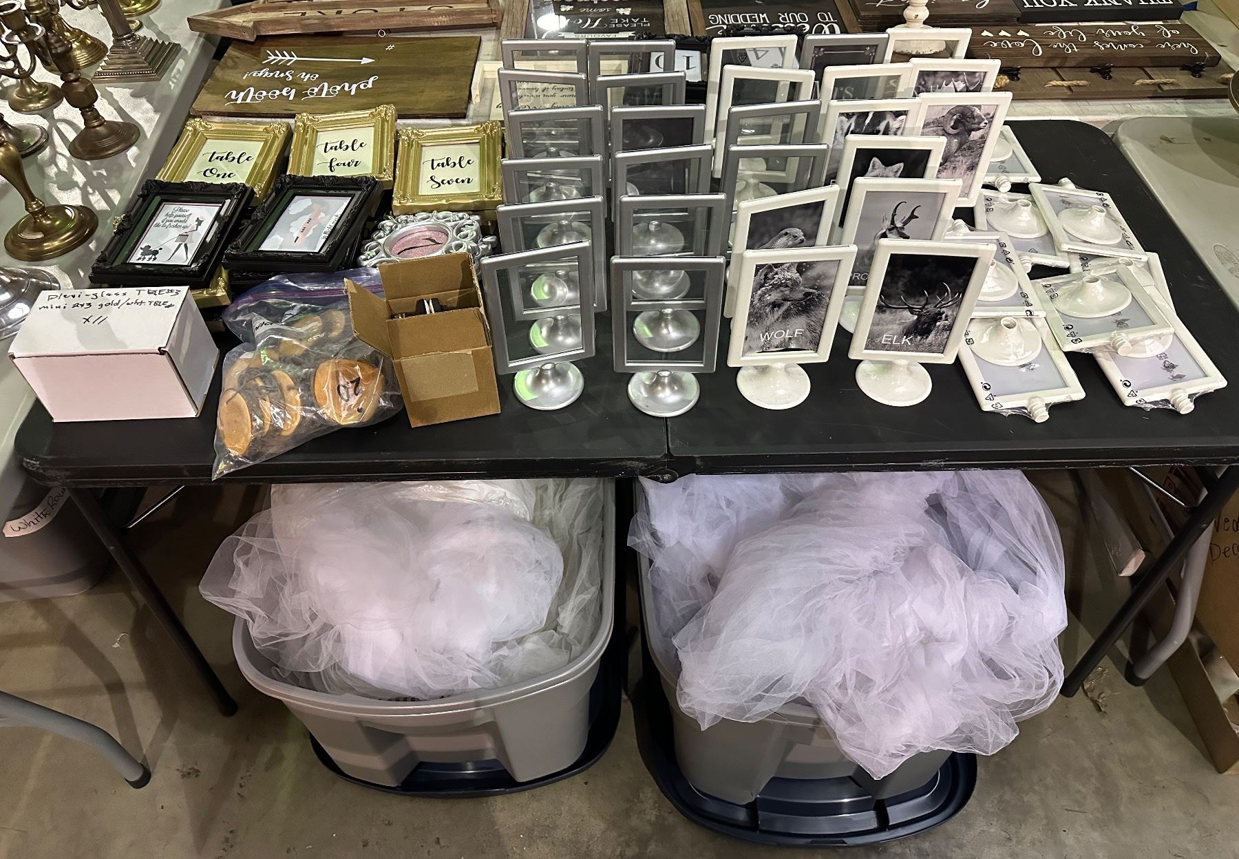Group of assorted wedding items including - plastic picture holders, frames, wedding decor, etc...