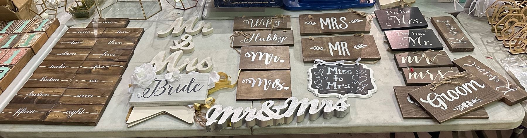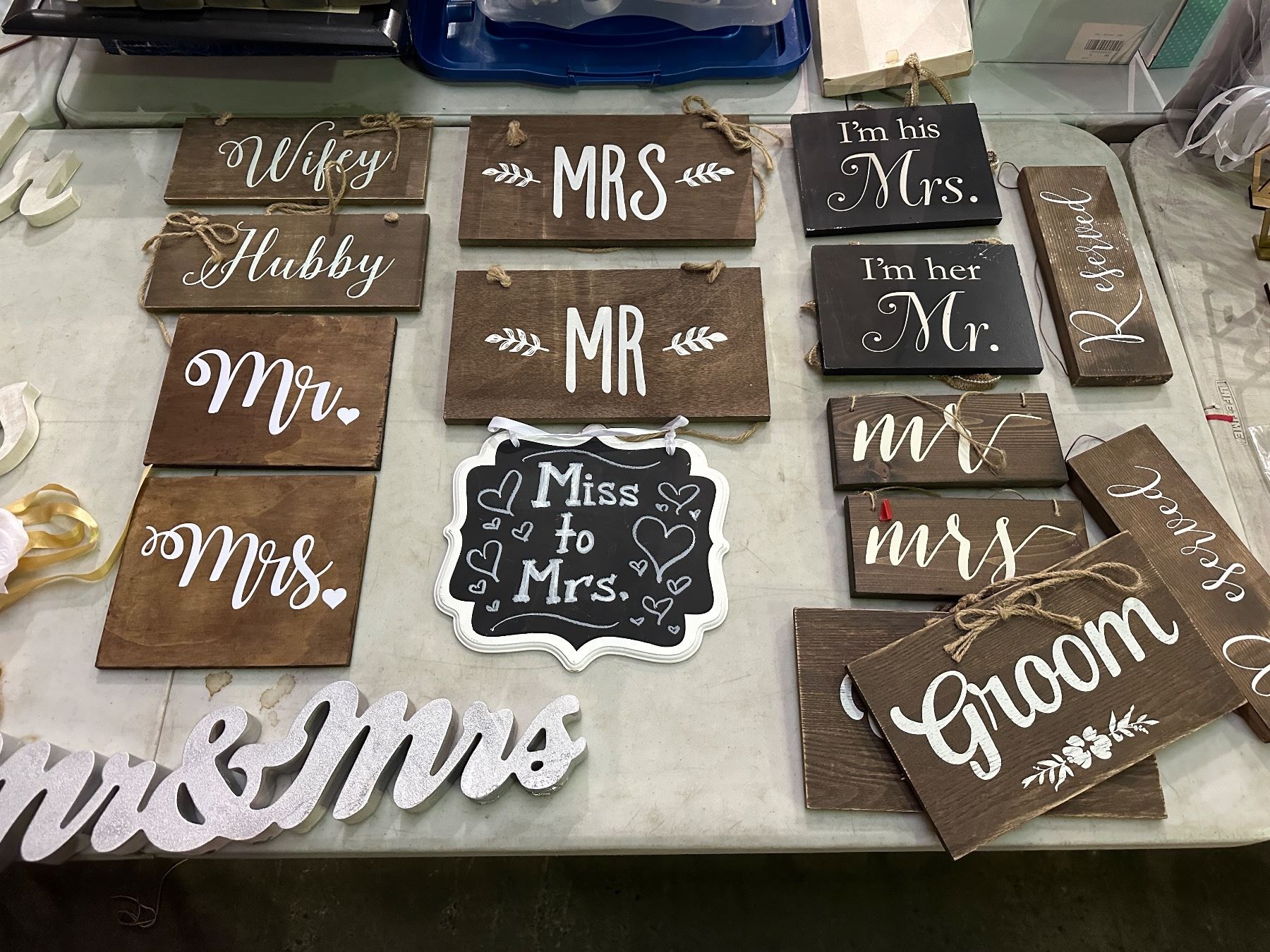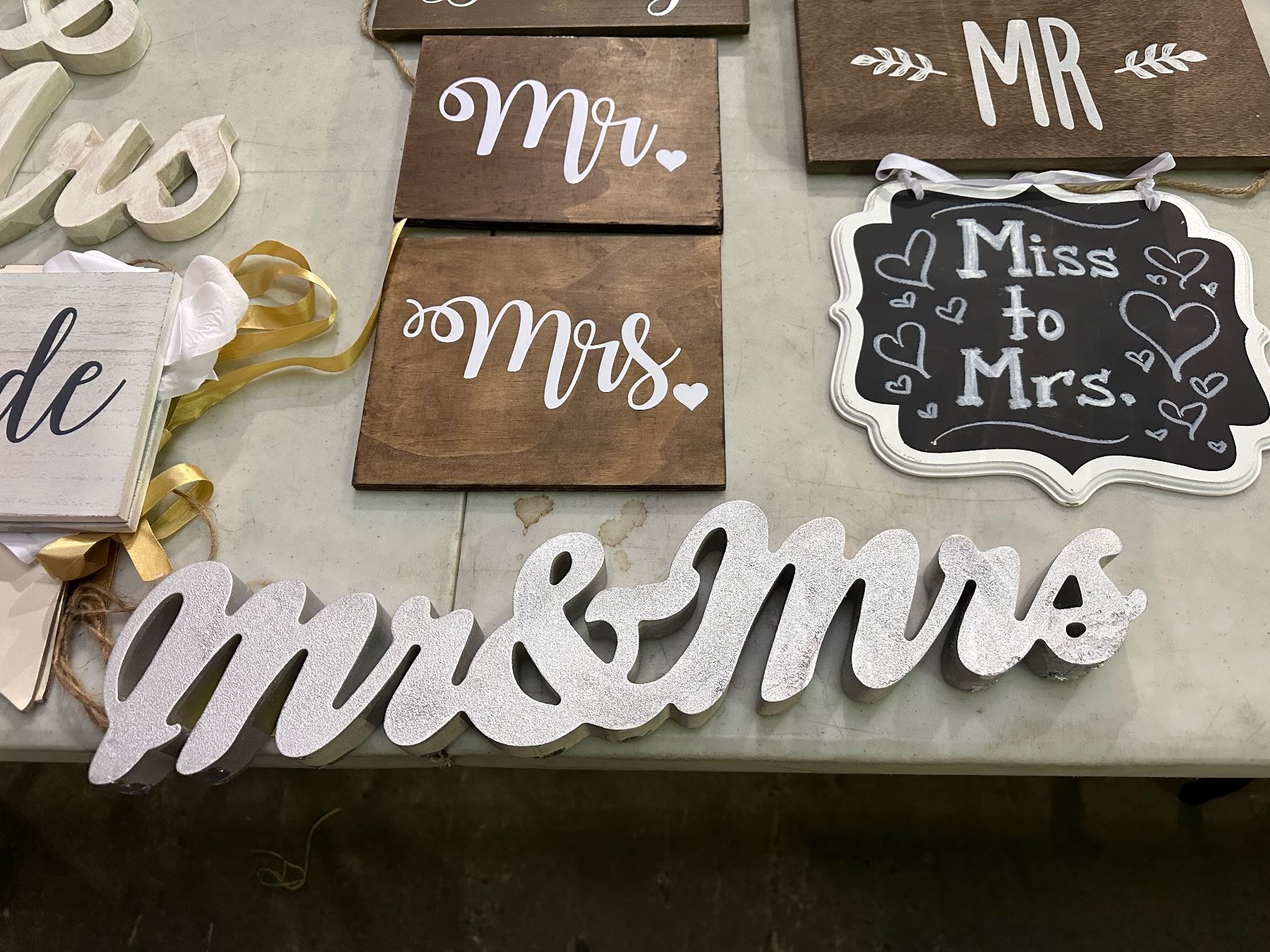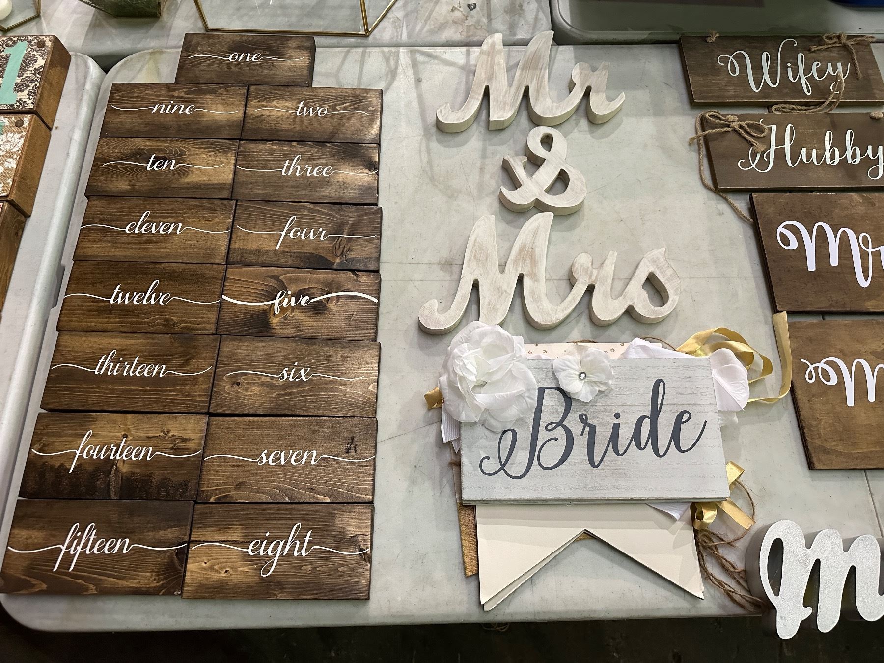 Group of assorted wedding signage including - mrs/mr, bride, table numbers, etc...