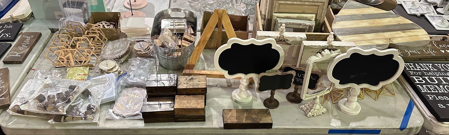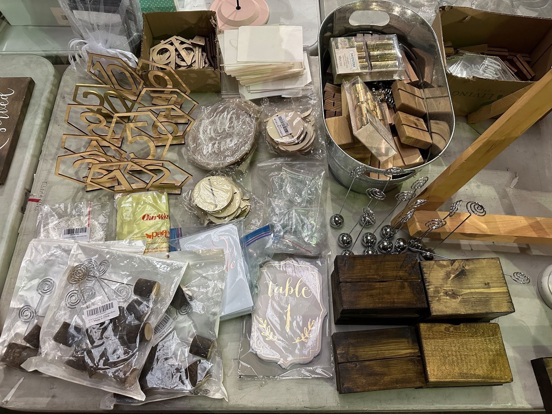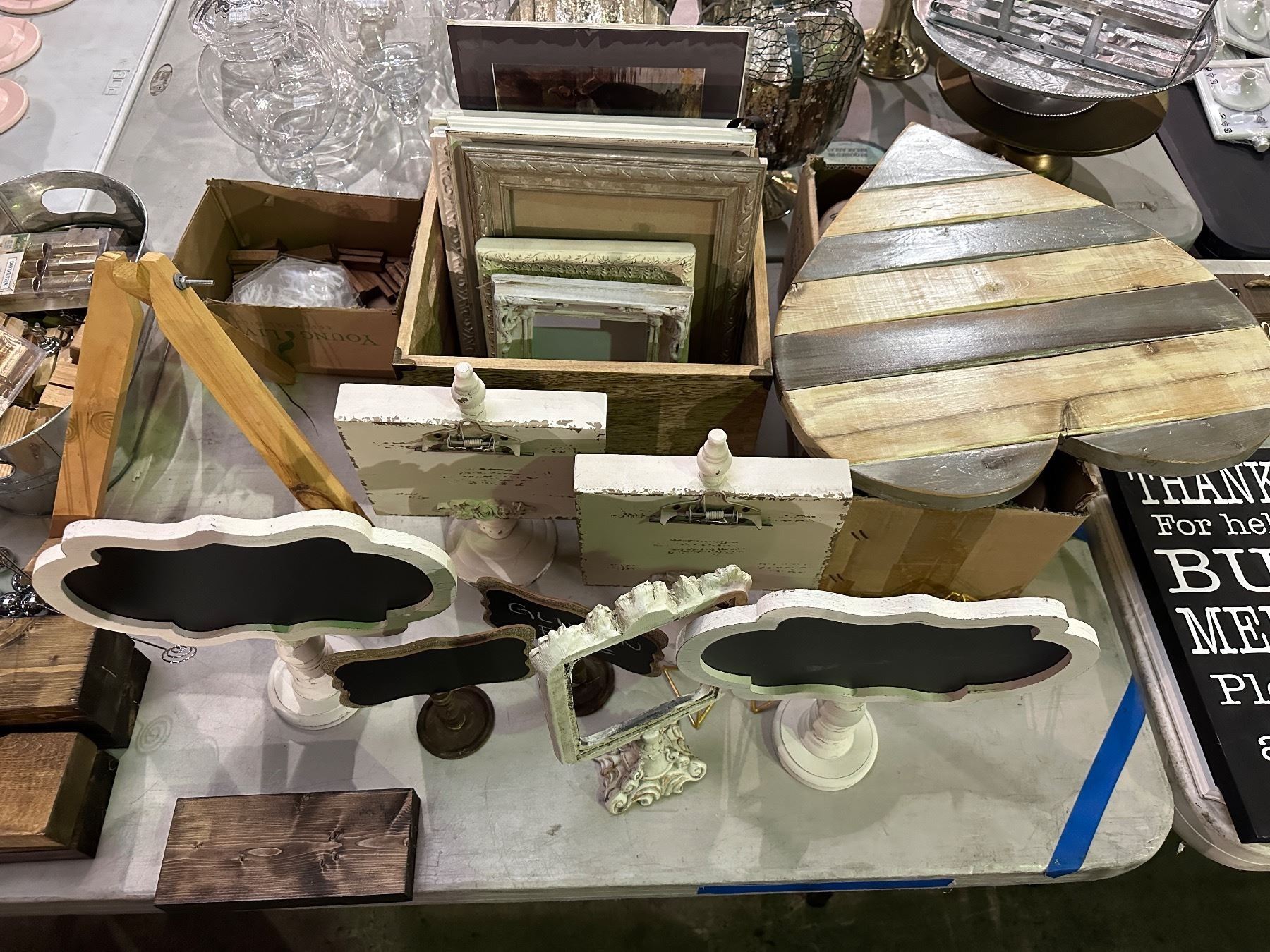 Group of assorted wedding signage including - picture frames, wooden sign holders, easel, wood heart, table signs, etc...