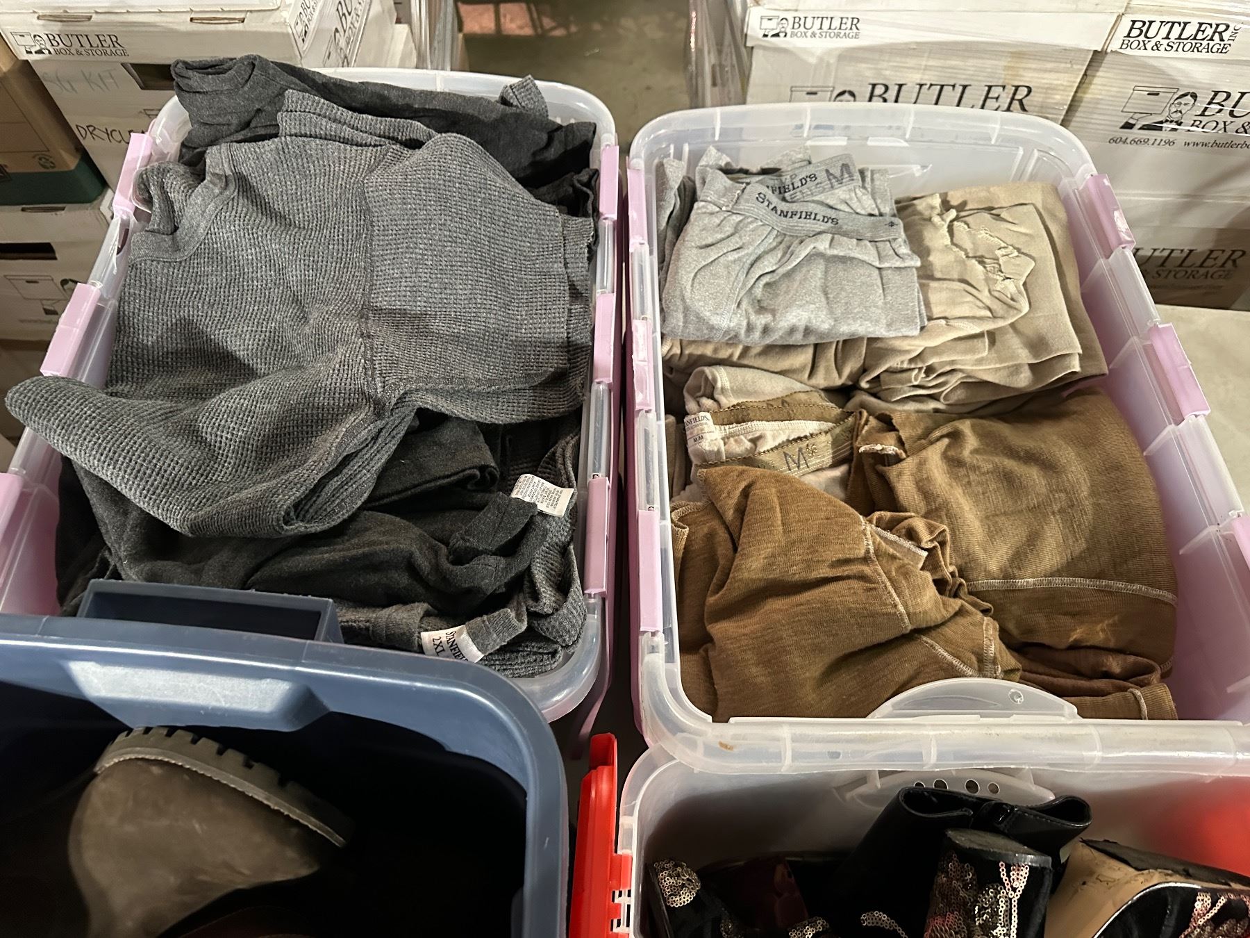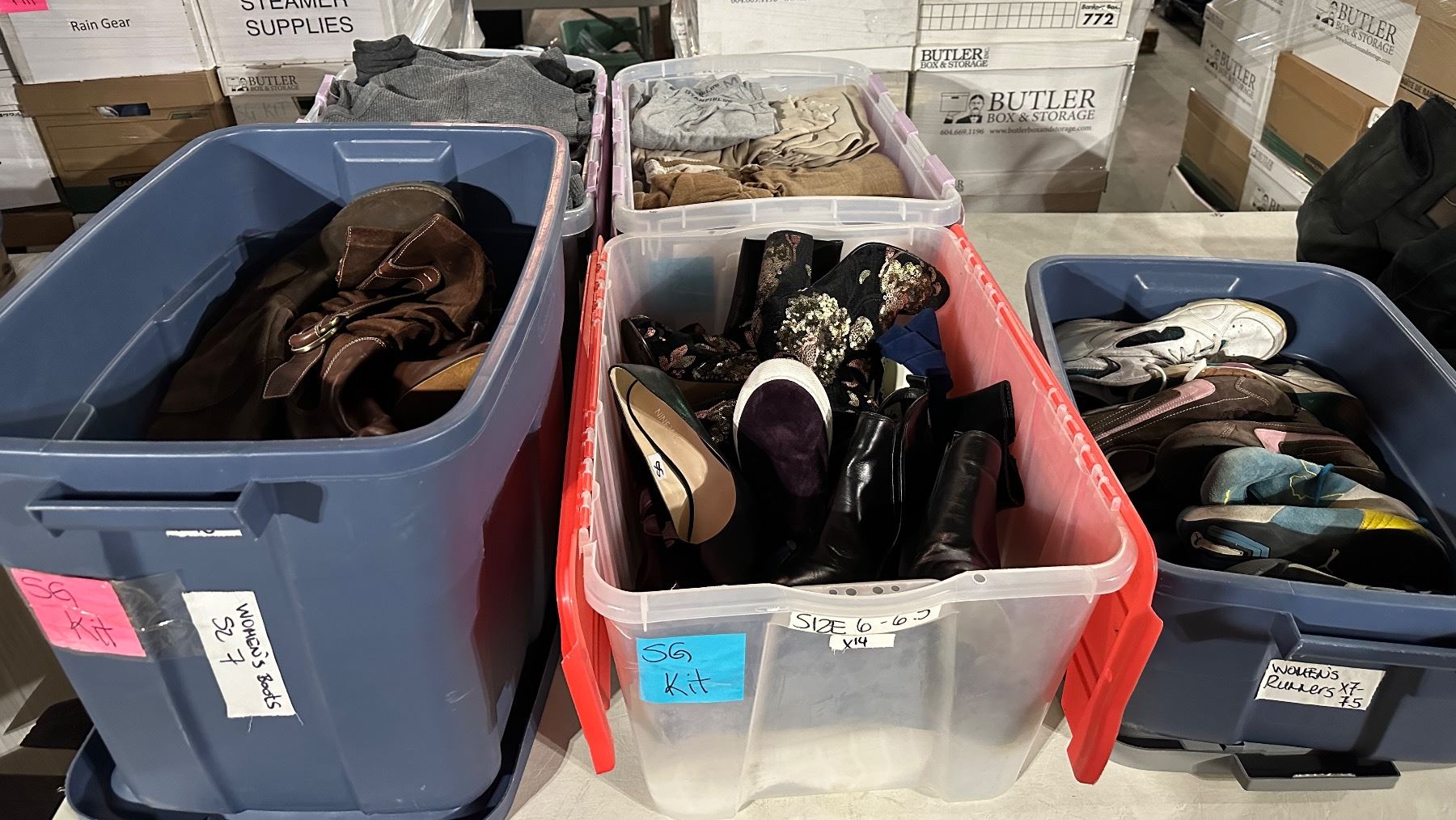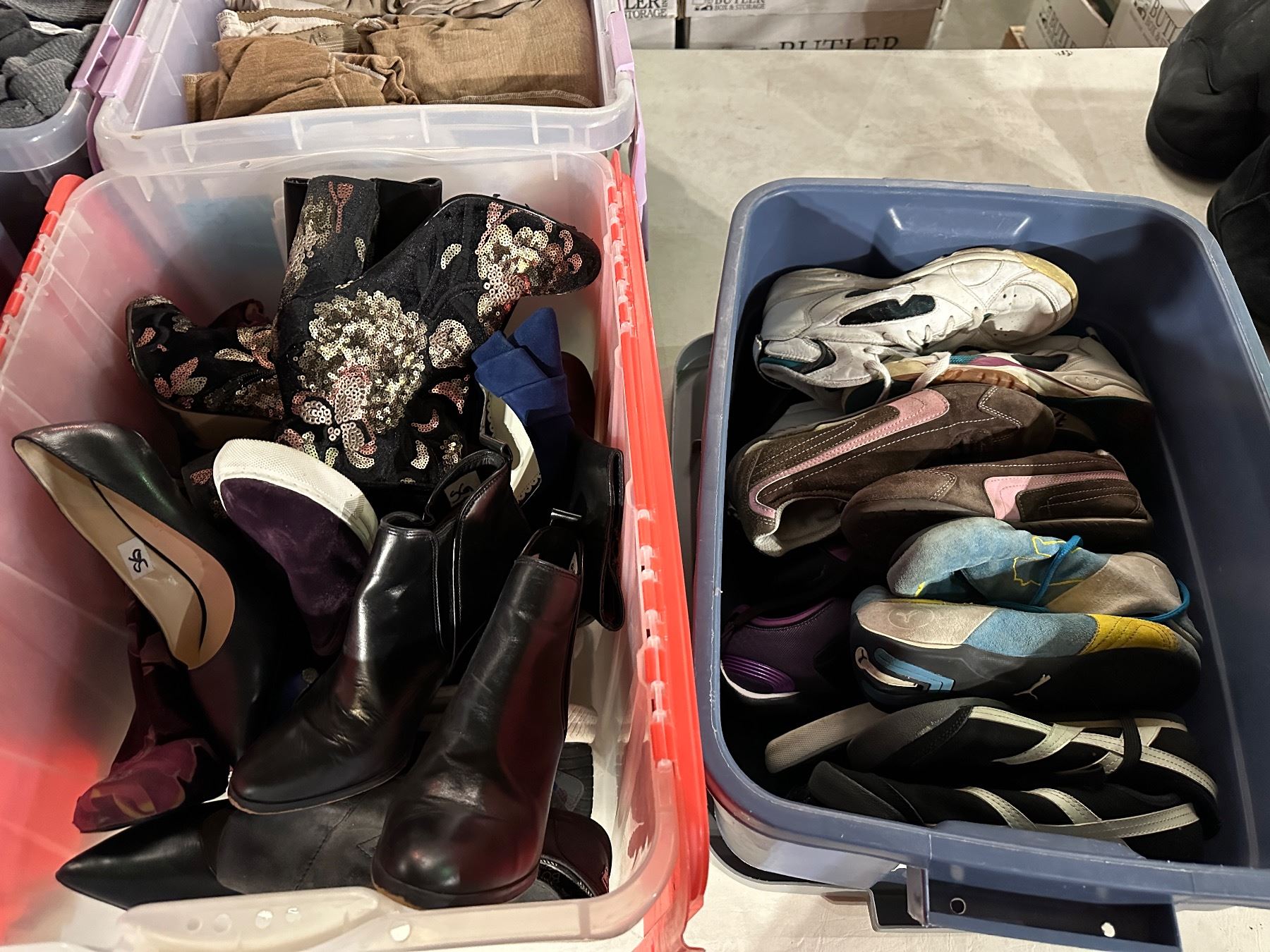 Group of bins including - 3 bins of shoes & 2 bins of misc. clothing