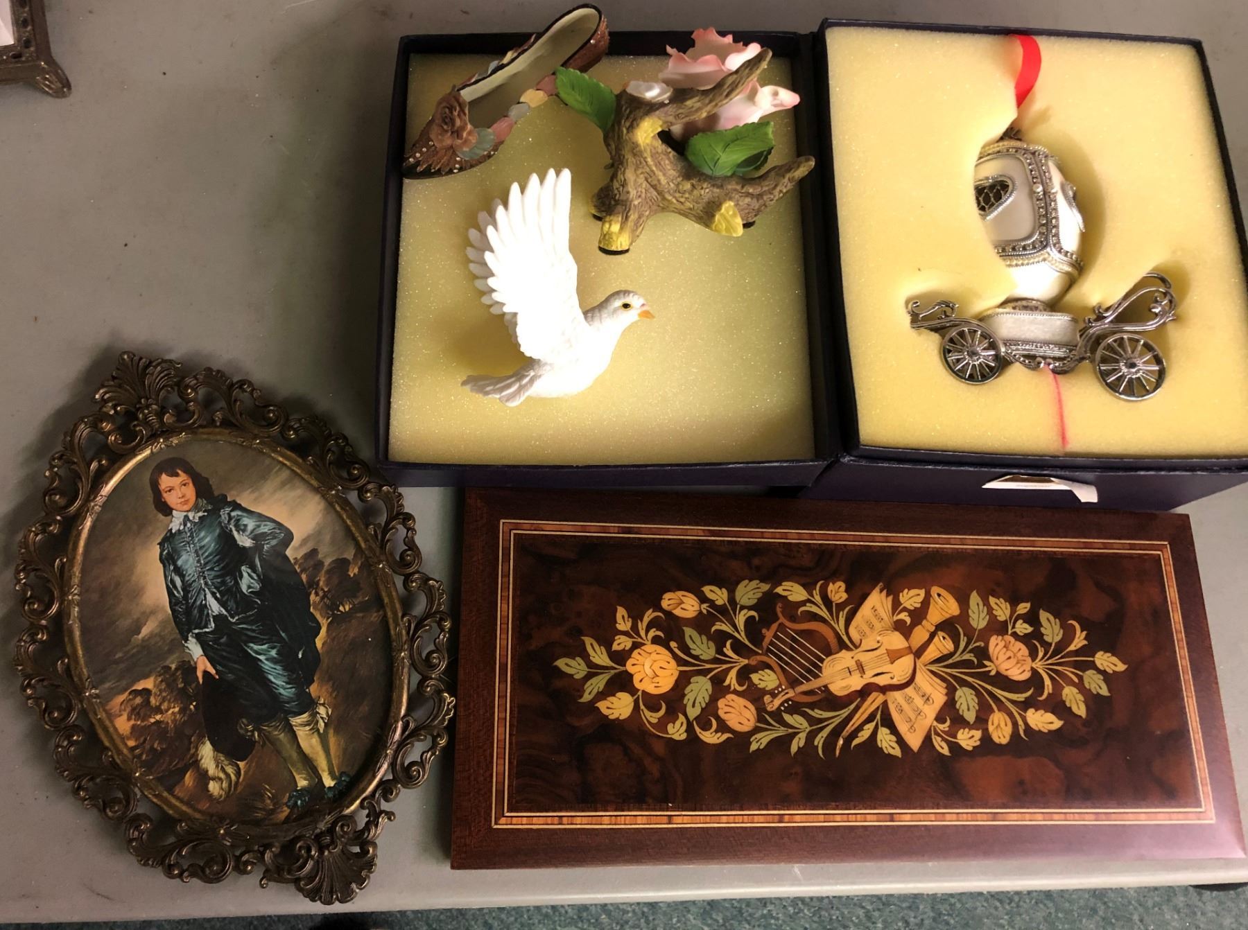Group of decorative collectibles inlaid floral wood panel framed Blue Boy shoe figure & a carriage