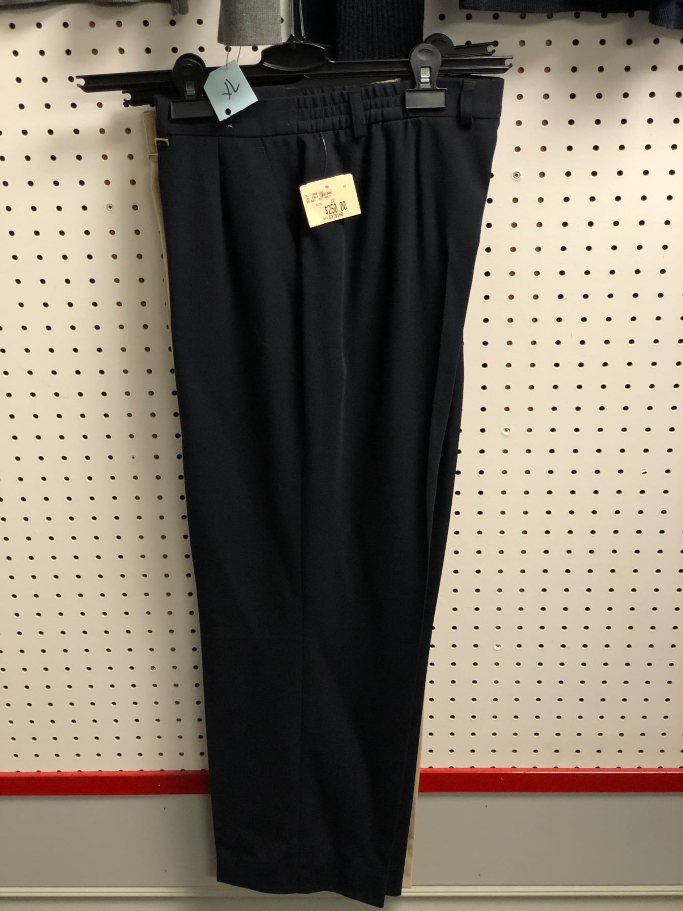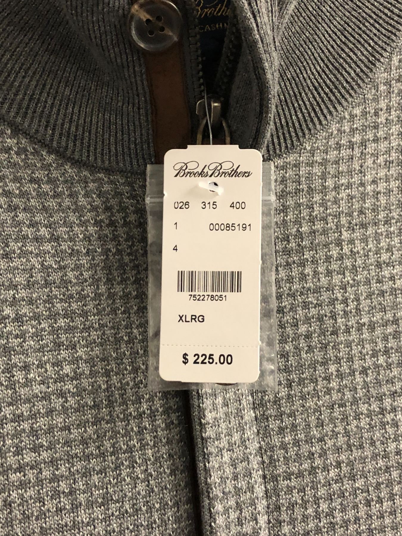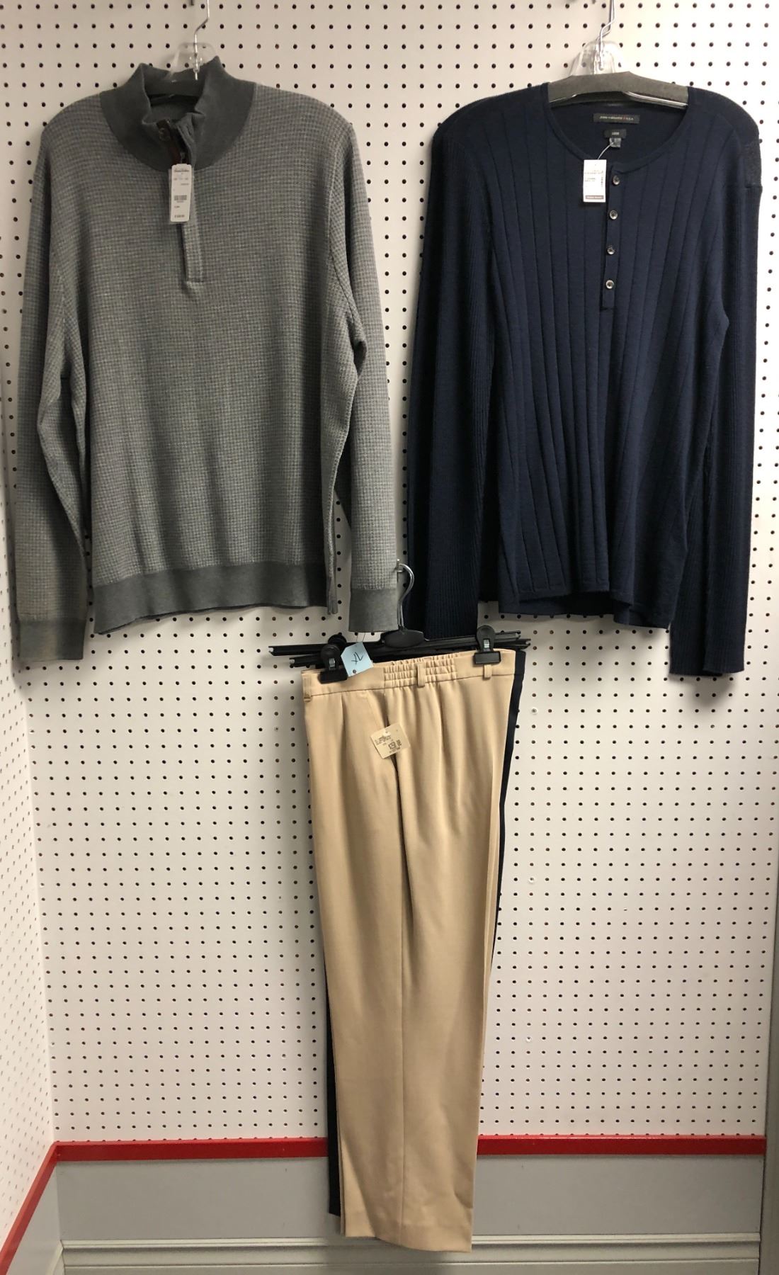 Group of designer clothing pieces - 2 John Varvatos crew neck sweaters (size M each, new w/ tags)/ Brooks Brother cotton cashmere sweater (size XL, new w/ tag) & 2 Edward Chapman beige & navy blue cuff pants (sizes 12 each, new w/ tags)