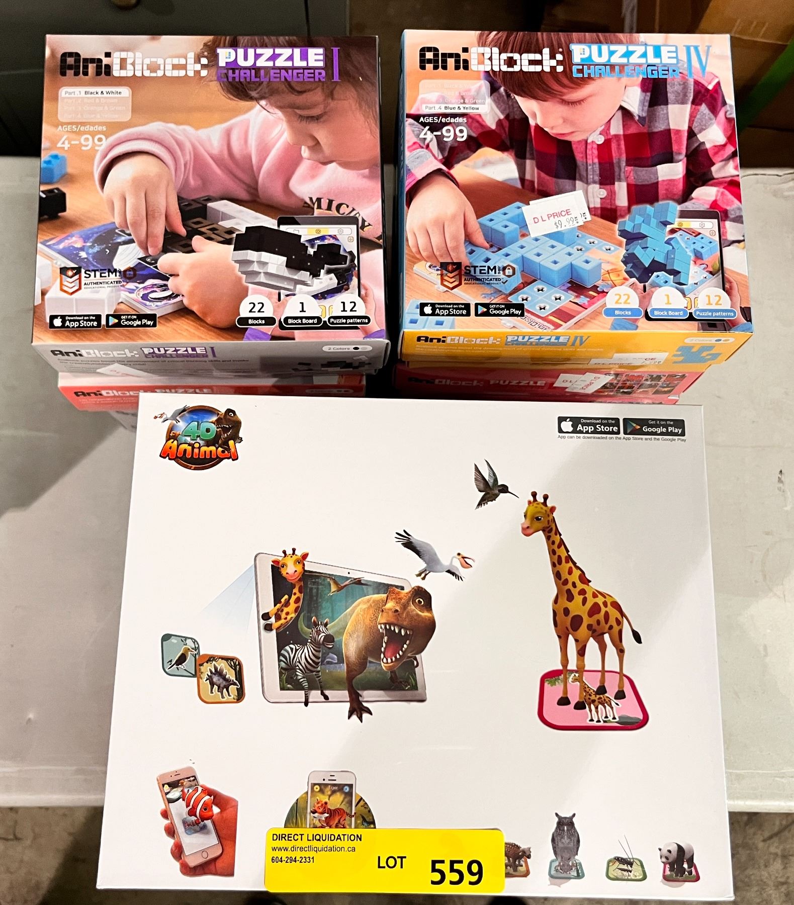 Group of kids toys including - ani block puzzles, 4D animal AR interactive kids toy, Flick Flack board game, etc...