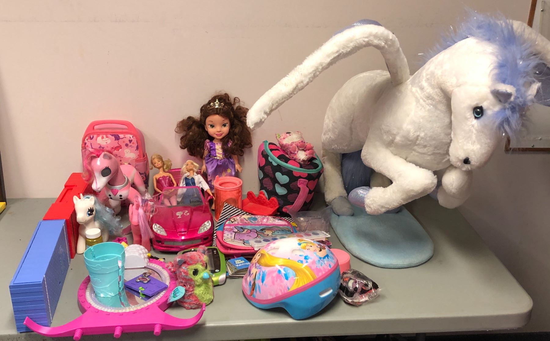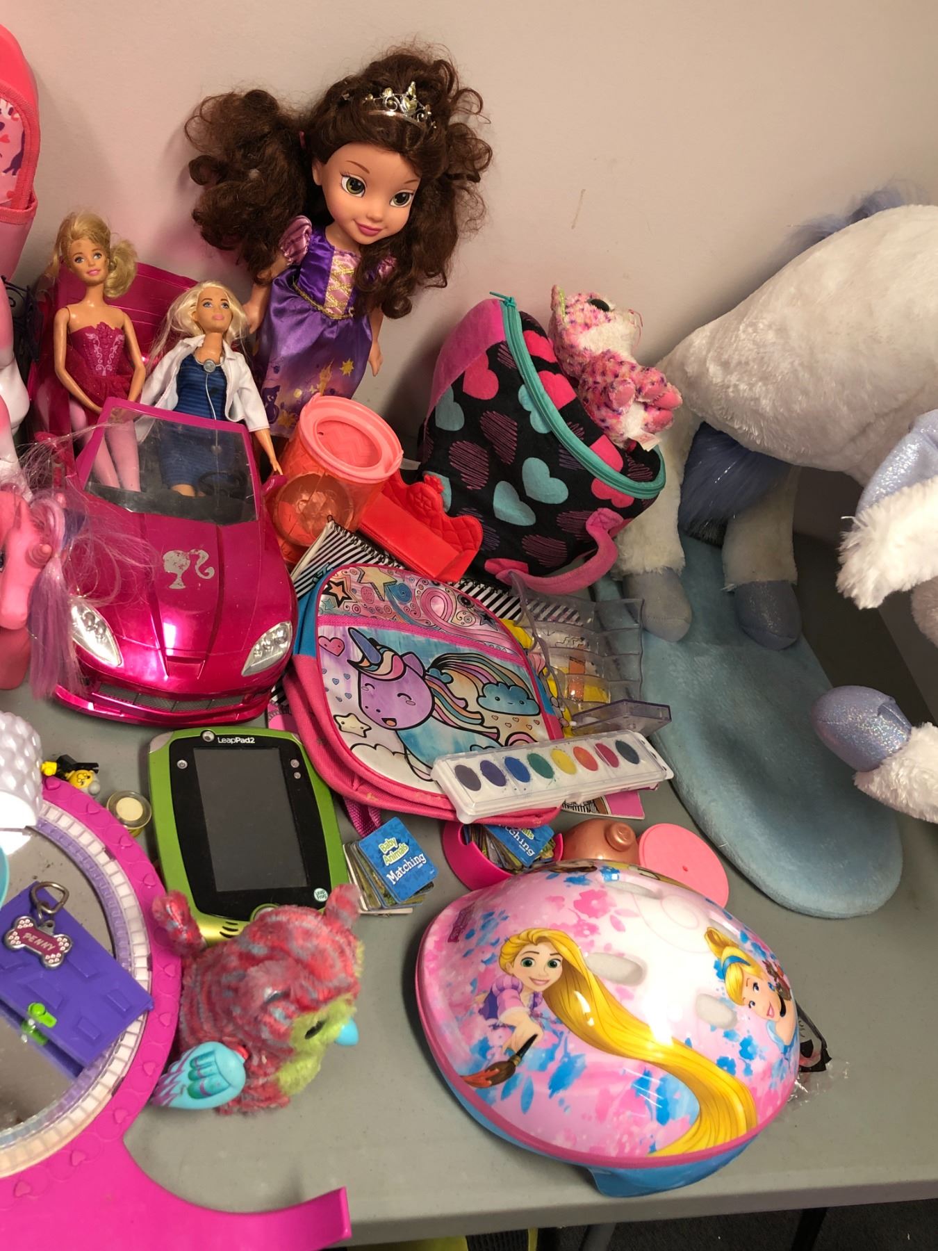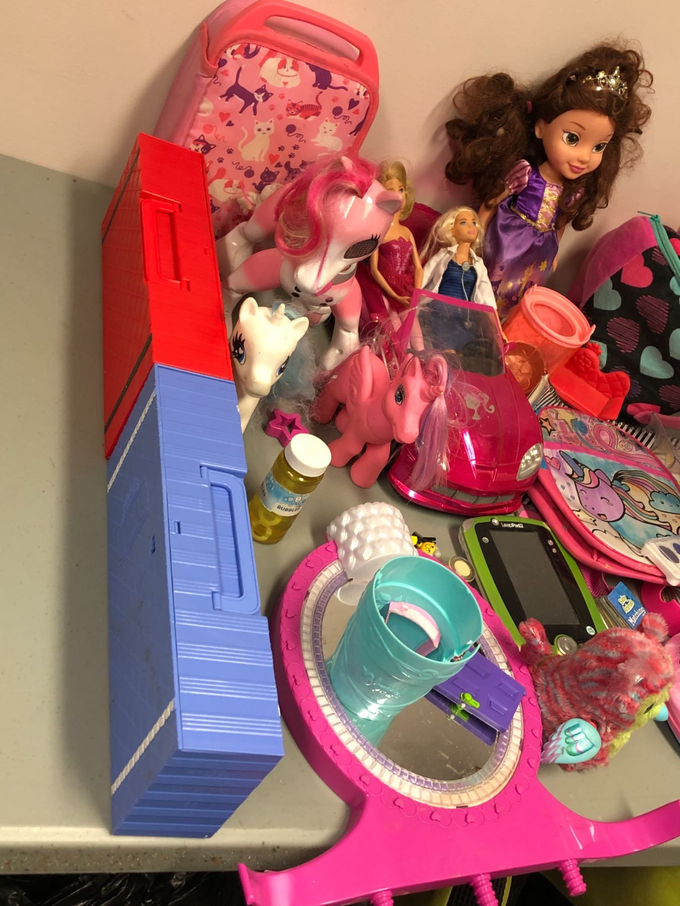 Group of kids toys including - barbies, my little pony, helmet, toy barbie car, etc...