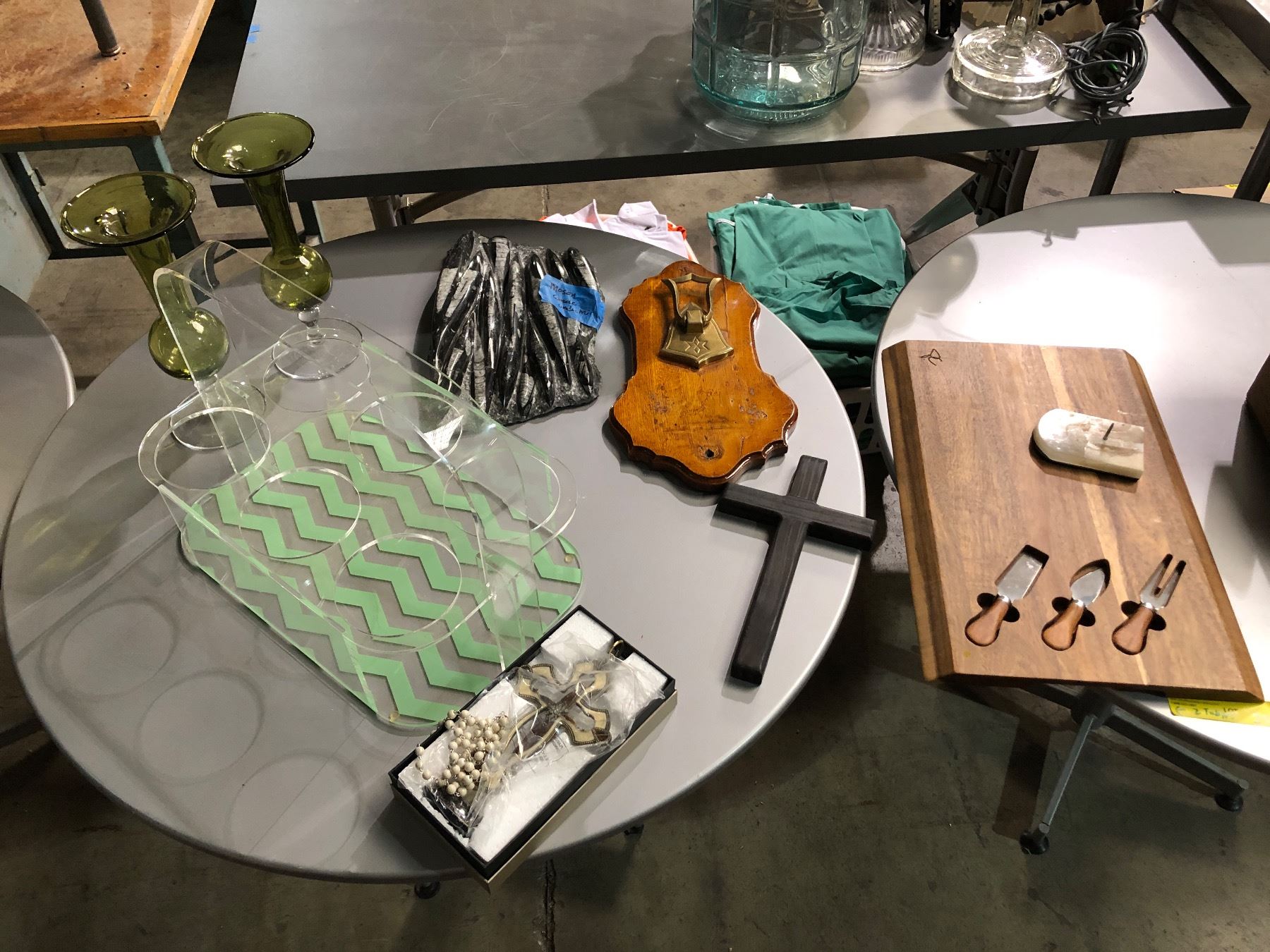 Group of misc. decor items including - crosses, coat hanger, charcuterie board with built-in utensils, jar holder, etc...