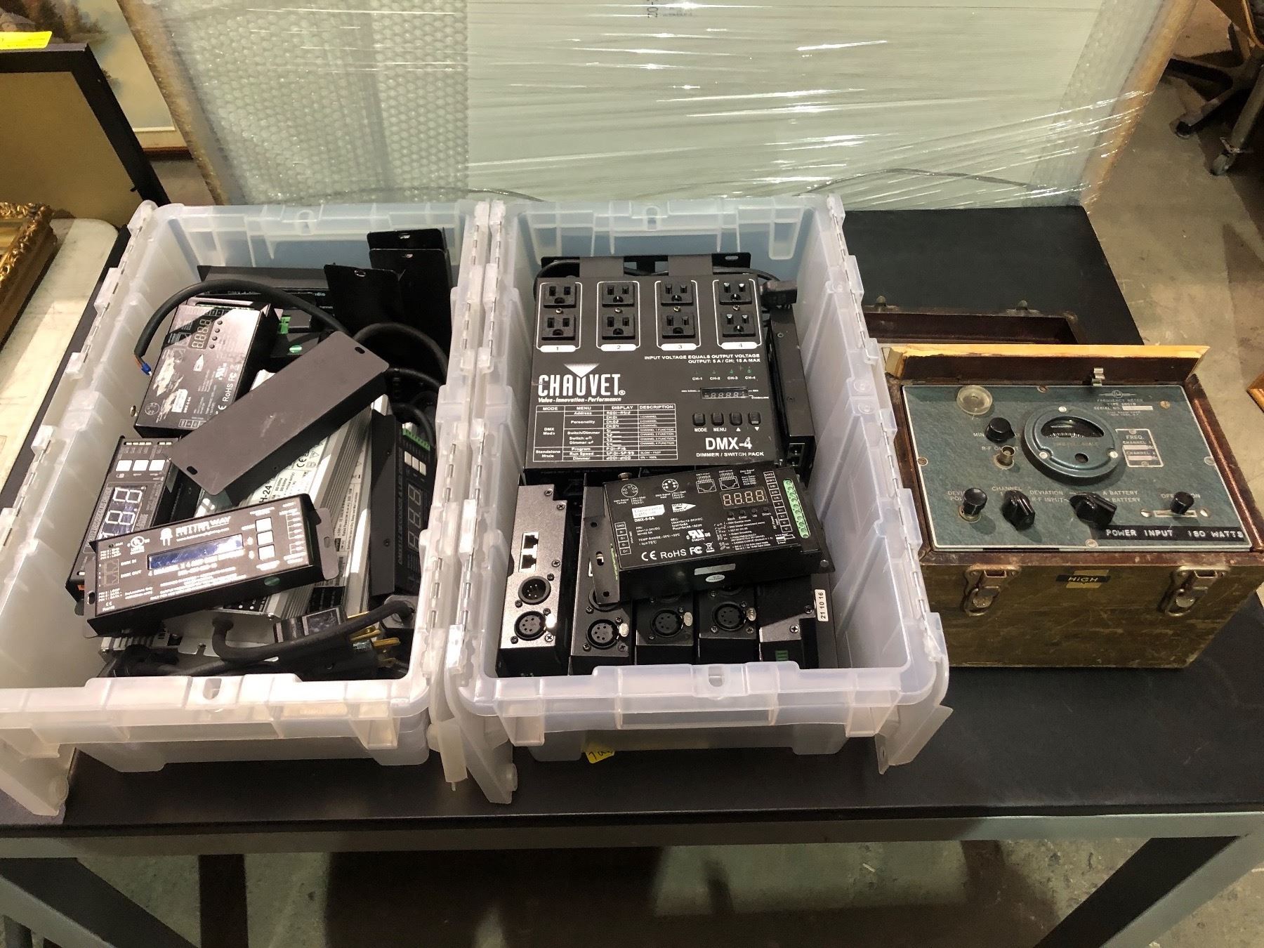 Group of misc electronics including - DMX-4 Dimmer switch, Prolux 5 channel dmx decoder, 4 channel x 4 amp dmx decoder, Vintage Westinghouse portable link frequency meter type 2051b wood box w/handle, etc...