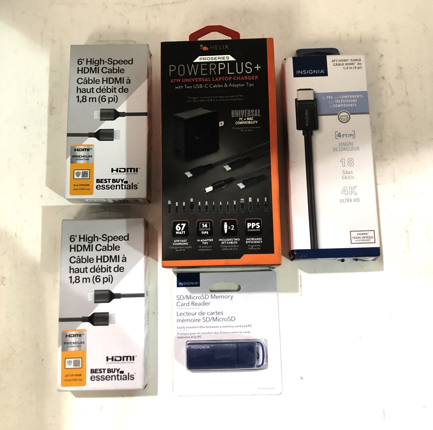 Group of misc electronics including - power plus + 67W universal laptop charger, 2x 6' High-speed HDMI, 4ft HDMI cable & SD/micro SD card reader