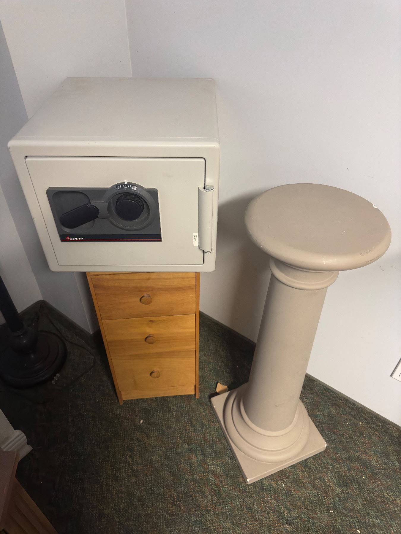 Group of misc including - Sentry safe, pillar, 3 tier sideboard, etc... (code or key for safe is missing)