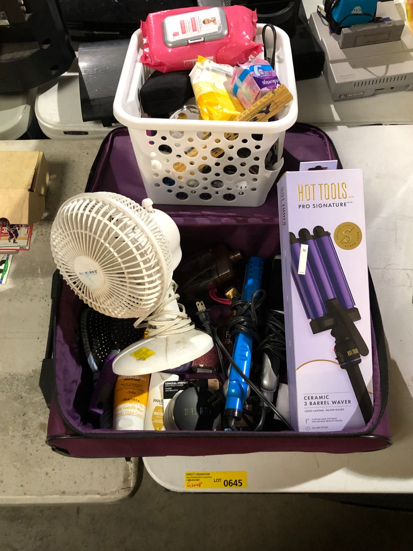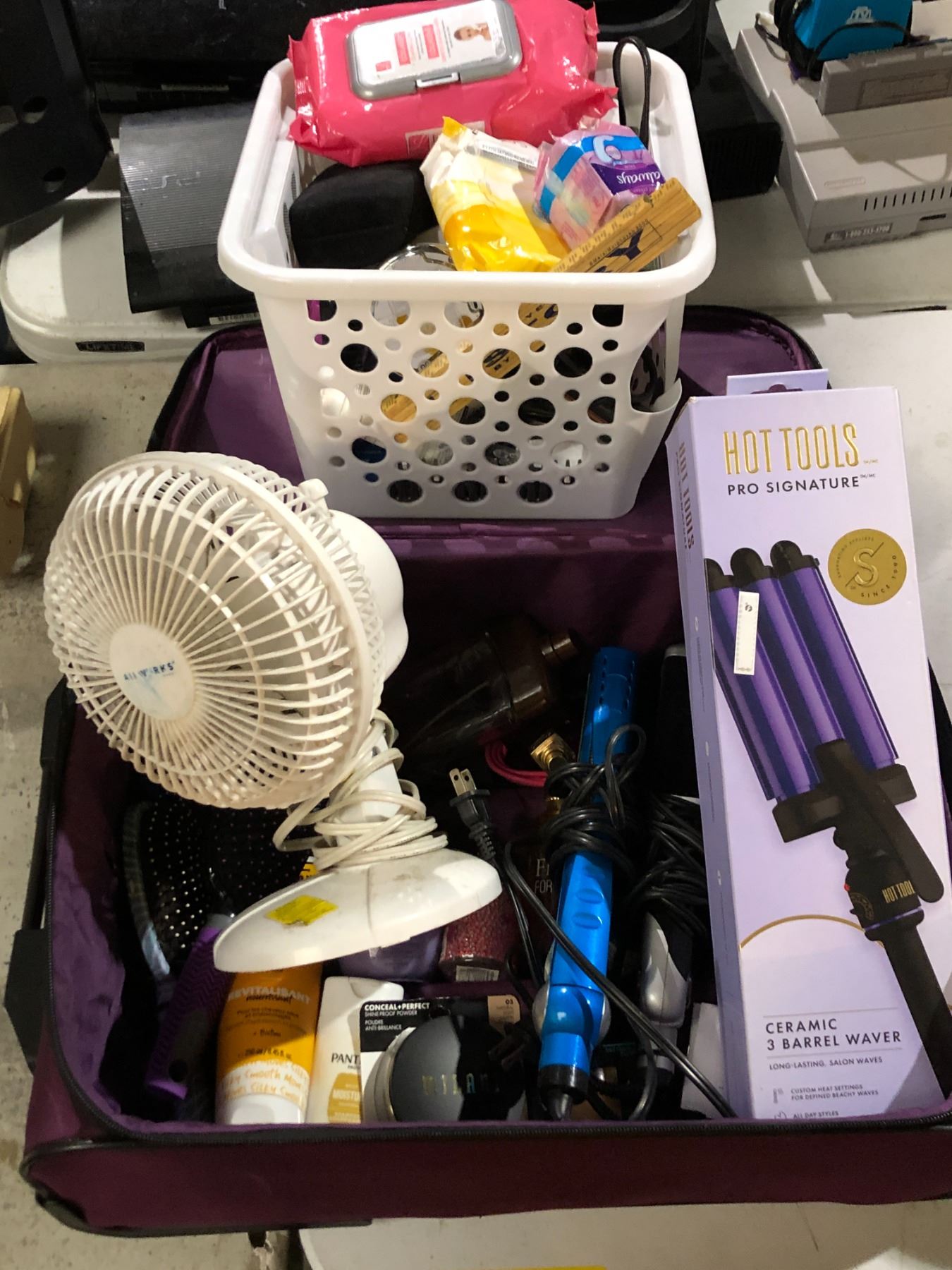 Group of misc including - fan, hair straighteners, hair brush, suitcase, etc...