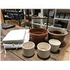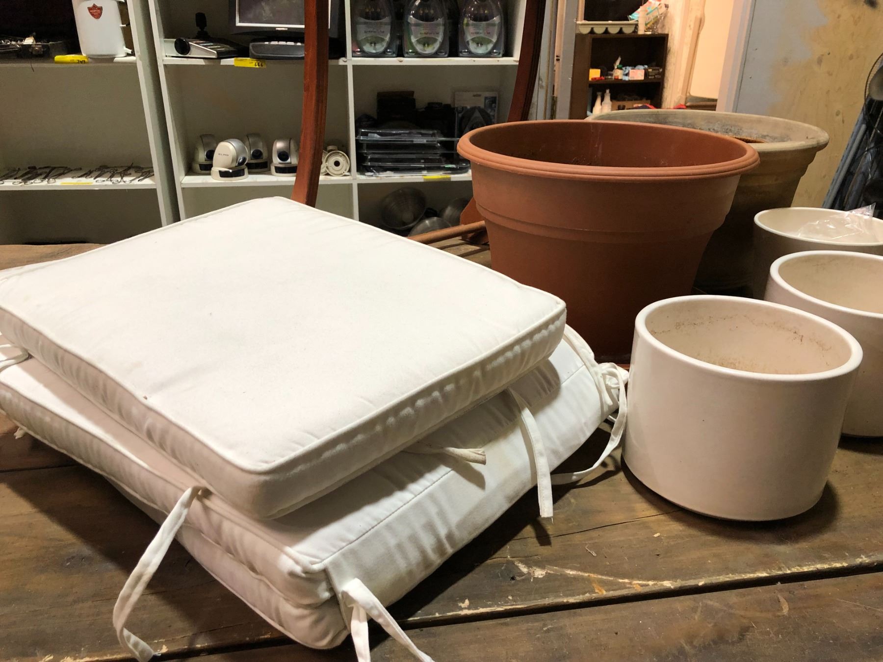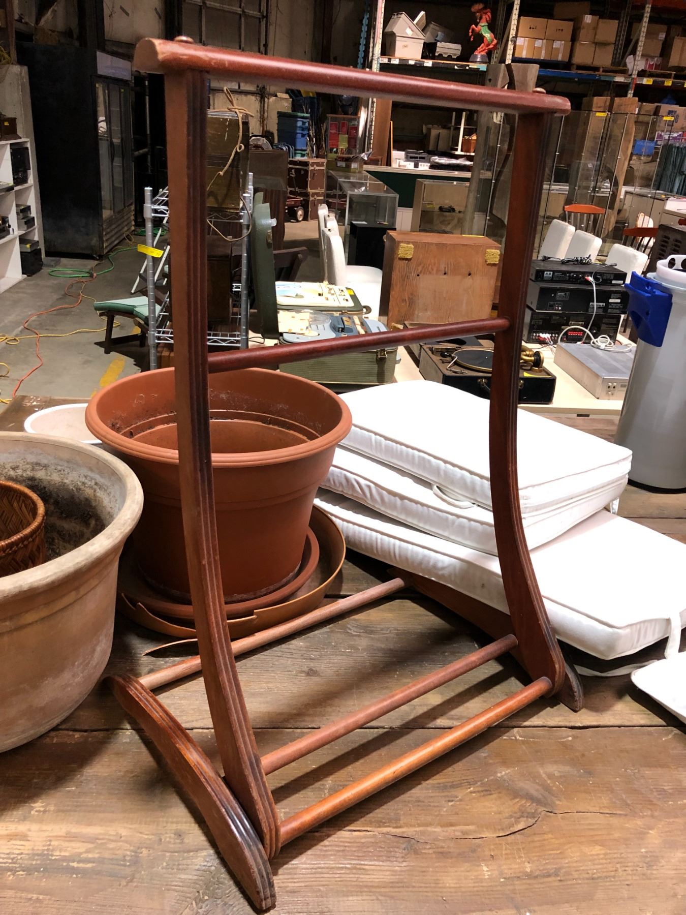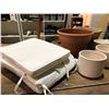 Group of misc. items - assorted planters/ wooden valet stand & white lawn lounger cushion