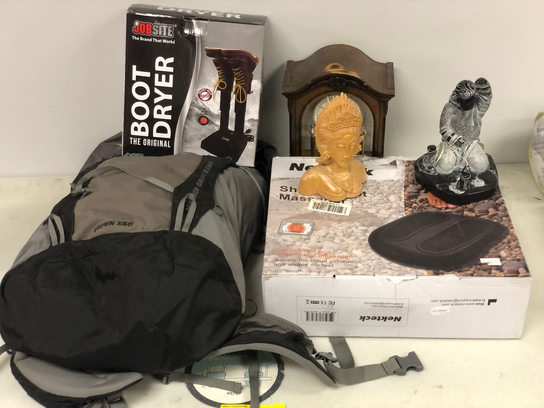 Group of misc. items - includes camping bag/ boot dryer/ Bulova table clock/ foot massager etc.