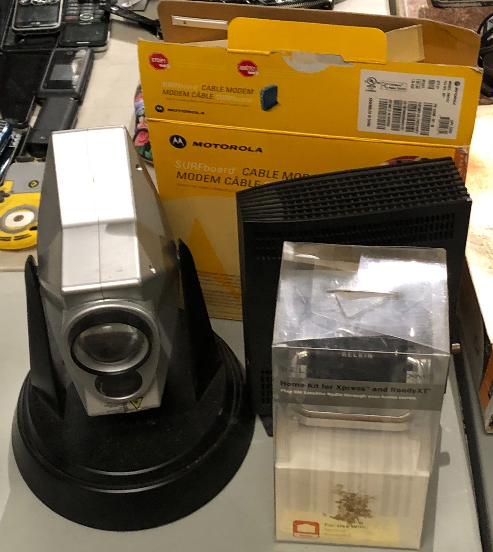 Group of misc items including - Homekit XM radio, wifi router, Motorola cable modem, display easel, etc...