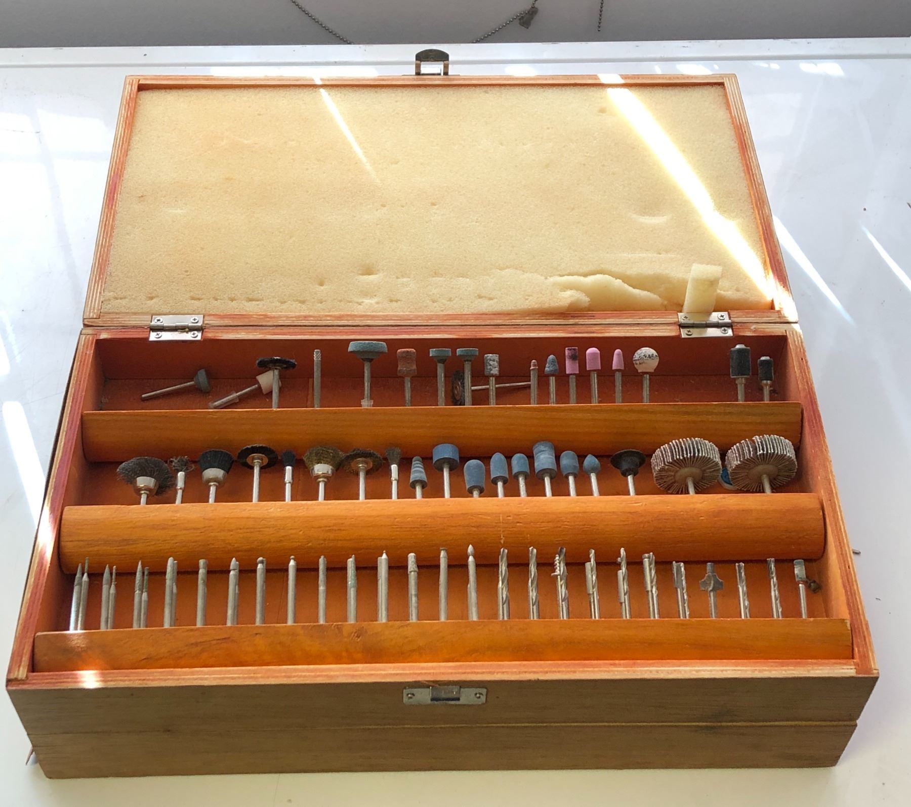 Group of misc items including - Rotary tool accessories wood chest, poker set, plates, cups, etc...