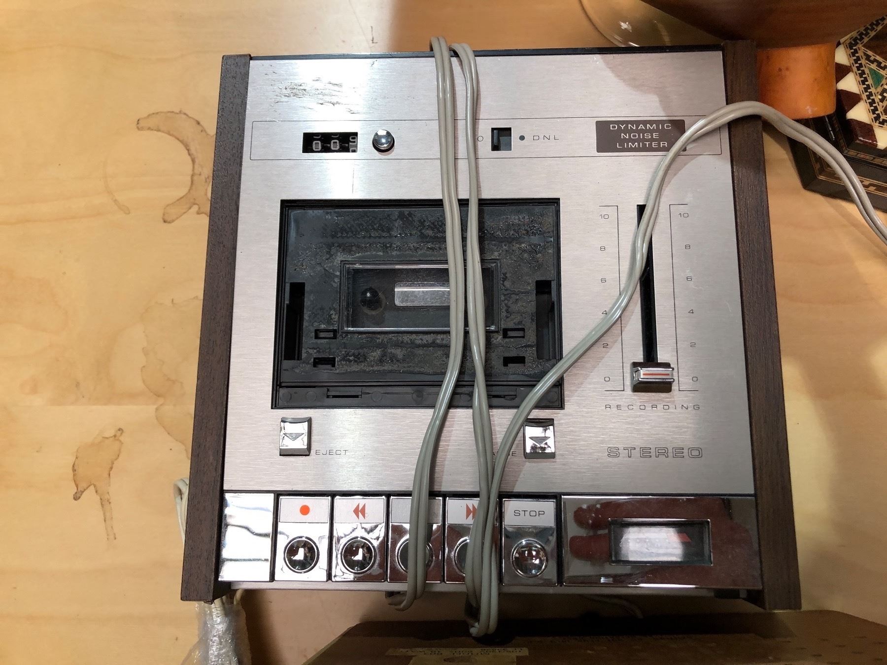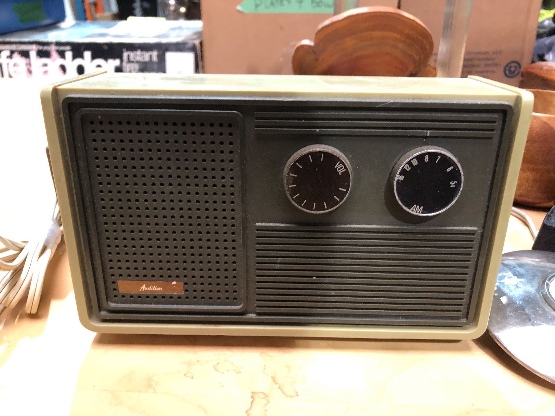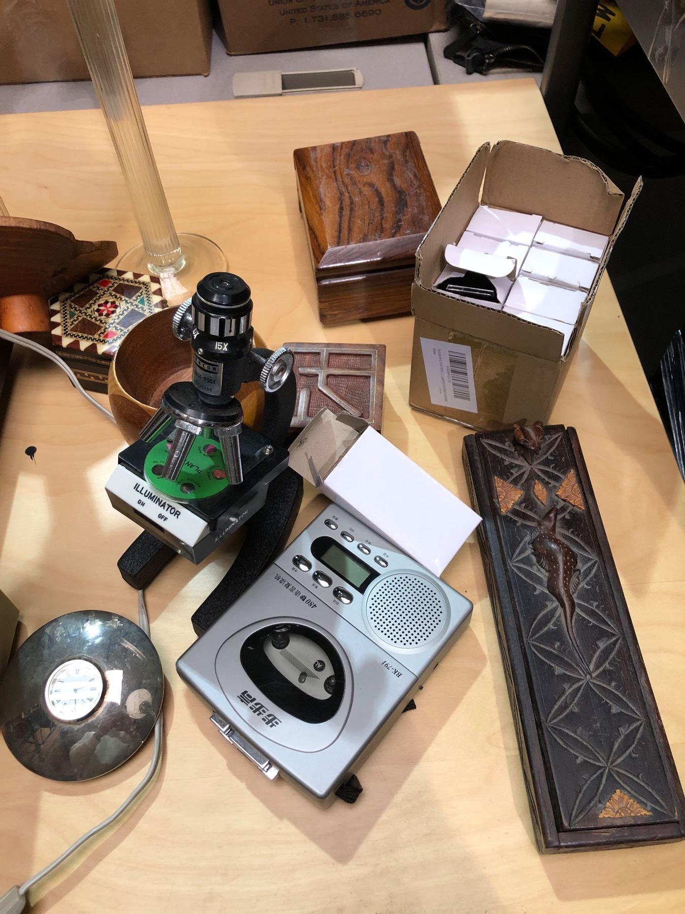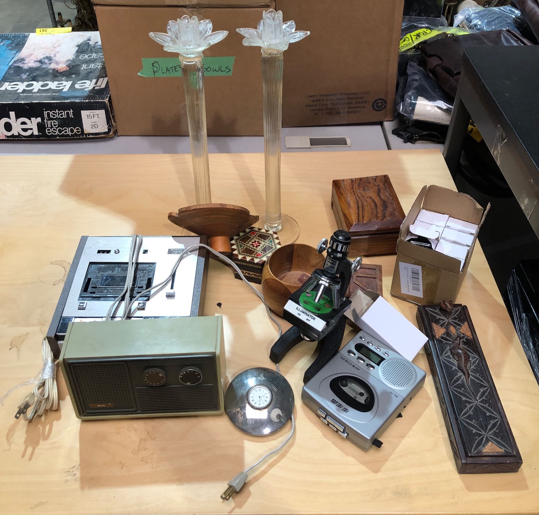 Group of misc. items including - decor, Audition radio, noise limiter, illuminator microscope, perfu